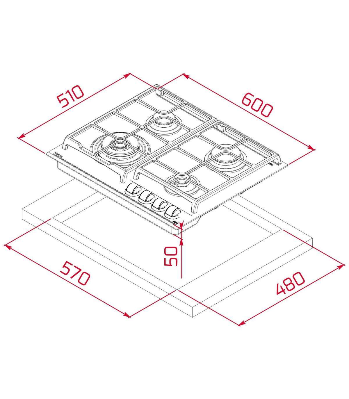 Gaasipõletite võimsused: 4000 W, 2800 W, 1750 W ning 1000 W.