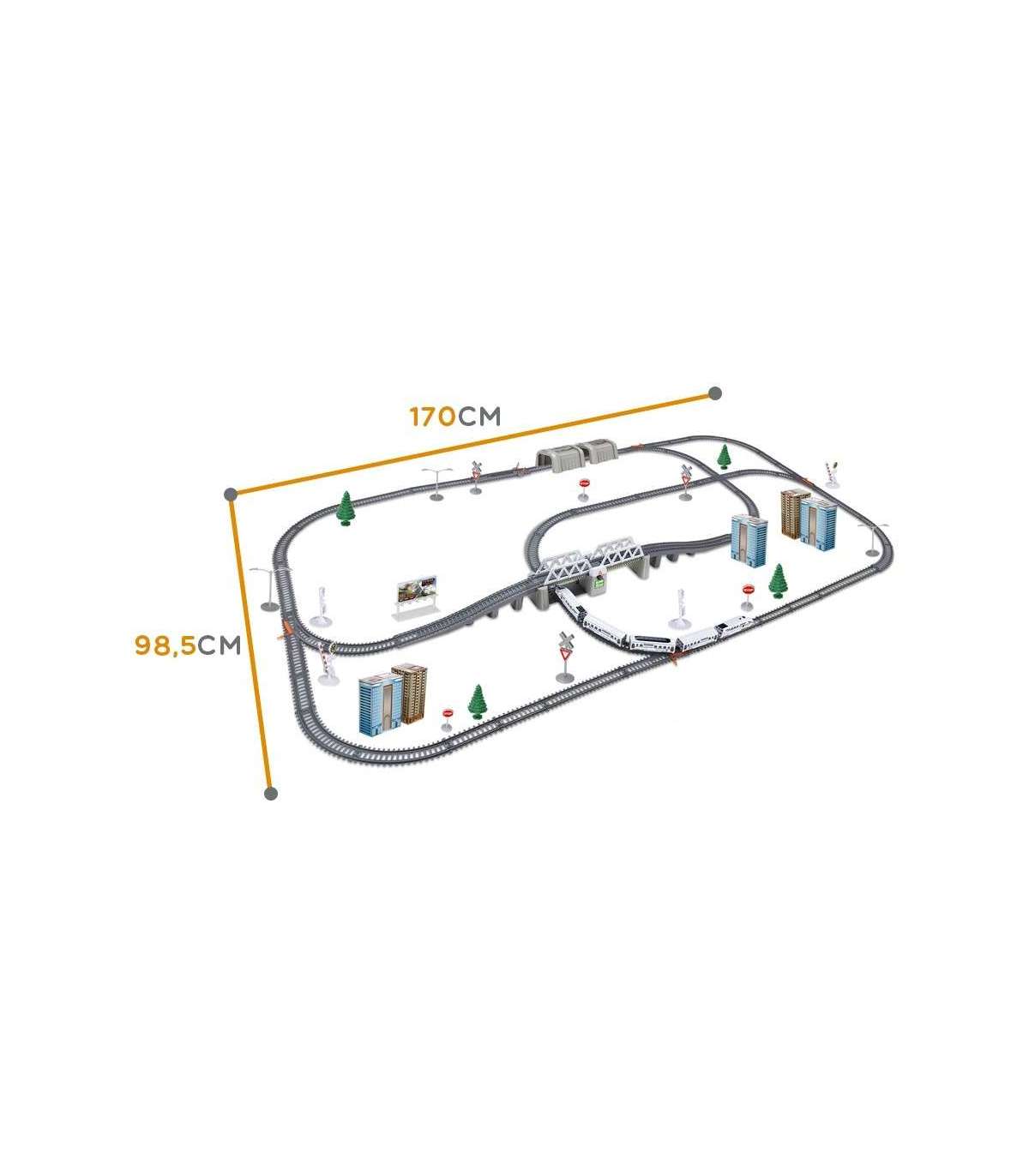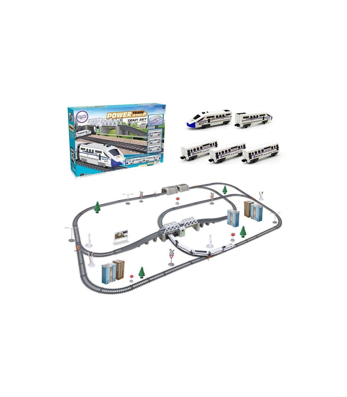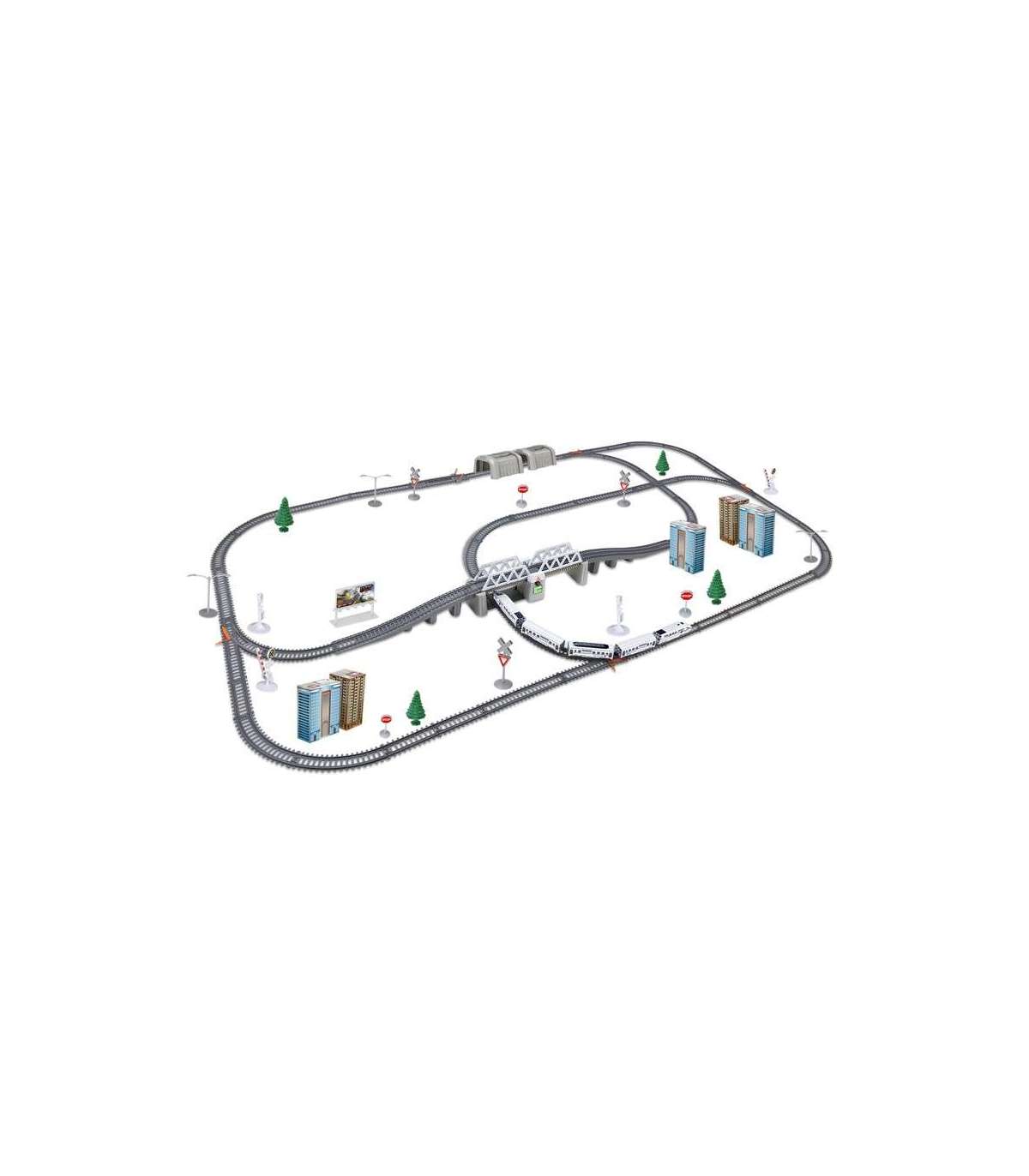 - - w skład zestawu wchodzi: pociąg Pendolino - 5-składowy, ruchomy, podnoszony most, tunel kolejowy, znaki, atrapy budynków mieszkalnych, szlabany, drzewka, latarnie,