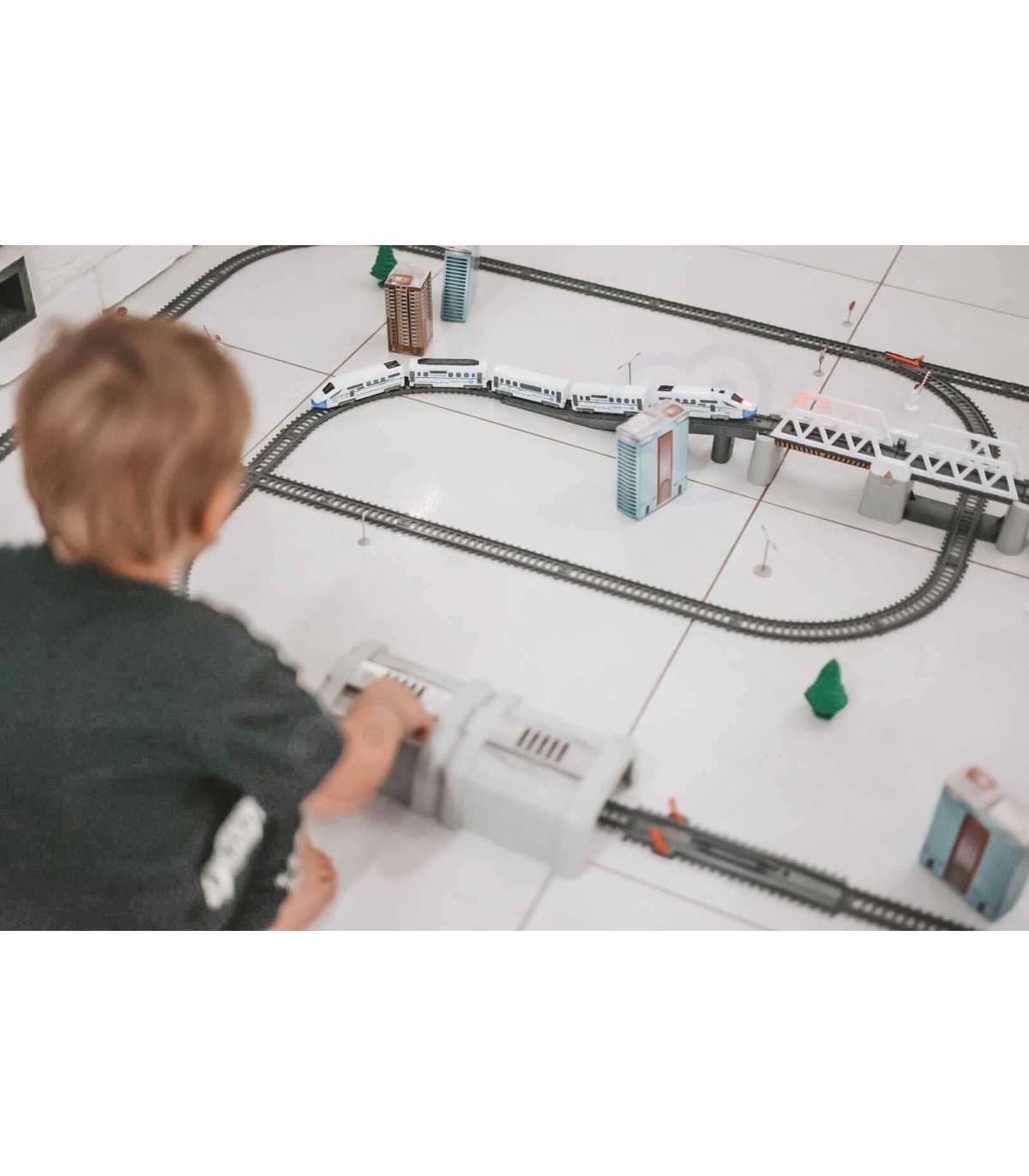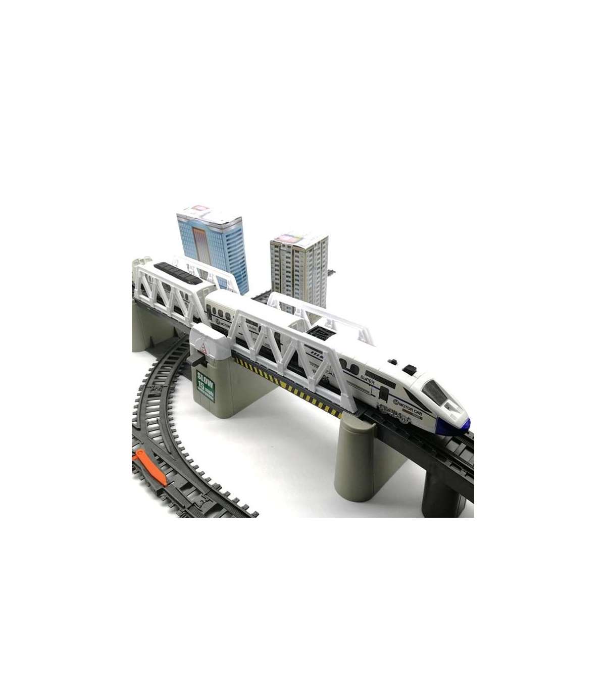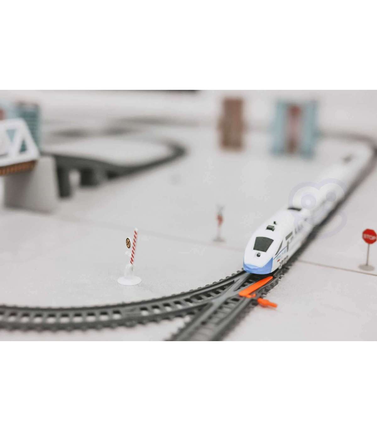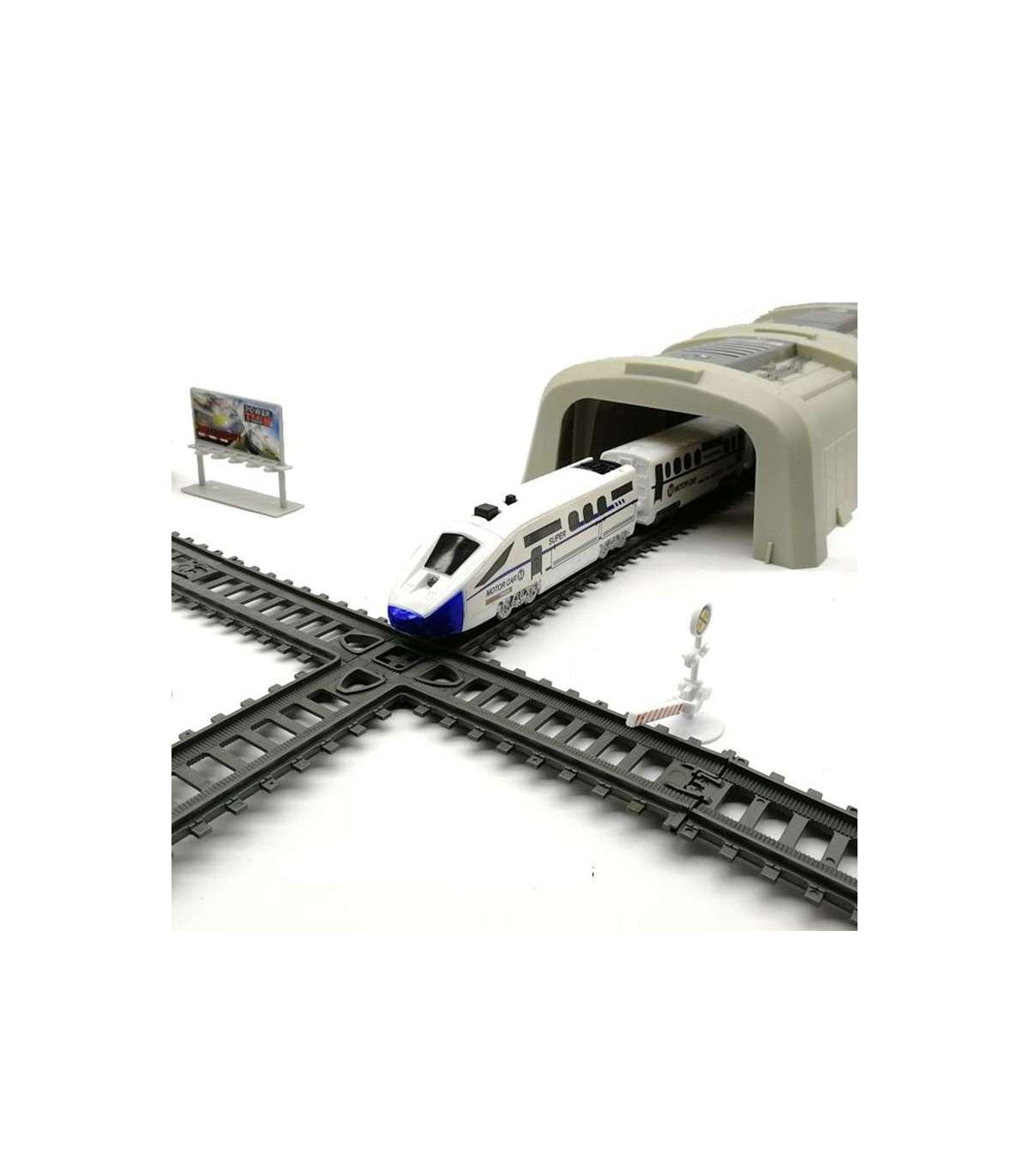- - w skład zestawu wchodzi: pociąg Pendolino - 5-składowy, ruchomy, podnoszony most, tunel kolejowy, znaki, atrapy budynków mieszkalnych, szlabany, drzewka, latarnie,
