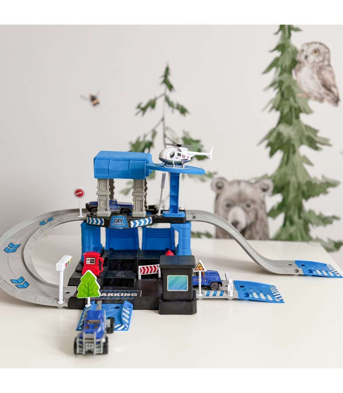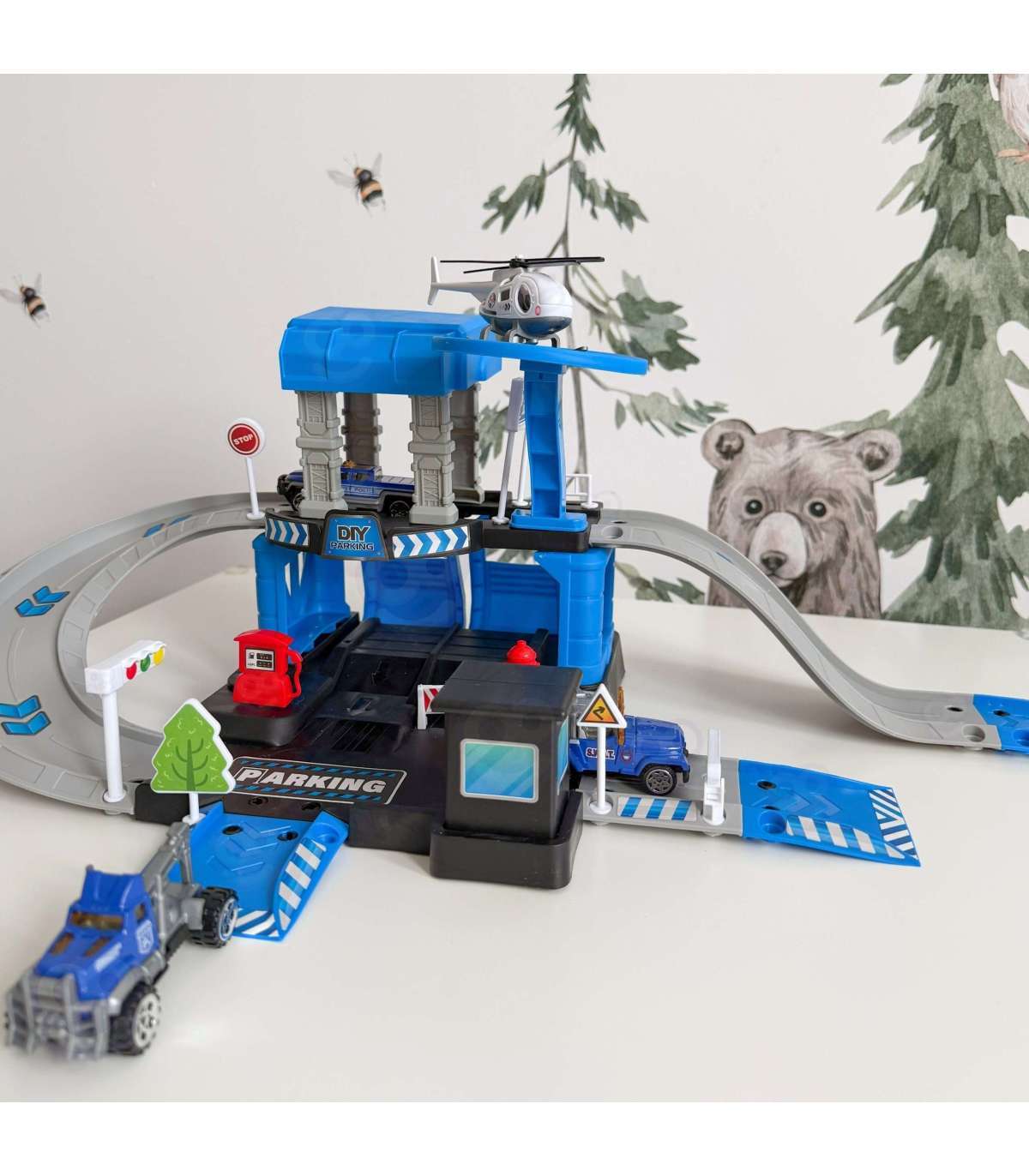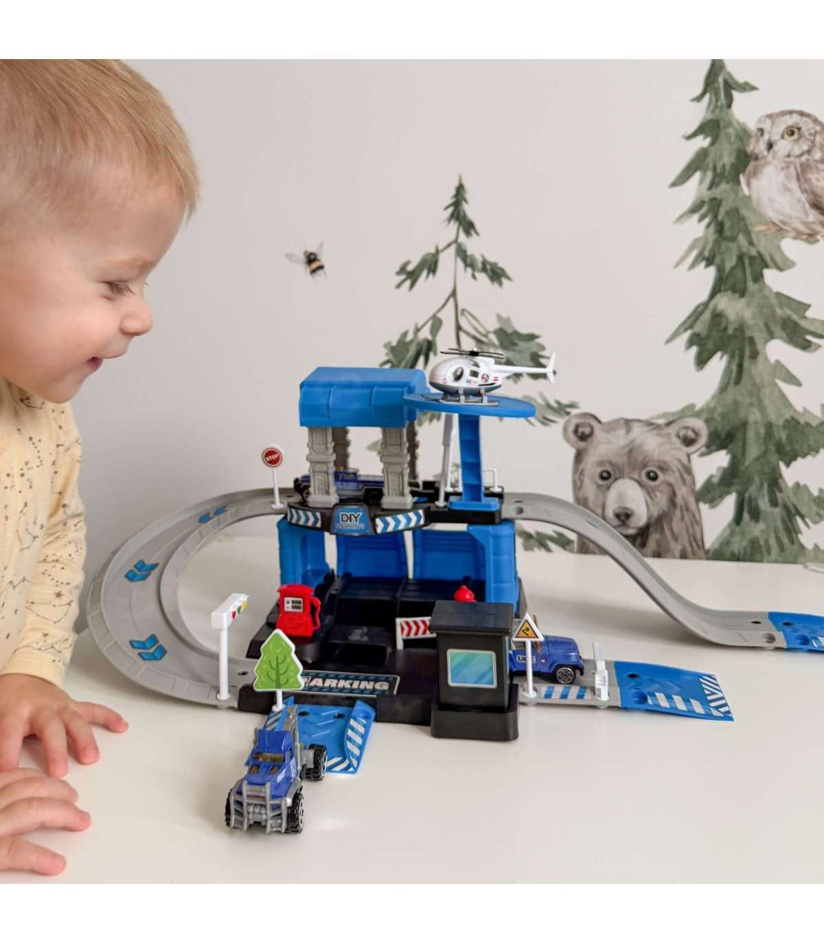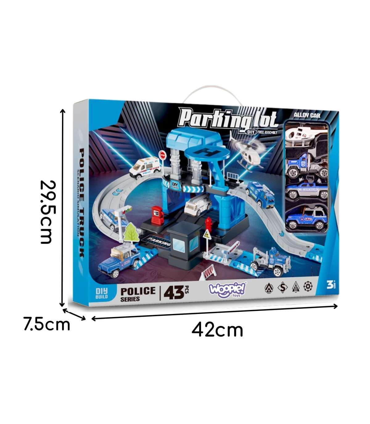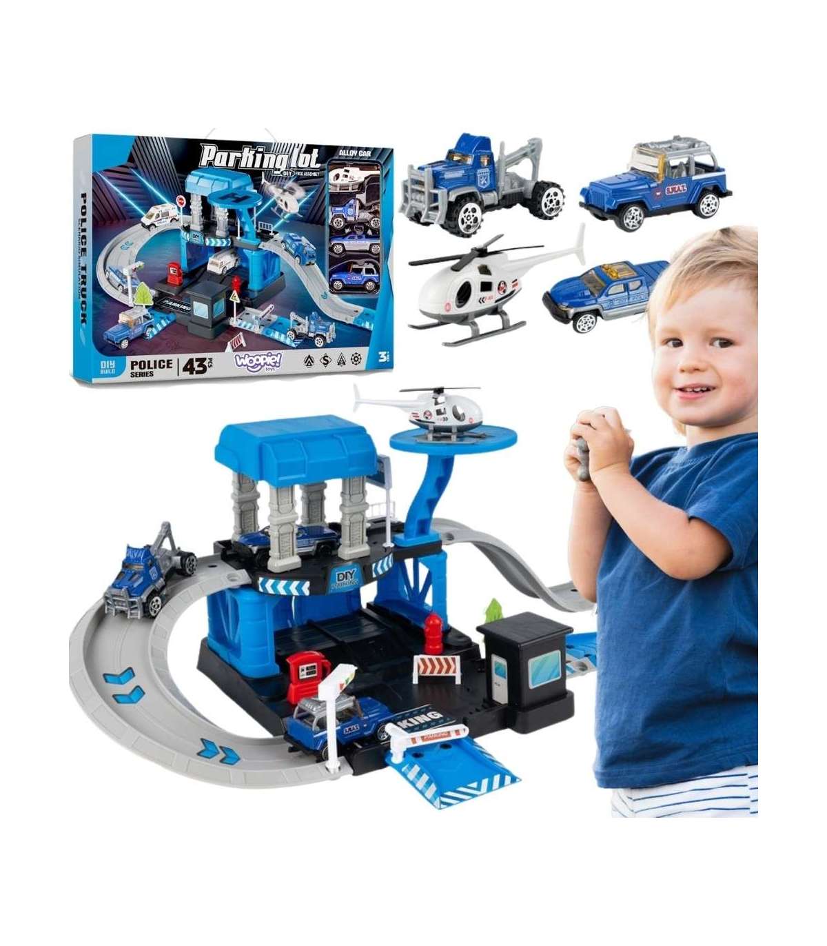 Parking policyjny od marki Woopie z akcesoriami i pojazdami to fantastyczny zestaw tematyczny dla każdego małego miłośnika motoryzacji i służb mundurowych! Zabawka zachwyca bogactwem detali, ilością elementów, żywą kolorystyką i wieloma możliwościami zabawy. Dwupoziomowy parking z rampami, lądowiskiem dla helikoptera i licznymi akcesoriami pozwala dziecku na tworzenie własnych scenariuszy zabawy, ograniczonymi tylko wyobraźnią. Trzy metalowe samochodziki i helikopter pozwolą wykorzystać każdą z funkcji garażu i pozwolą na zabawę w gronie rodzeństwa lub przyjaciół oraz wcielenie się w postać małego policjanta.