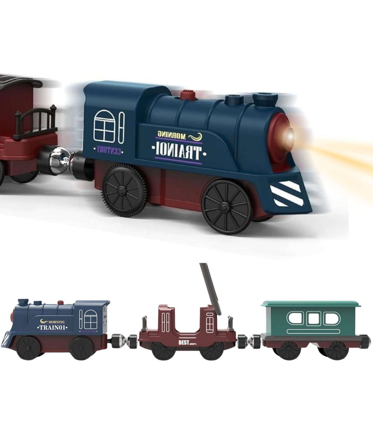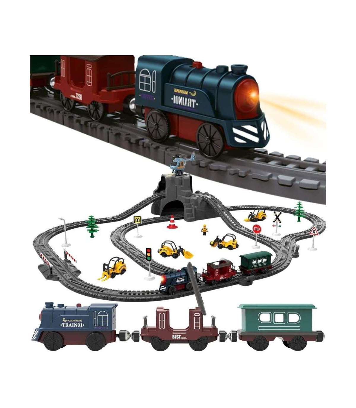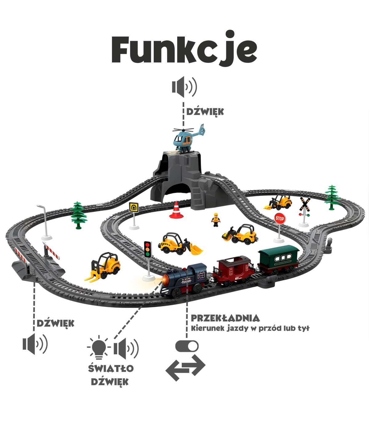 Kolejka porusza się po torach automatycznie – wystarczy włączyć silnik, by pociąg ruszył w podróż po całej trasie!