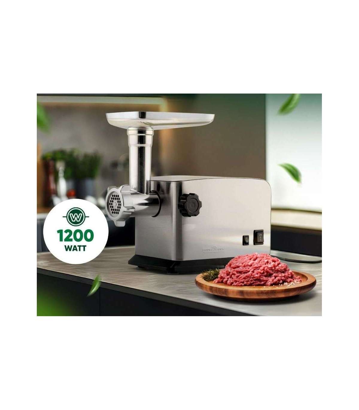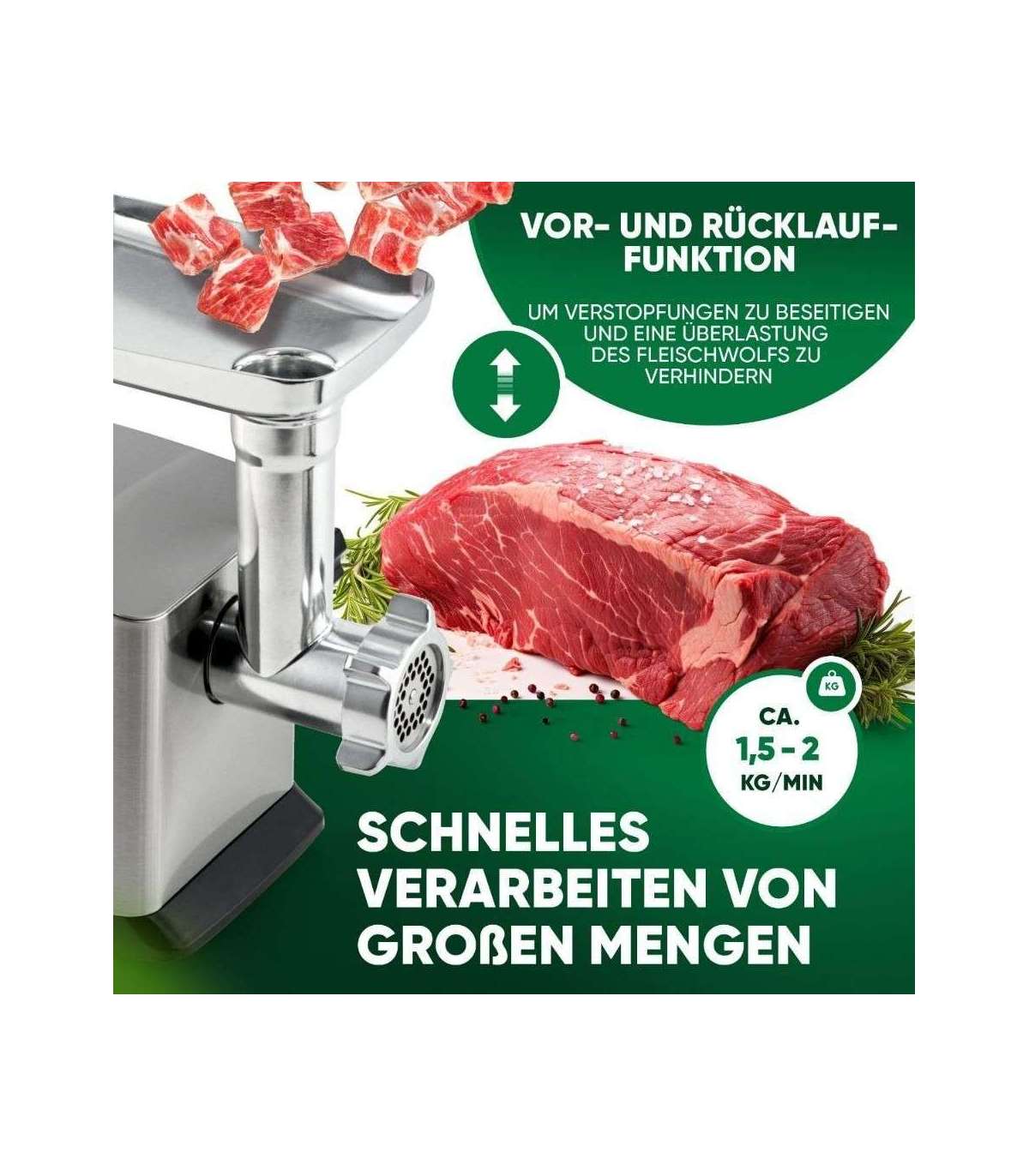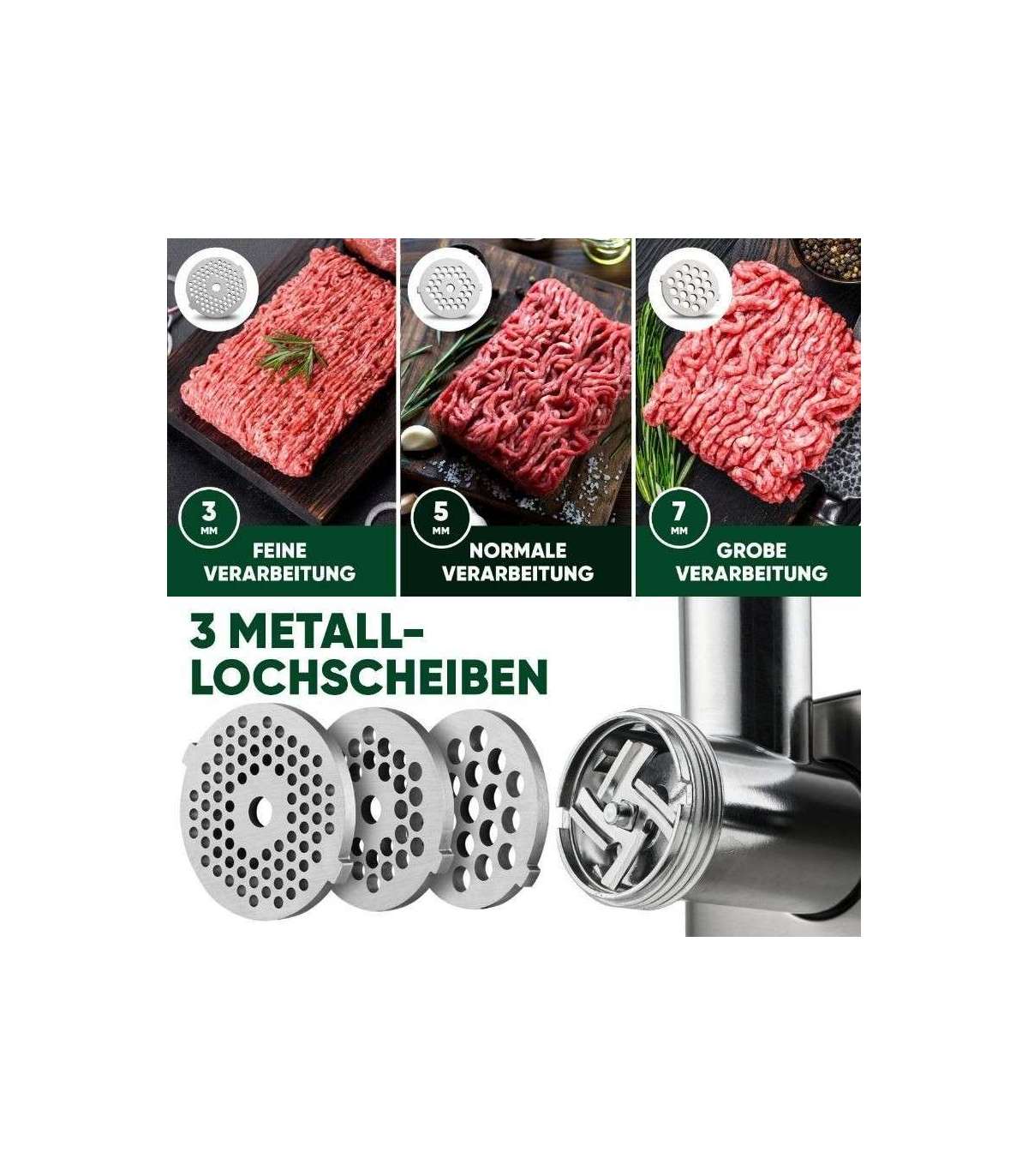 Masinaga on kaasas 3 metallist perforeeritud ketast (peen, keskmine, jäme) ja 4 teraga roostevabast terasest nuga hõlpsasti soovitud konsistentsi saavutamiseks. Lisaks sisaldab see kebabi-kinnitust idamaise köögi jaoks, küpsise/saiakinnitust maitsvate purukookide jaoks ja vorstitäite kinnitust.