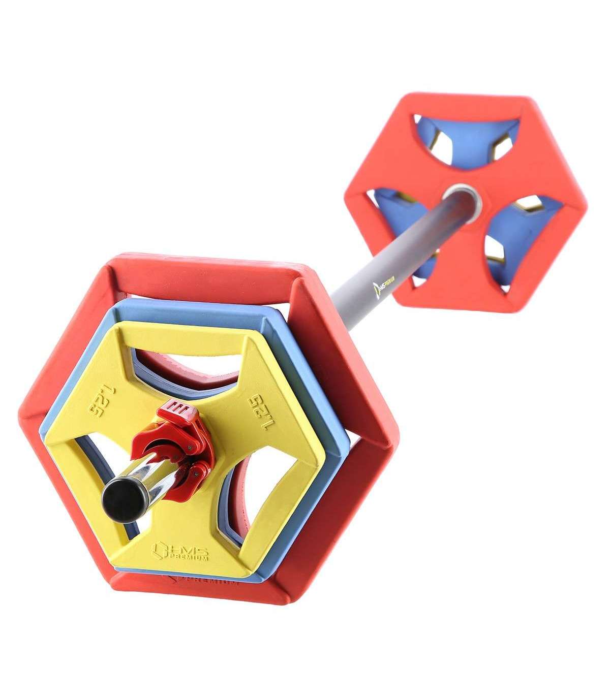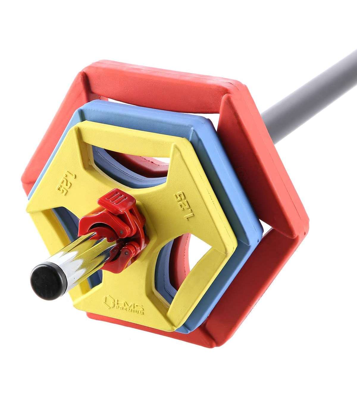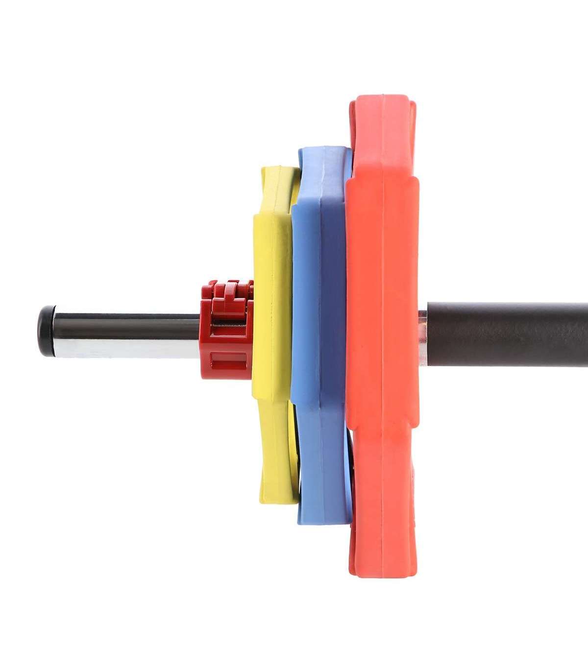 Komplekt koosneb kangist, 6 värvilisest kettast, mis on kaetud kummkattega, ja kahest kinnitusest. Kangi pikkus on 140 cm ja läbimõõt 30 mm. See on valmistatud vastupidavast kromitud terasest, mille kulumiskindlus on suurenenud.