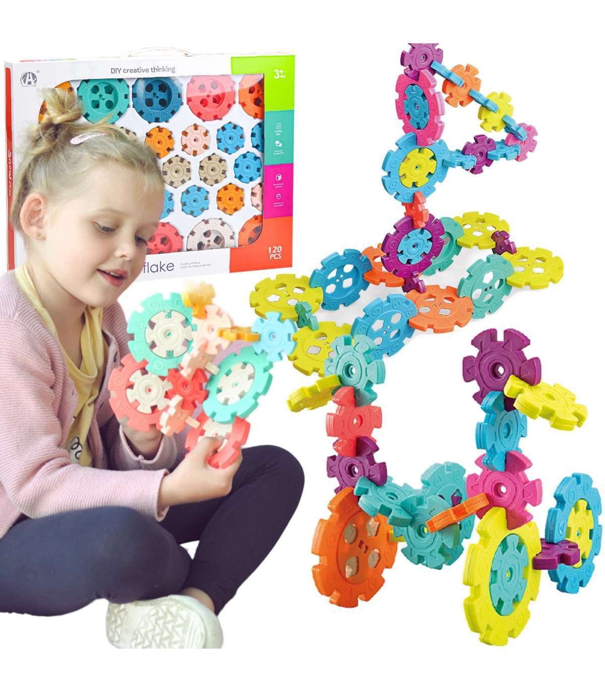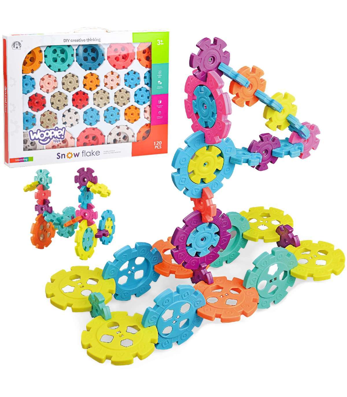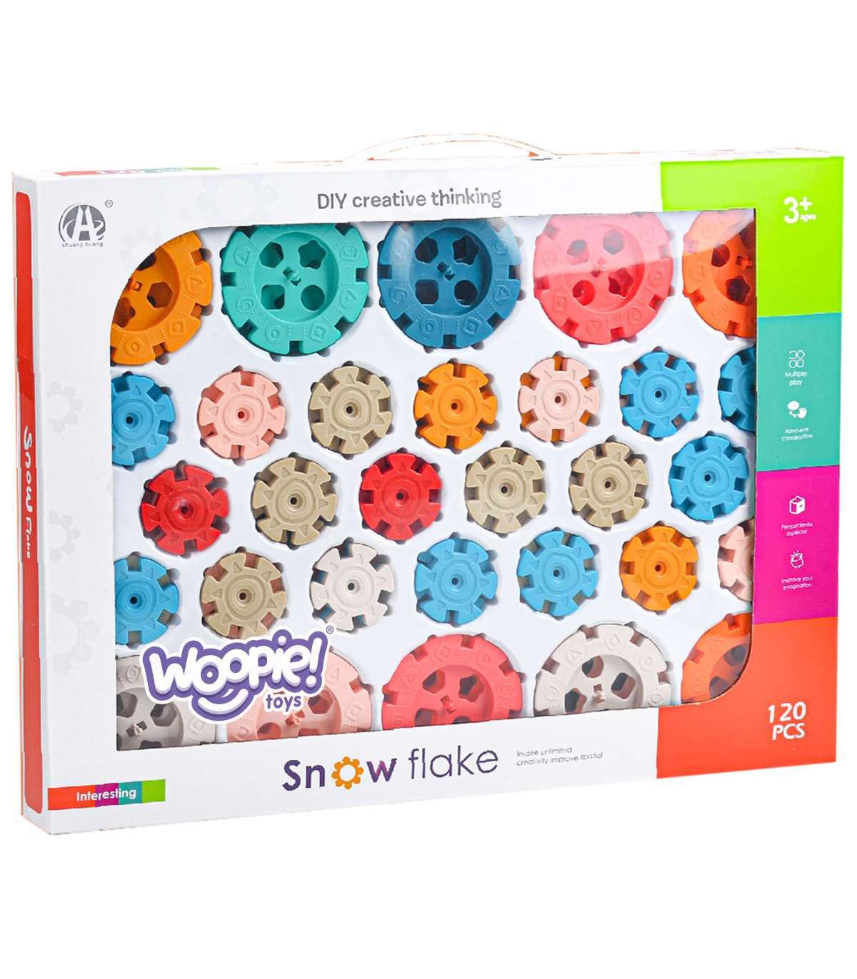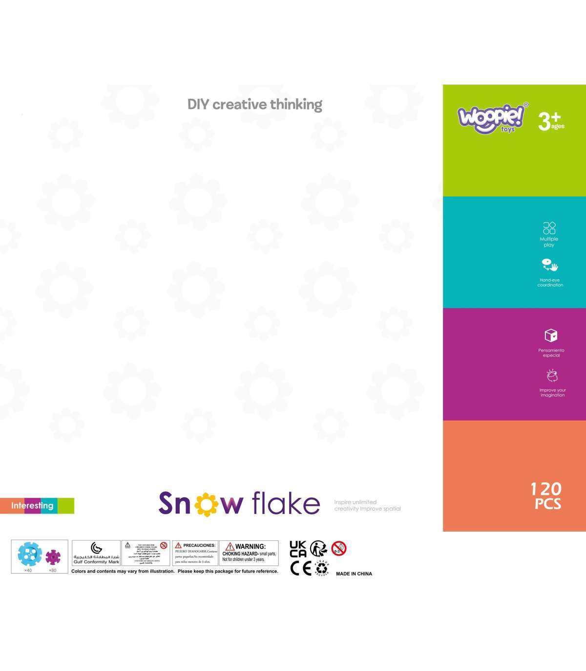 Klocki Konstrukcyjne Wafle od marki WOOPIE zwrócą uwagę i zafascynują Twoje dziecko. Kolorowe elementy przypominają wyglądem płatki śniegu. Klocki w bardzo łatwy sposób łączą się ze sobą, a ze względu na swoją budowę i sposób łączenia można z nich tworzyć ciekawe trójwymiarowe konstrukcje. Zastosowane otwory w śnieżynkach pozwalają na łączenie ich pod skosem, a nie tylko prostopadle. Zestaw zawiera 120 elementów: w tym 40 dużych i 80 małych klocków. Samo budowanie konstrukcji rozwinie u dziecka logiczne myślenie, wyobraźnie, kreatywność oraz pomoże mu się skoncentrować podczas tworzenia. Przez układanie klocków dziecko poznaje kształty i kolory oraz ćwiczy zdolności manualne tzw. motorykę małą.