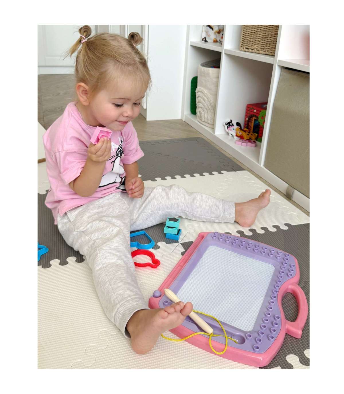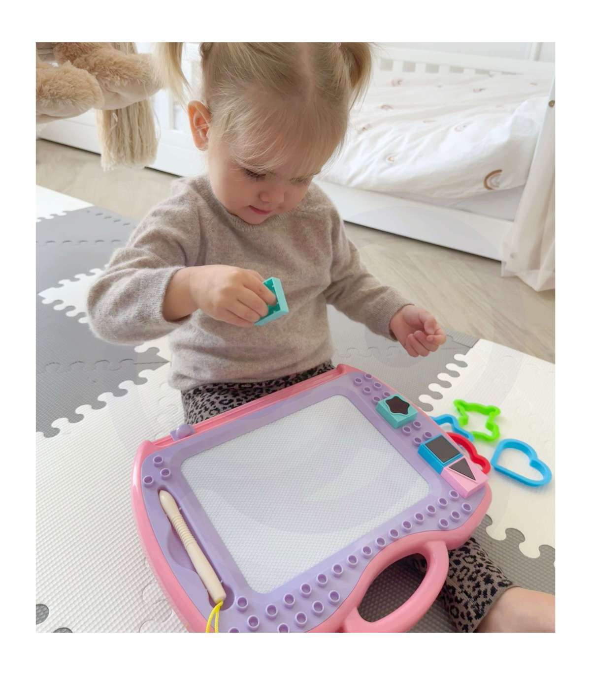 Znikopis Tablica Magnetyczna daje możliwość kreatywnej zabawy na długi czas! Tablica zachęca do pisania i rysowania. Rysowanie pozwoli skoncentrować, wyciszyć i uspokoić Twoje dziecko. Znikopis pozwala na tworzenie nieskończonej ilość obrazków – wystarczy przejechać specjalnym suwakiem, a rysunek zniknie i można rysować od nowa! Zestaw dodatkowo zawiera wygodny magiczny długopis, 4 stempelki oraz 4 wzory, które urozmaicą dzieło. Tablica posiada wygodny uchwyt, dzięki czemu dziecko może zabrać ją wszędzie. Znikopis rozwinie u dziecka zdolności manualne, wyobraźnie, kreatywność oraz da szansę na rozwinięcie artystycznej strony dziecka!