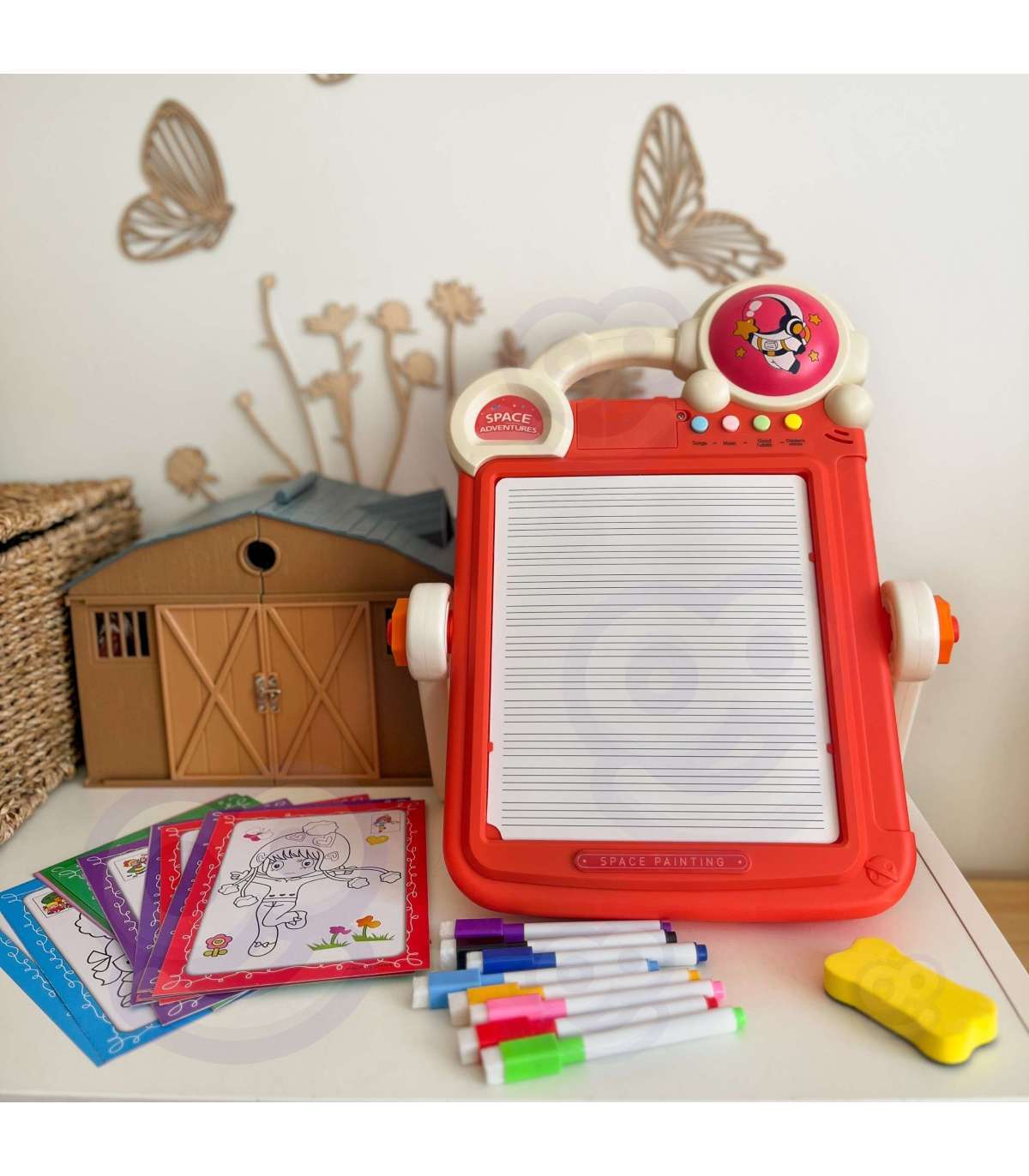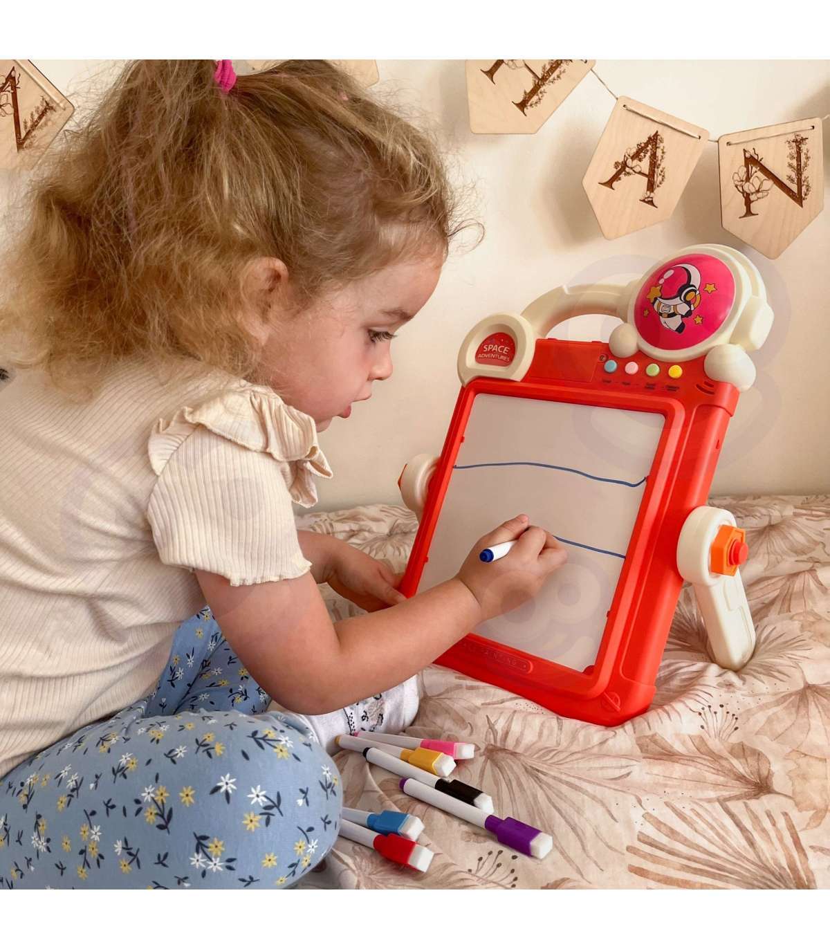 Szukasz zabawki, która będzie nie tylko bawić, ale również uczyć? Oto wyjątkowa edukacyjna tablica 2w1 marki WOOPIE – kreatywne centrum zabawy dla dzieci. Zabawka łączy funkcję tablicy do rysowania kolorowymi pisakami oraz planszy do układania klocków typu Tetris. Tablica do rysowania zawiera 8 flamastrów, gąbkę do zmazywania oraz 18 dwustronnych zmazywalnych kart do kolorowania lub pisania. Druga strona tablicy to zabawna układanka Tetris która zaciekawi każde dziecko, rozwinie wyobraźnię i kreatywne myślenie. Kolorowe klocki można układać pionowo lub na płasko tworząc ciekawe figury i obrazki lub oddzielne budowle 3D. Zabawę umilą 4 wbudowane przyciski z muzyką. Analogiczny zegar na obudowie pomoże z nauką odczytywania godziny.