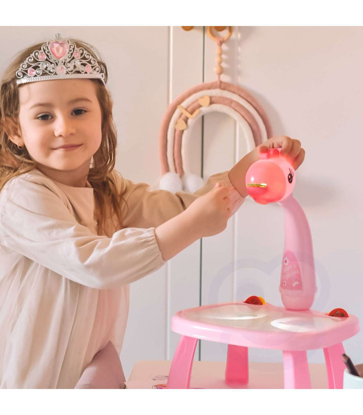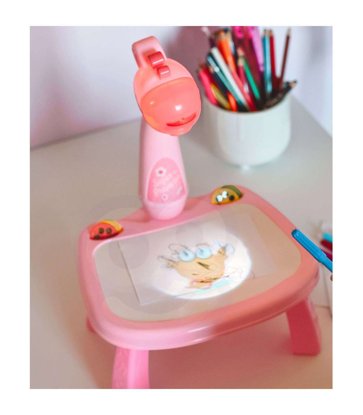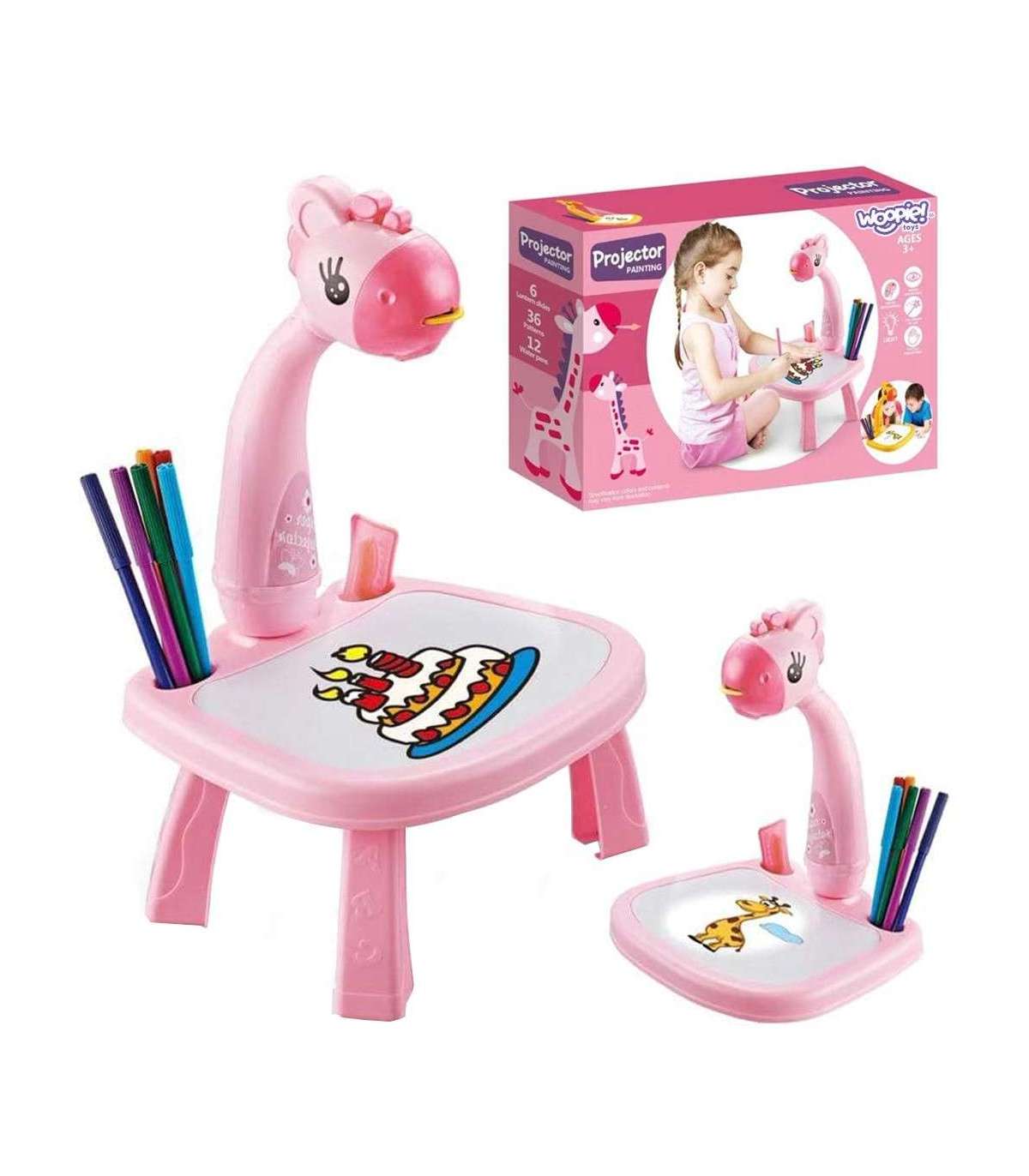 Rozbudź wyobraźnię swojego dziecka z uroczym projektorem do rysowania marki Woopie! To kolorowy i interaktywny stolik w kształcie żyrafy wyposażony w projektor oraz tablicę suchościeralną wbudowaną w blat. Stolik wyświetla kolorowe obrazki, a dziecko odrysowuje je na kartce lub na tablicy. Lekka konstrukcja, bajkowy wygląd oraz dołączone mazaki i wzory sprawiają, że rysowanie staje się ulubioną zabawą każdego malucha.
