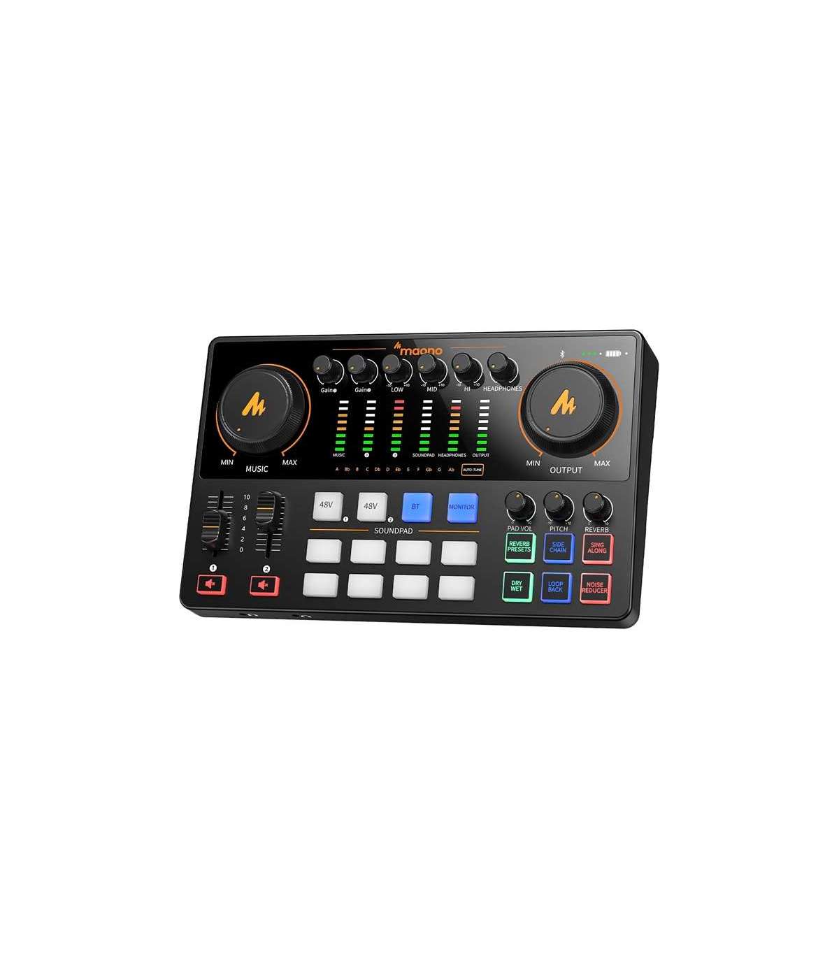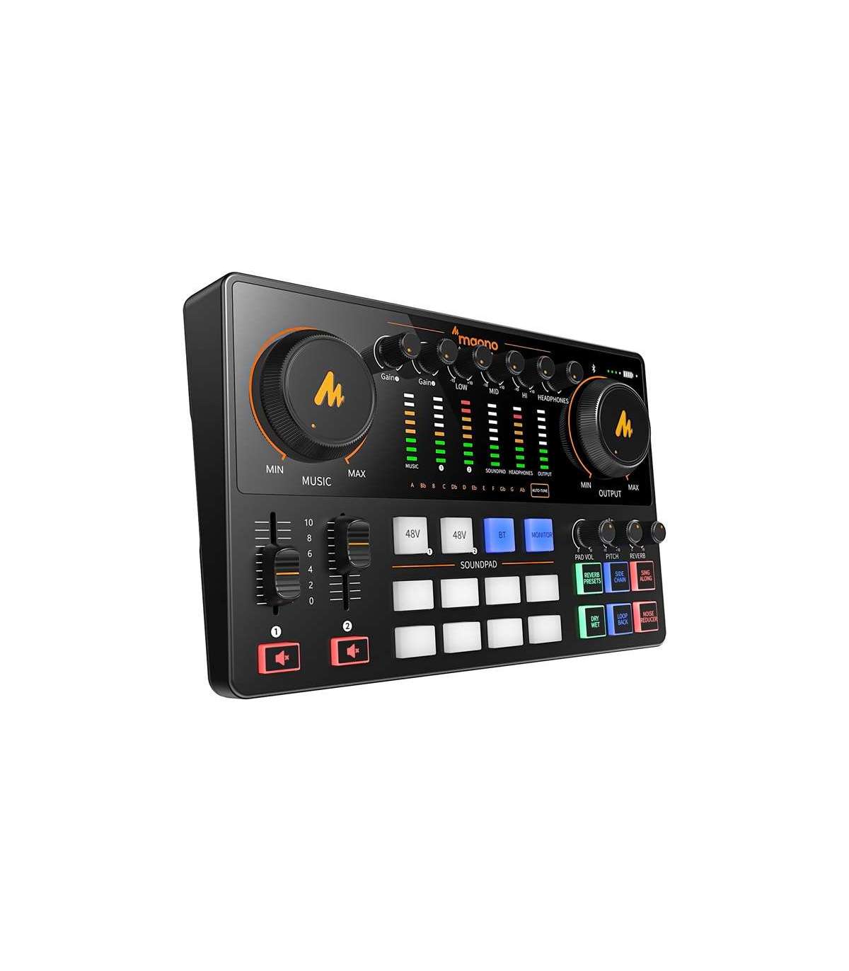 The Maono E2 GEN2 works with Windows, macOS, Android and iOS (adapter required for Apple devices under iPhone 15). It easily connects to platforms such as YouTube, Twitch, Zoom, TikTok and Spotify. The rear panel features USB-C, AUX IN, MONITOR SPK ports, streaming outputs, and microphone and instrument (Hi-Z) inputs, making it a true home studio center.