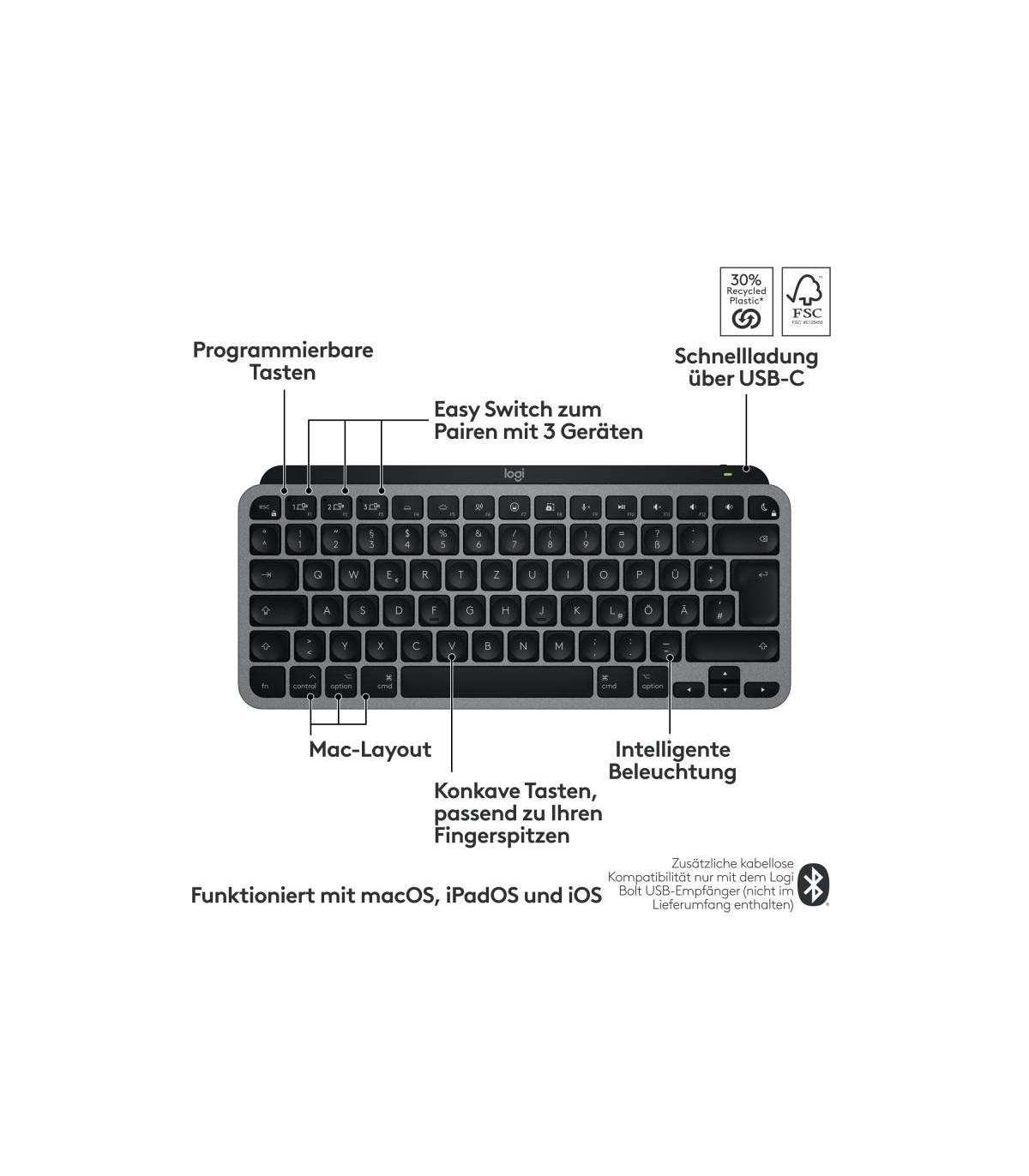 Mehr Funktionalität, spezielles Mac-Tastenlayout, passend zu Apple Oberflächen in Space Gray und Hellgrau, intelligente Beleuchtung, programmierbare Tasten. Auch in Standardgröße mit integriertem Ziffernblock erhältlich. Siehe MX Keys S für Mac - Schnell und flüssig tippen