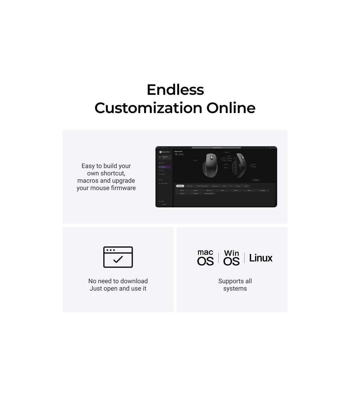 Just click, save, and turn it off, the online Launcher web app allows for easy personalization. You can modify keys, set shortcuts, create dedicated macros, or do professional settings for LOD, polling rate, DPI, etc. Besides, it provides 5 on-board memory profiles for your access to different apps or computers.