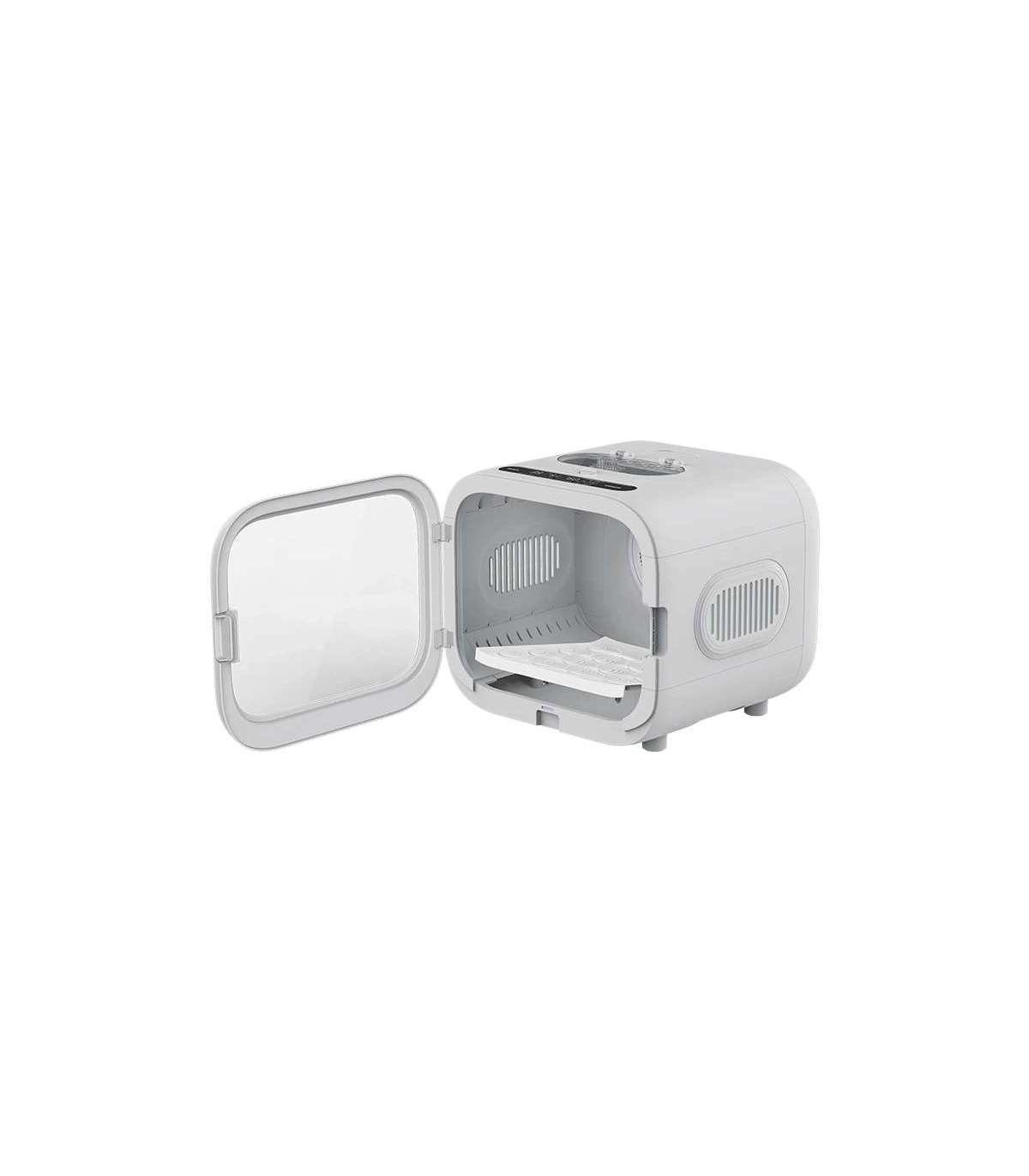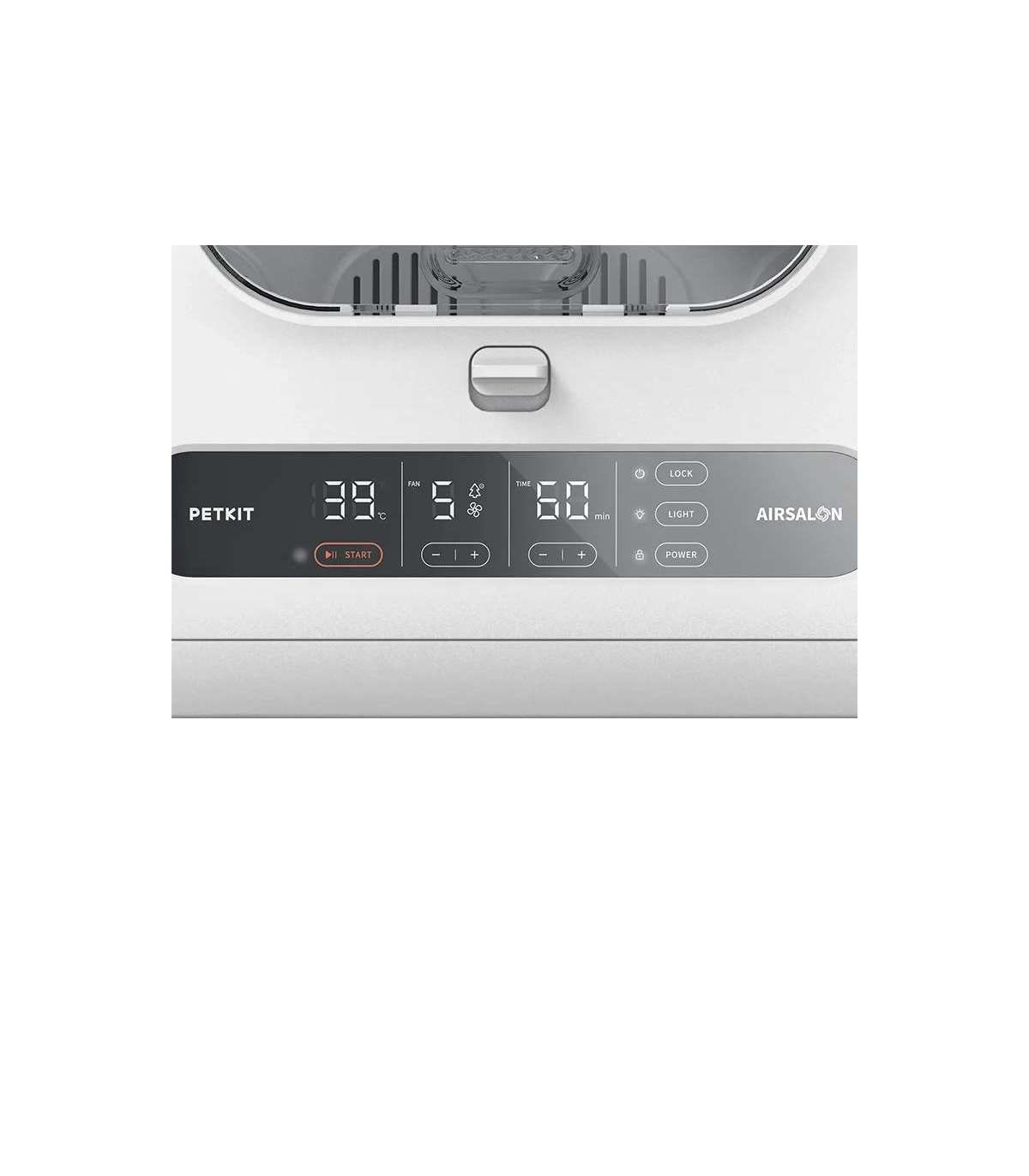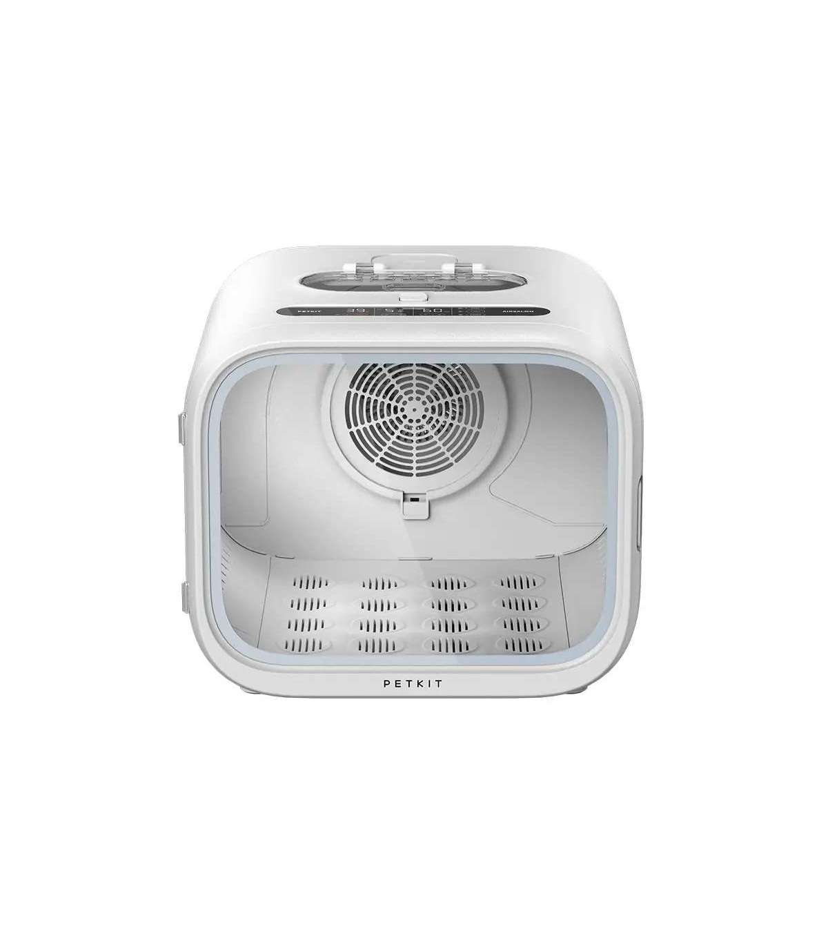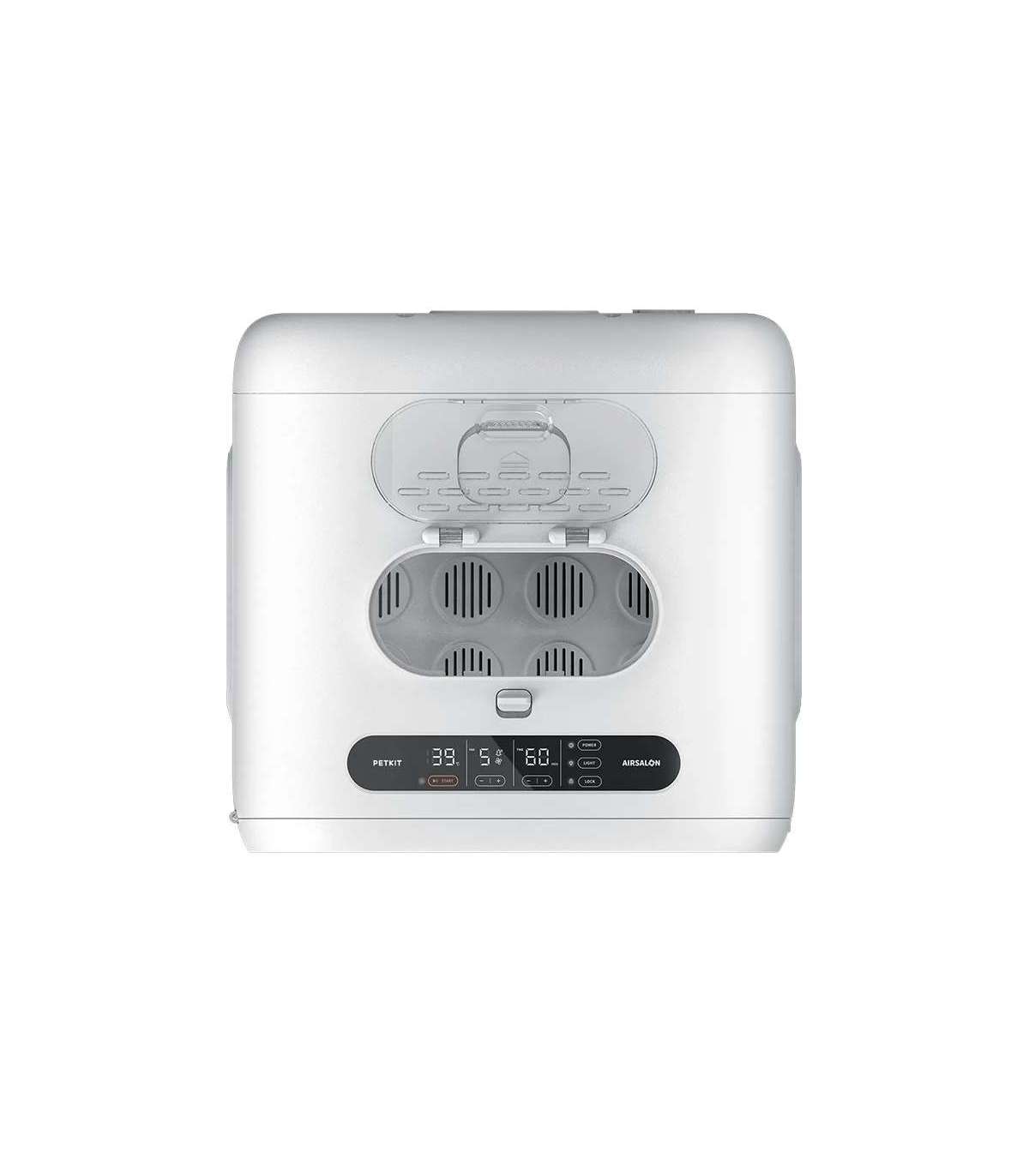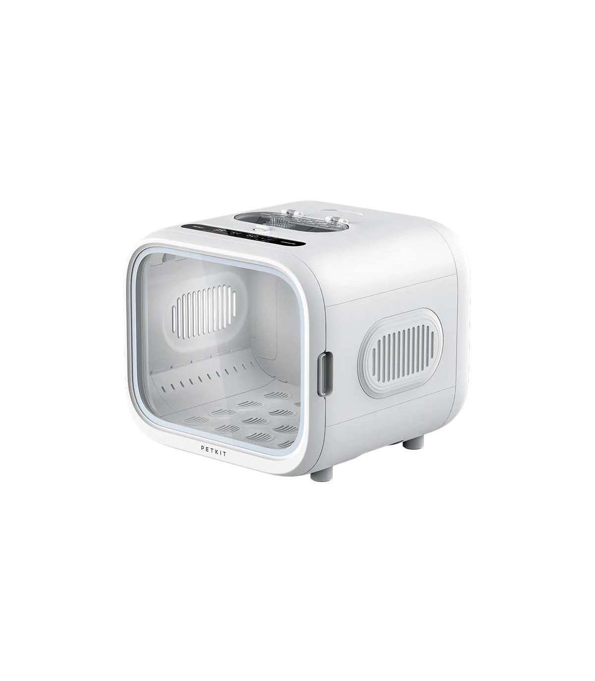 The PetKit pet dryer features a cubic design with rounded corners. It has ventilation openings on three sides to provide fresh air to your pet and deliver a gentle breeze to dry its fur, even in sensitive areas. The bottom of the device has a removable panel for easy cleaning. The interior of AIRSALON MAX Pro is spacious enough to comfortably accommodate two cats or small dogs, allowing them to stretch out and enjoy the warm airflow. There are transparent doors on the front of the dryer to monitor your pet's well-being. Additionally, there is a touch-sensitive LED panel for user-friendly operation. Inside the dryer's ceiling, there is a built-in light, allowing for drying your pet even at night.