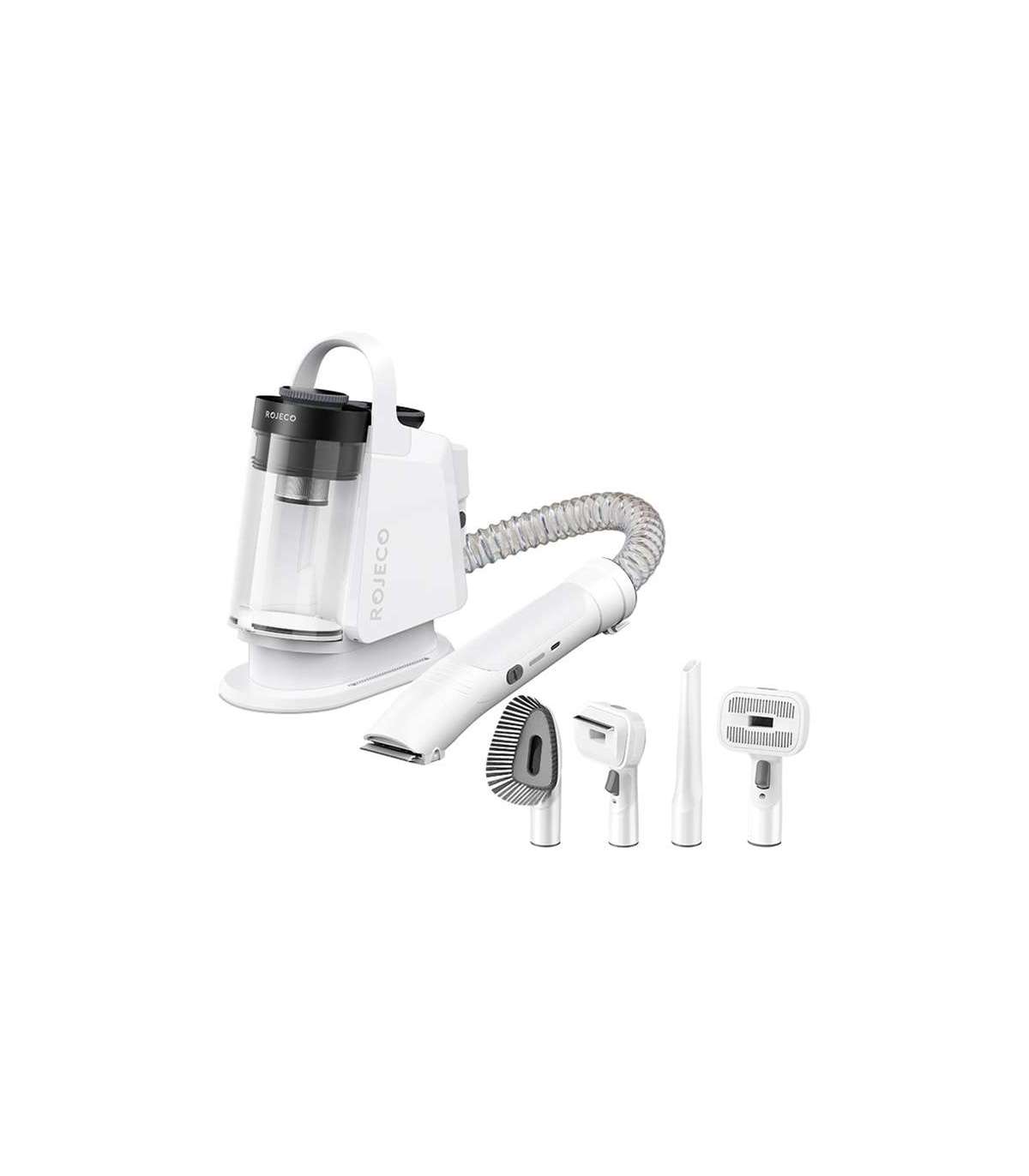 Rojeco 4-in-1 is a practical set for comprehensive grooming of pet hair. It consists of a vacuum cleaner and interchangeable tips to comb, trim, remove undercoat and eliminate hair from furniture. Thanks to its quiet operation (58 dB), powerful motor and high suction power, grooming your pet becomes less stressful and more hygienic - without clouds of hair floating all over the house.