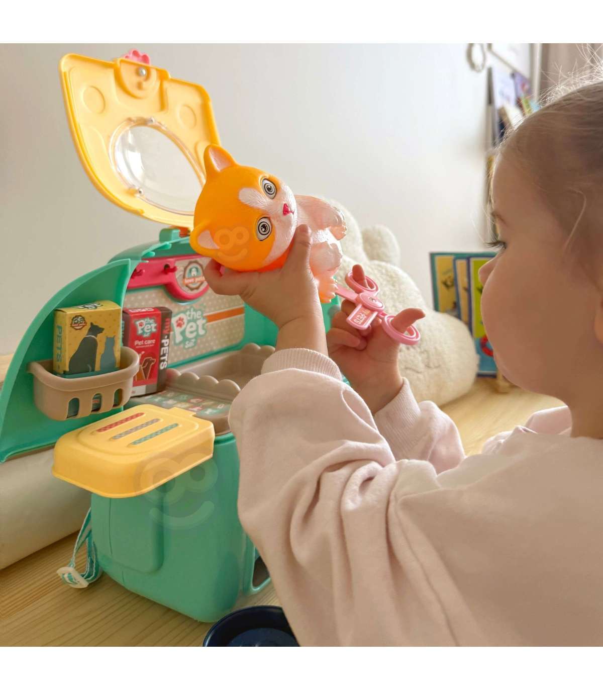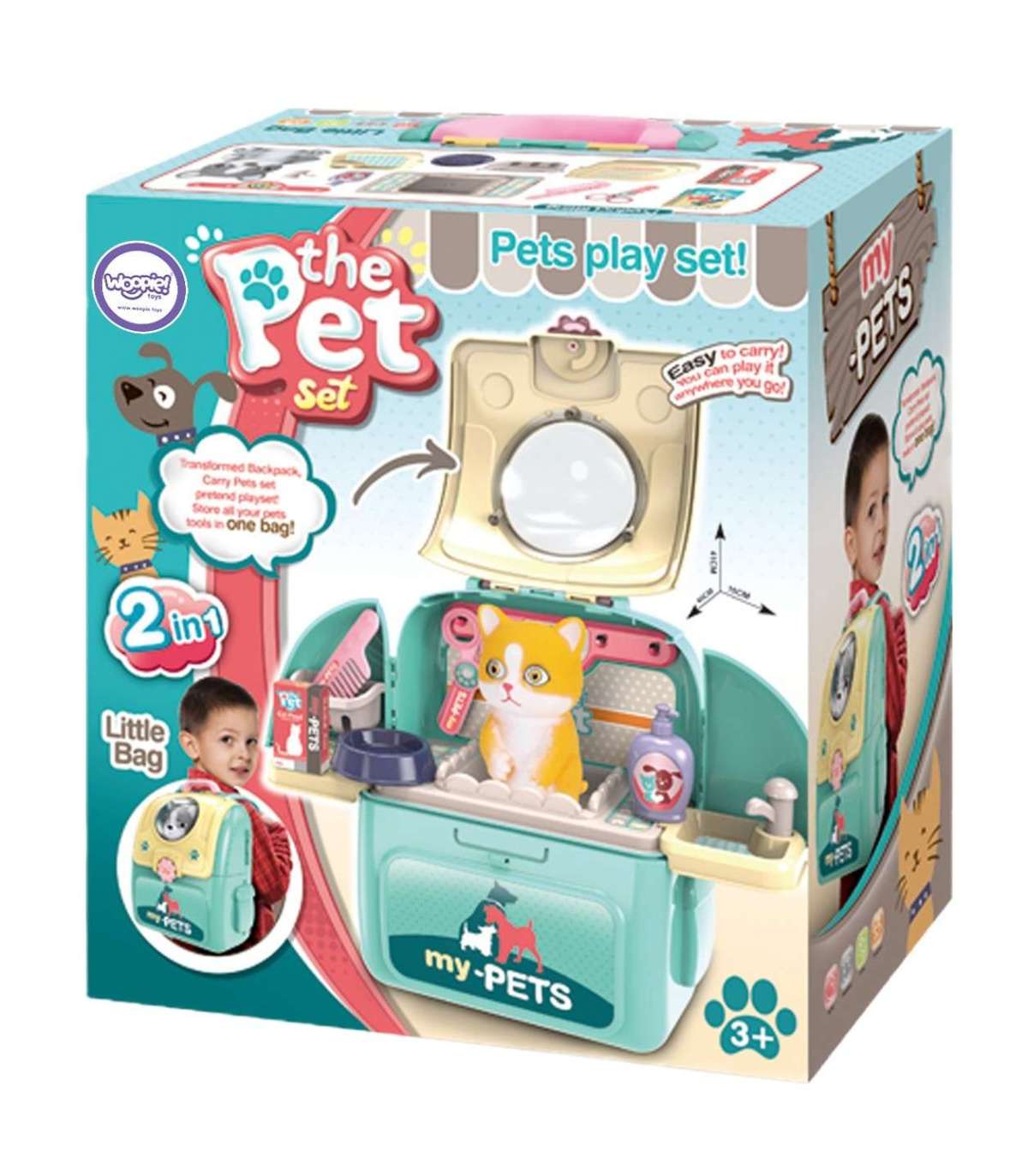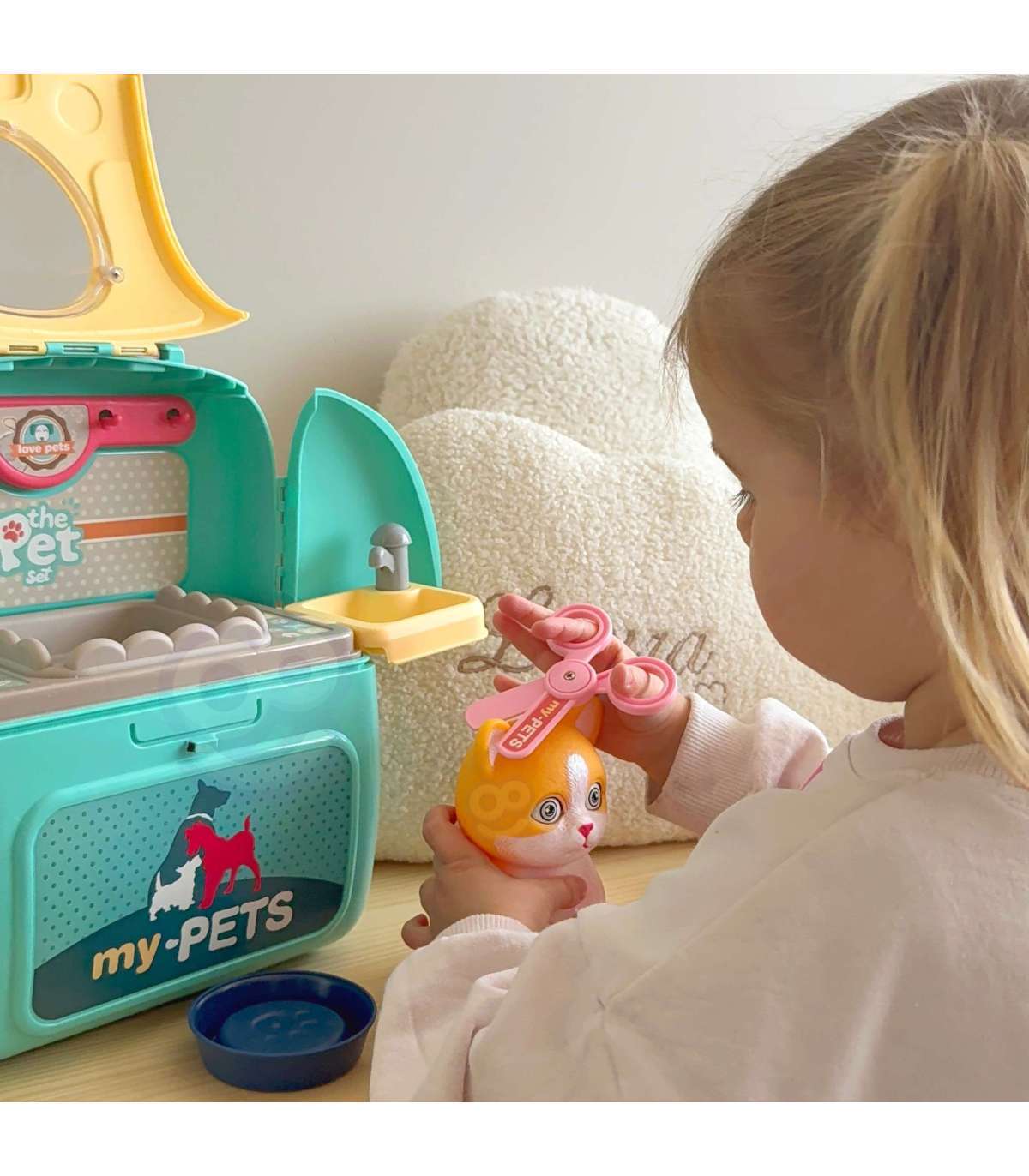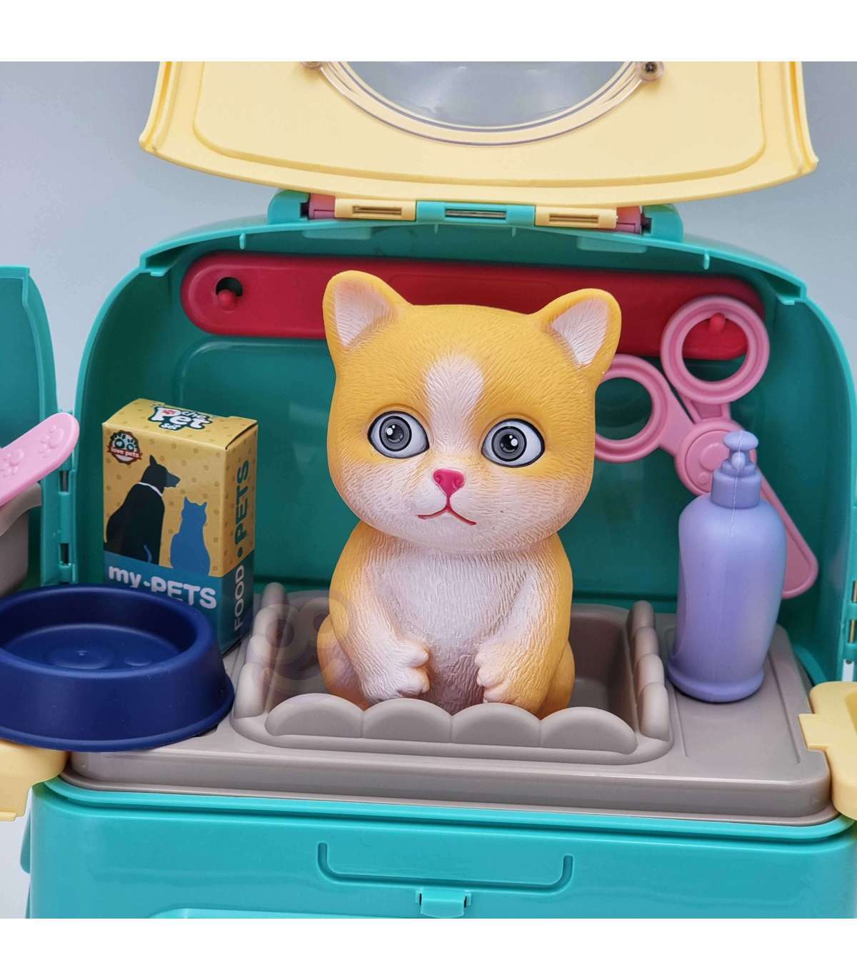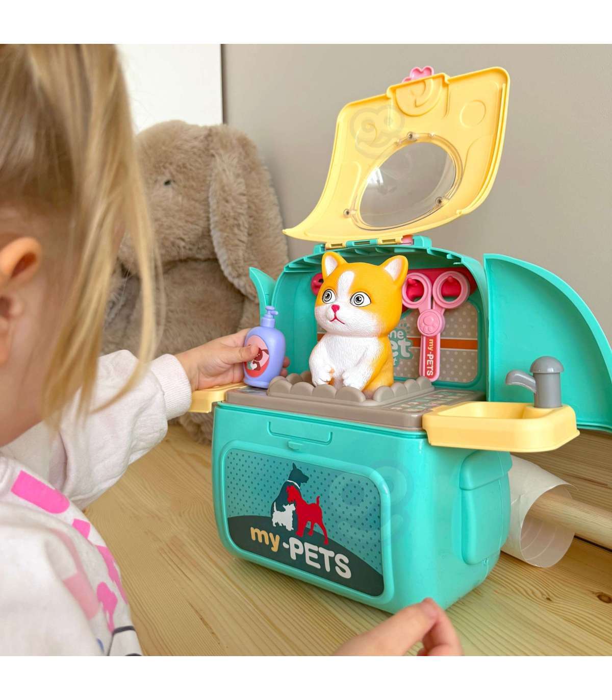 Przenośny Zestaw Pielęgnacyjny dla Kotka od marki WOOPIE pozwoli Twojemu dziecku zadbać o swojego ulubionego pupila. Możesz zabrać wszędzie swojego kota w wygodnym przenośnym plecaku: w podróż, na plac zabaw czy do przedszkola. Plecak posiada uchwyt do podnoszenia oraz specjalne zamknięcie, które nie pozwoli otworzyć się kabinie podczas przenosin i zapewni maksymalne bezpieczeństwo zwierzakowi. Zestaw pielęgnacyjny 2w1 zawiera: figurkę kotka, plecak, pasek (do zakładania kabiny na plecy), miskę, nożyczki, grzebień, koszyk na akcesoria, 2 pudełeczka na karmę, szampon, zlew, kran, półka i wieszak. Zestaw zawiera wszystko co potrzebne do pielęgnacji pupila. Dziecko może umyć i nakarmić swojego kota. Dziecko wcielając się w opiekuna lub weterynarza rozwija swoją wyobraźnie oraz poczucie empatii. Możliwe, że zabawka będzie początkiem do rozwinięcia pasji i drogi do zostania weterynarzem.