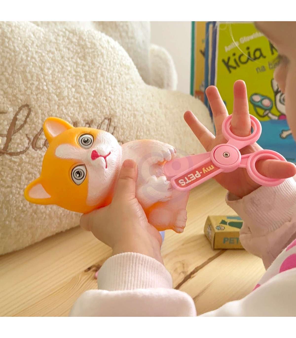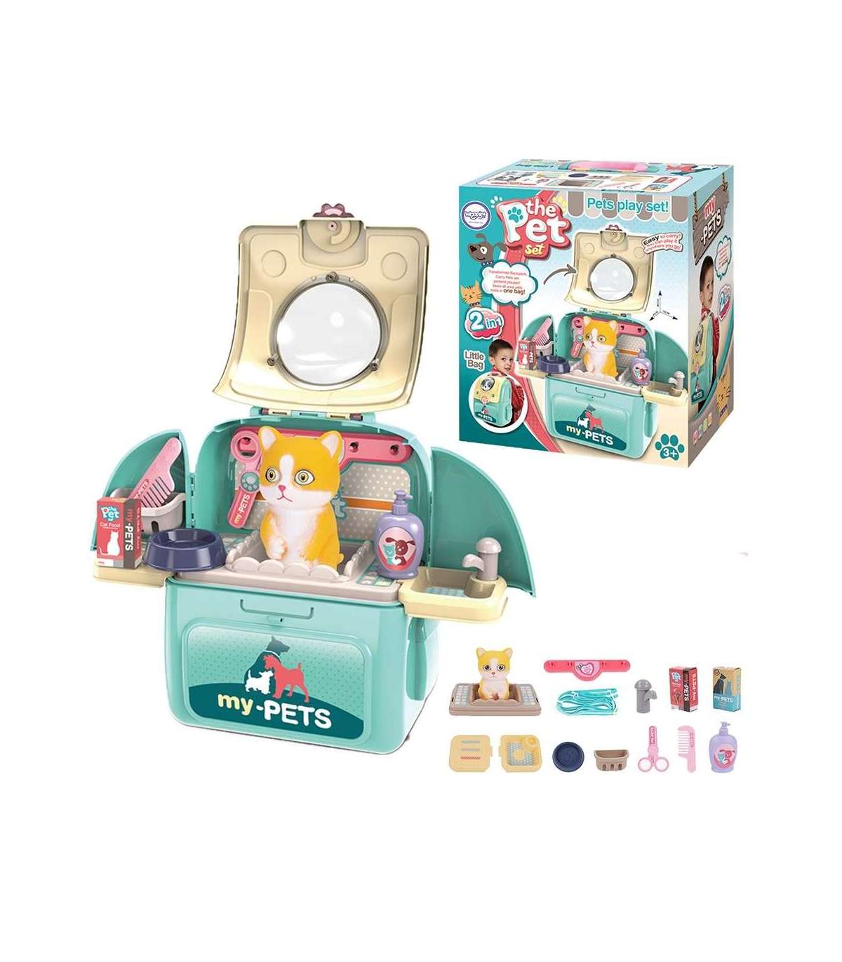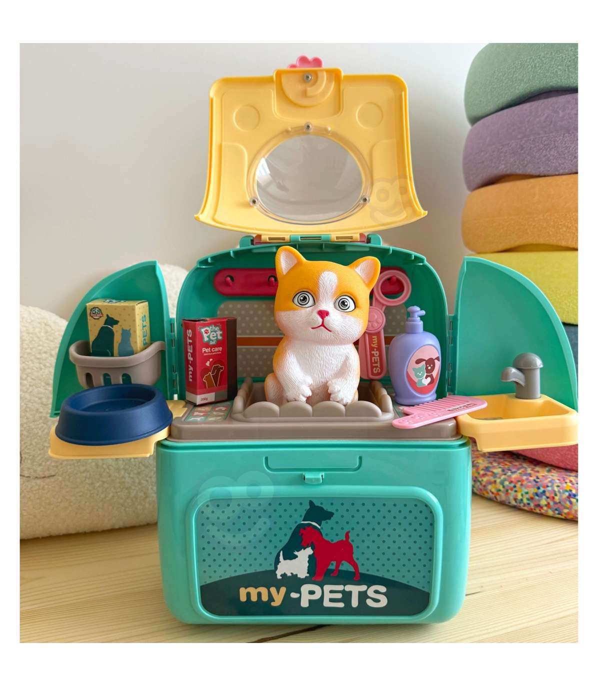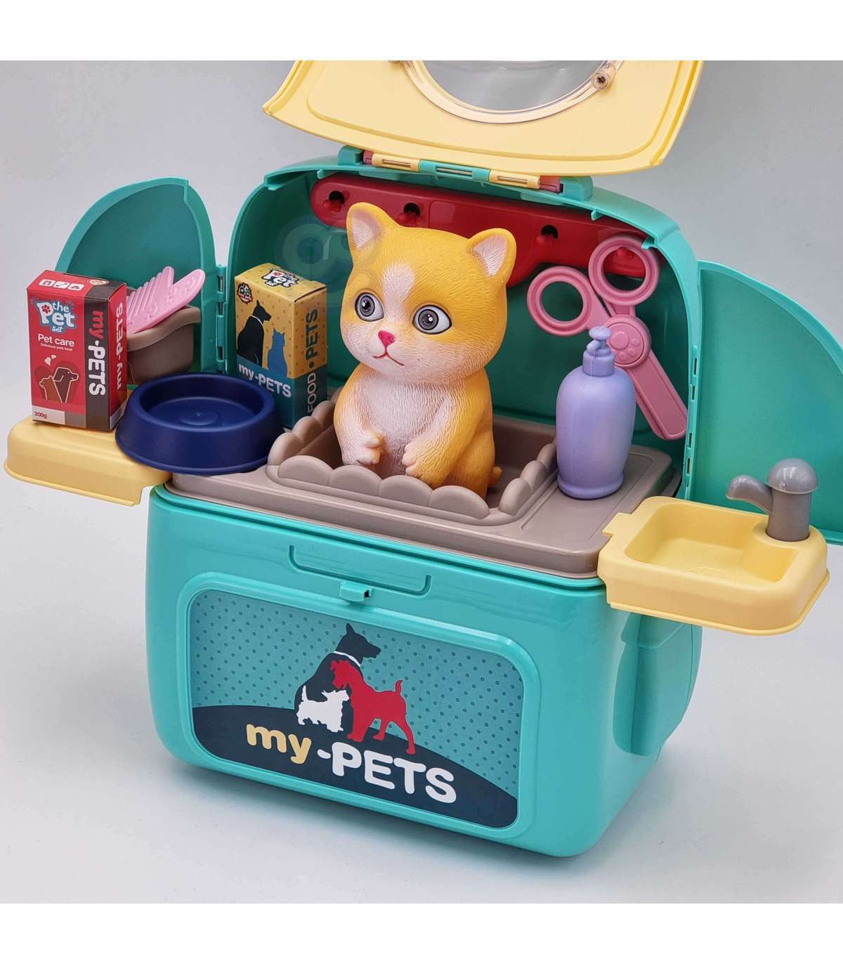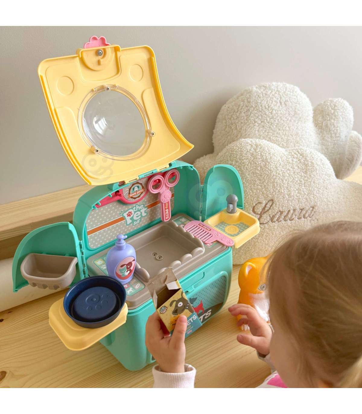 Przenośny Zestaw Pielęgnacyjny dla Kotka od marki WOOPIE pozwoli Twojemu dziecku zadbać o swojego ulubionego pupila. Możesz zabrać wszędzie swojego kota w wygodnym przenośnym plecaku: w podróż, na plac zabaw czy do przedszkola. Plecak posiada uchwyt do podnoszenia oraz specjalne zamknięcie, które nie pozwoli otworzyć się kabinie podczas przenosin i zapewni maksymalne bezpieczeństwo zwierzakowi. Zestaw pielęgnacyjny 2w1 zawiera: figurkę kotka, plecak, pasek (do zakładania kabiny na plecy), miskę, nożyczki, grzebień, koszyk na akcesoria, 2 pudełeczka na karmę, szampon, zlew, kran, półka i wieszak. Zestaw zawiera wszystko co potrzebne do pielęgnacji pupila. Dziecko może umyć i nakarmić swojego kota. Dziecko wcielając się w opiekuna lub weterynarza rozwija swoją wyobraźnie oraz poczucie empatii. Możliwe, że zabawka będzie początkiem do rozwinięcia pasji i drogi do zostania weterynarzem.