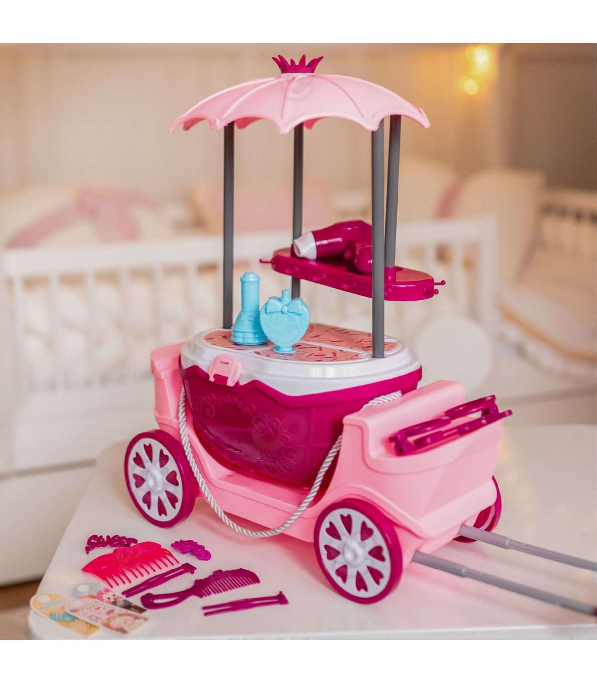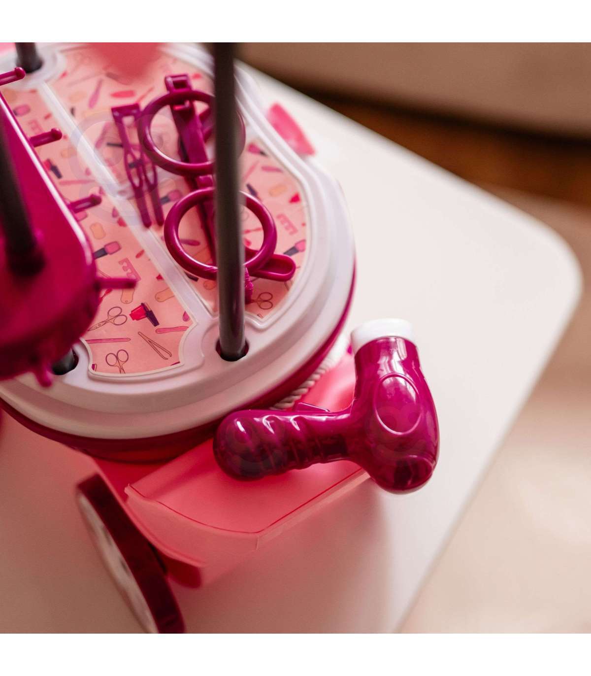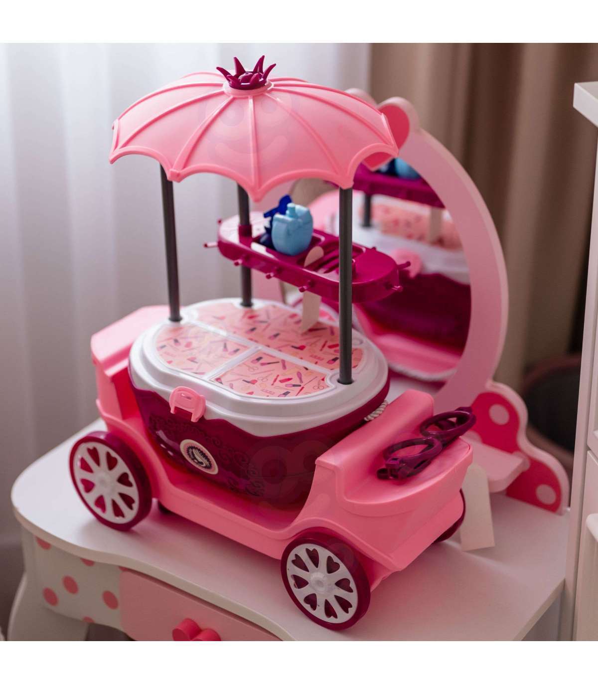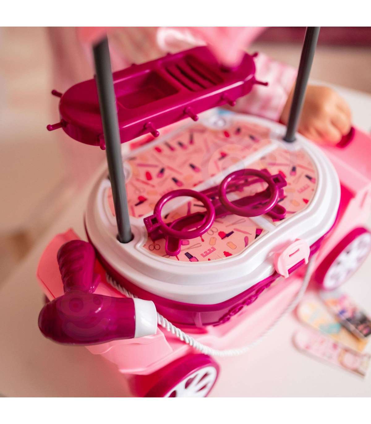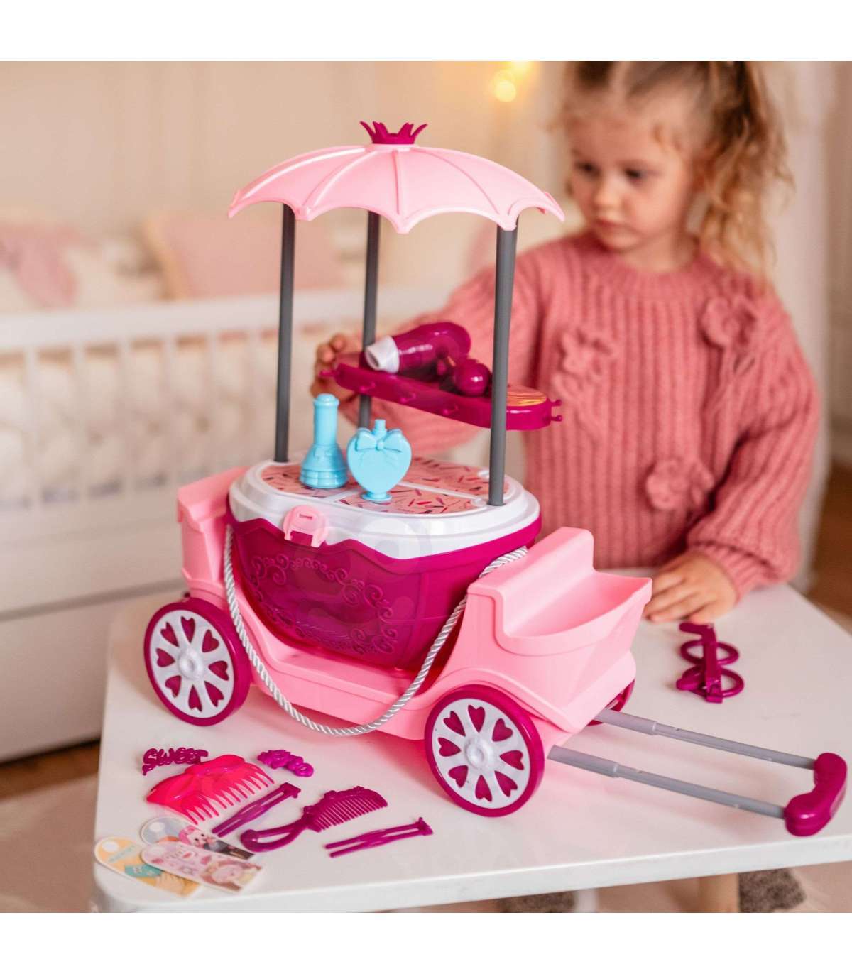 Kosmetyczny wózek na kółkach z lustrem i akcesoriami zachwyci każde dziecko swoim bajkowym wyglądem i bogatym wyposażeniem. To mobilny salon piękności w formie eleganckiej karety z daszkiem, dużym lustrem i zestawem kolorowych dodatków. Całość została zaprojektowana tak, aby zapewnić dzieciom godziny kreatywnej i angażującej zabawy, rozwijając przy tym wiele ważnych umiejętności. Zabawka łączy w sobie cztery różne funkcje: może być używana jako toaletka, elegancki wózek, praktyczna walizka na kółkach oraz poręczny koszyk. Dzięki temu dziecko może bawić się zarówno w domu, jak i zabrać zestaw w podróż lub do znajomych. Duże lustro w ozdobnej ramie pozwala na zabawę w stylizacje, a różnorodne akcesoria fryzjerskie i kosmetyczne sprawiają, że każda chwila staje się magiczną przygodą. Kosmetyczny wózek to nie tylko świetna forma zabawy, ale również sposób na rozwój dziecka. Dzięki wielofunkcyjnej konstrukcji i bogatym akcesoriom, zabawka dostarcza mnóstwo frajdy i staje się nieodłącznym elementem codziennych zabaw.