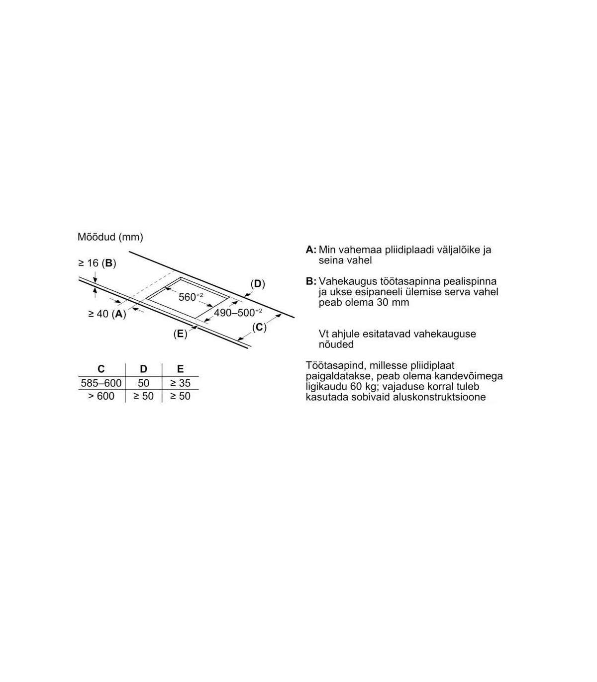 Paigaldamiseks nõutav niši suurus (k x l x s) : 51 x 560-560 x 490-500 mm