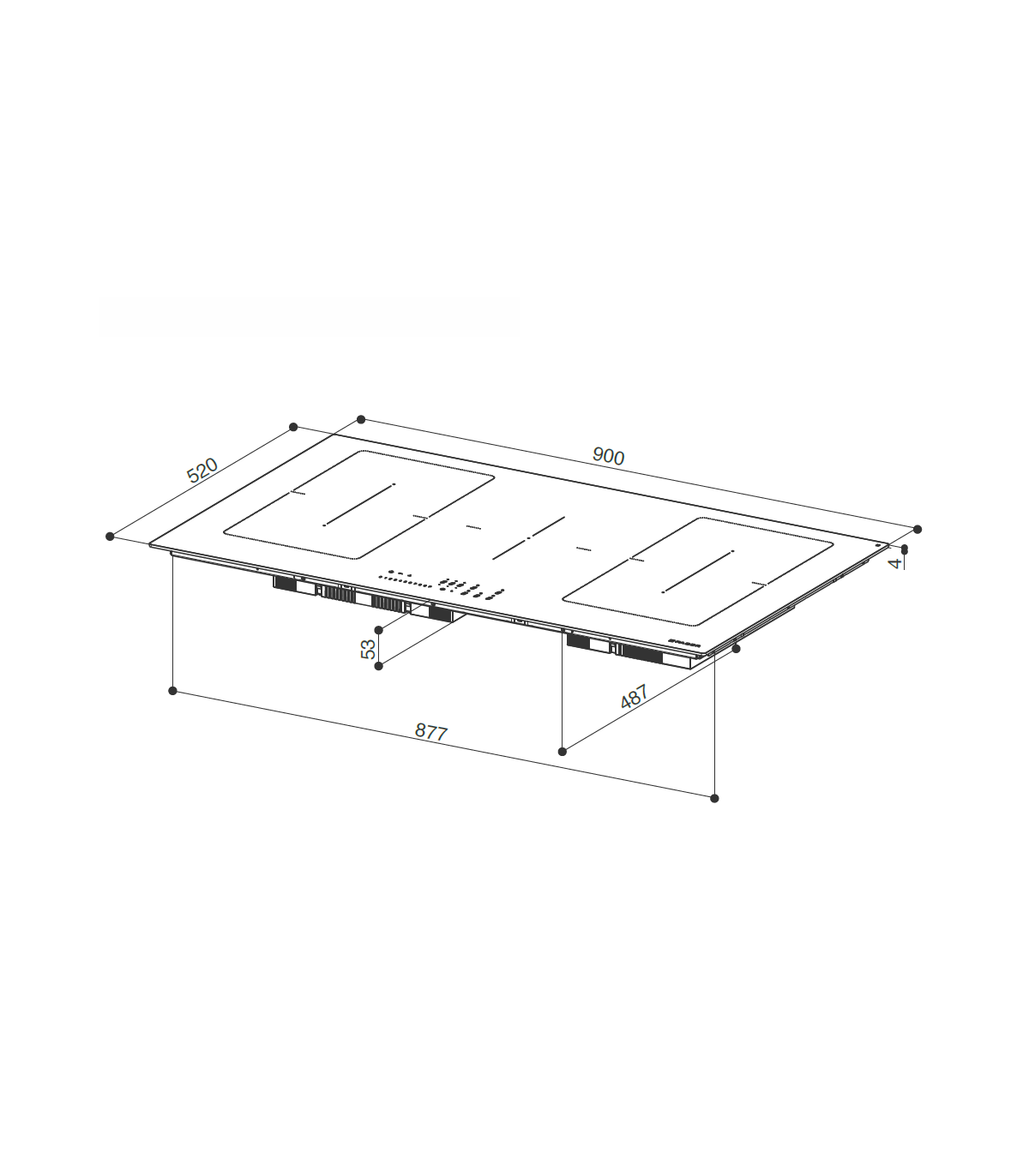 Keedualad: paremal ja vasakul asuvad Bridge zone keedualad 210 x 190 cm/ 2100 W, keskmine 20 cm/ 2300 W.