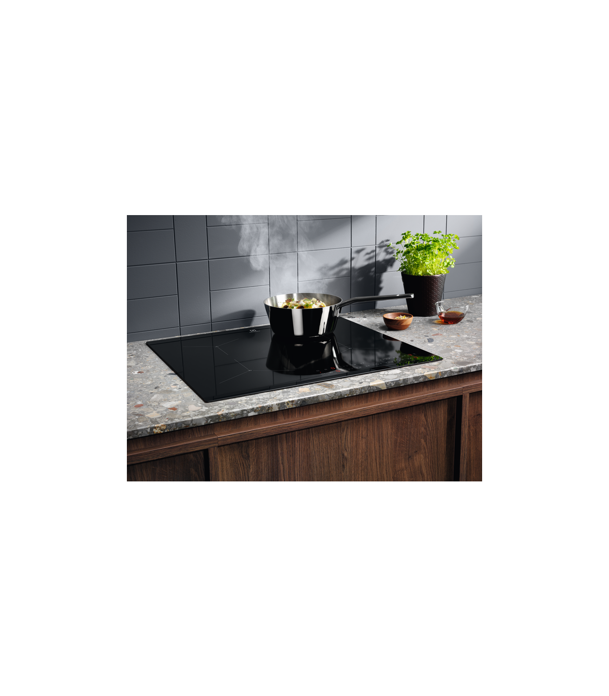 Pliidiplaadi paksus klaasist kattepinnani on vaid 44 mm. Saab selle paigaldada köögimööbli sisse, kuna minimaalne paigalduskõrgus on 12 mm sahtlite ja 28 mm ahju ülaserva tasandist.
