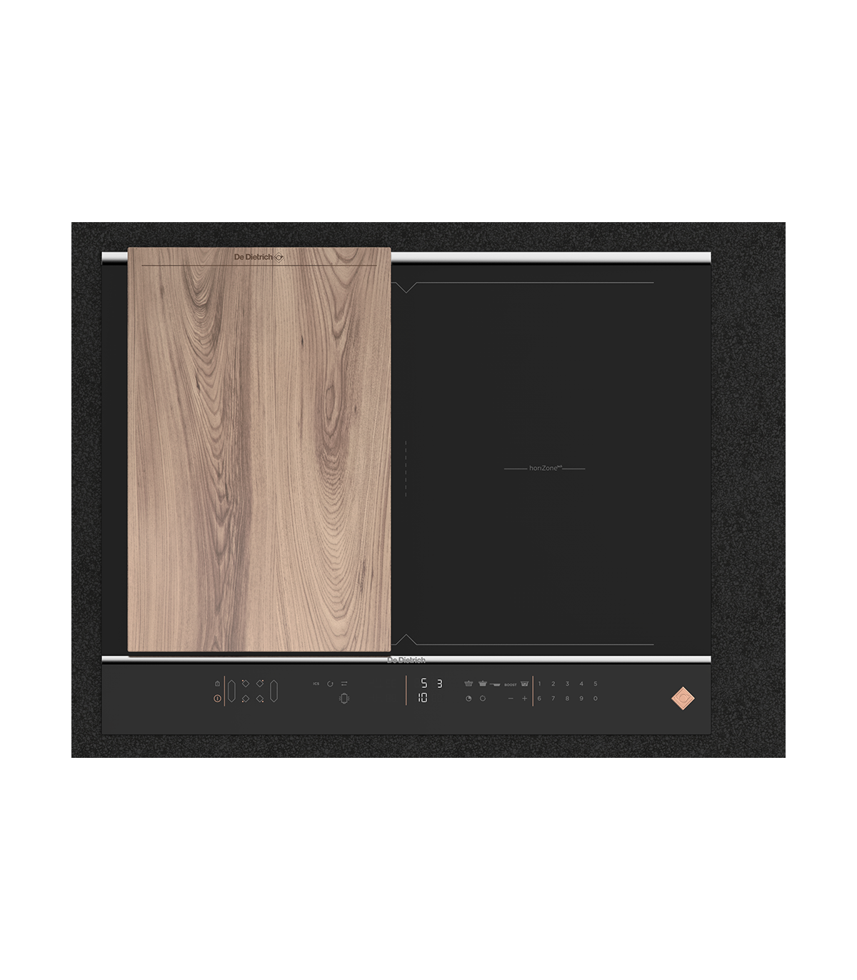 HoriZone tsooniga pliidiplaati on võimalik kohandada vastavalt kasutaja vajadustele. HoriZone pliidiplaat pakub kohandatavat toiduvalmistamise tsooni, millel võib kasutada nii ühte suurt keedunõud kui ka mitut väikest nõud eraldi. Samuti saate valida: kas 1 seadistus kogu tsoonil või 2 erinevat seadistust kontrollimaks kahte eraldiseisvat tsooni eraldi. HoriZone tsoon annab kuni 20% ekstra lisaruumi, võrreldes ükskõik millise tavalise pliidiplaadiga. Seda kõike tänu sellele, et kui tavalise pliidiplaadi sama suur osa koosneb 2st induktorist, siis De Dietrich pliidiplaadi HoriZone tsoon koosneb 6-st induktorist. Tänu rohkematele induktoritele suudab ala katta ära palju suurema pinna, mida kasutada küpsetamiseks.