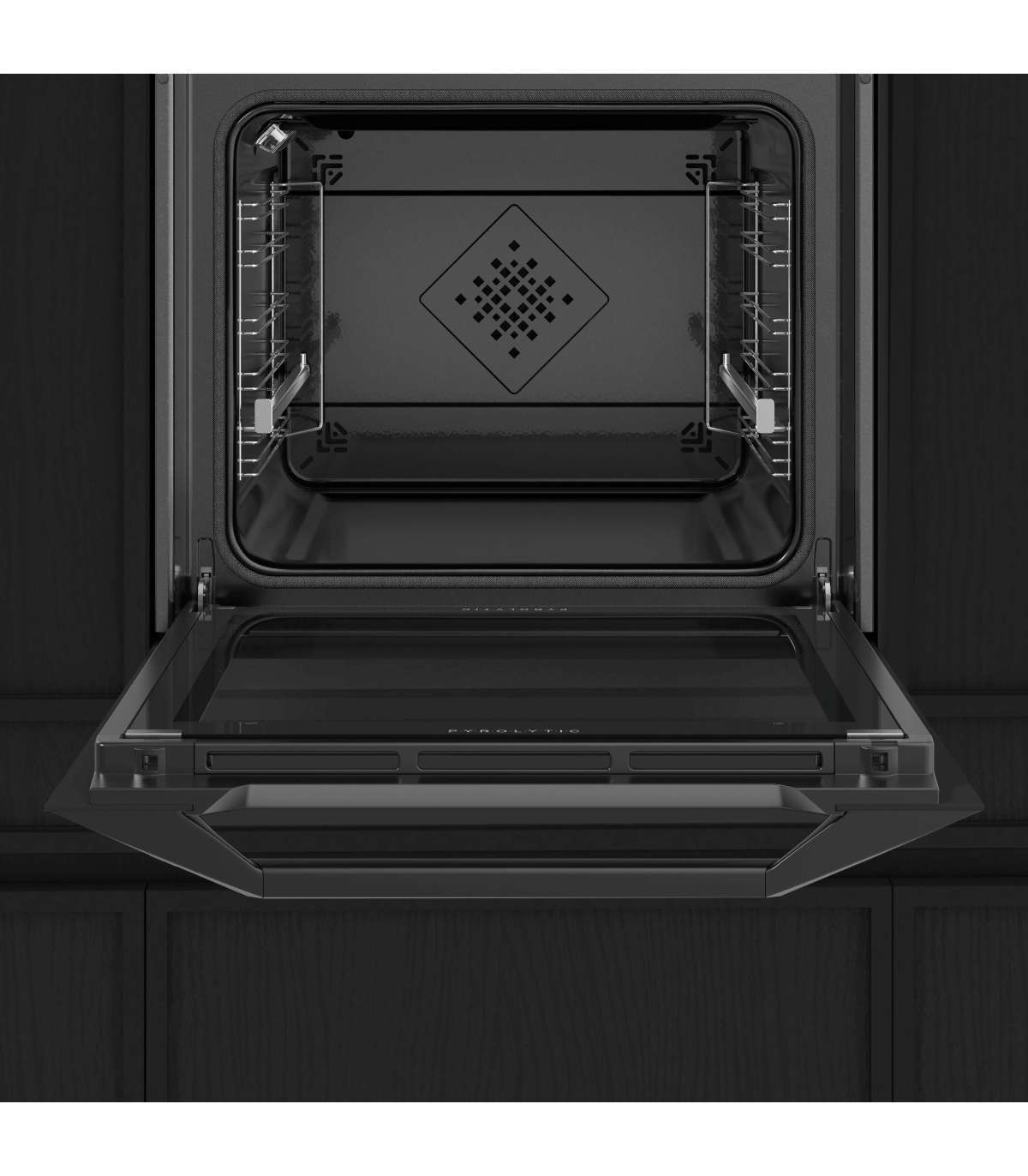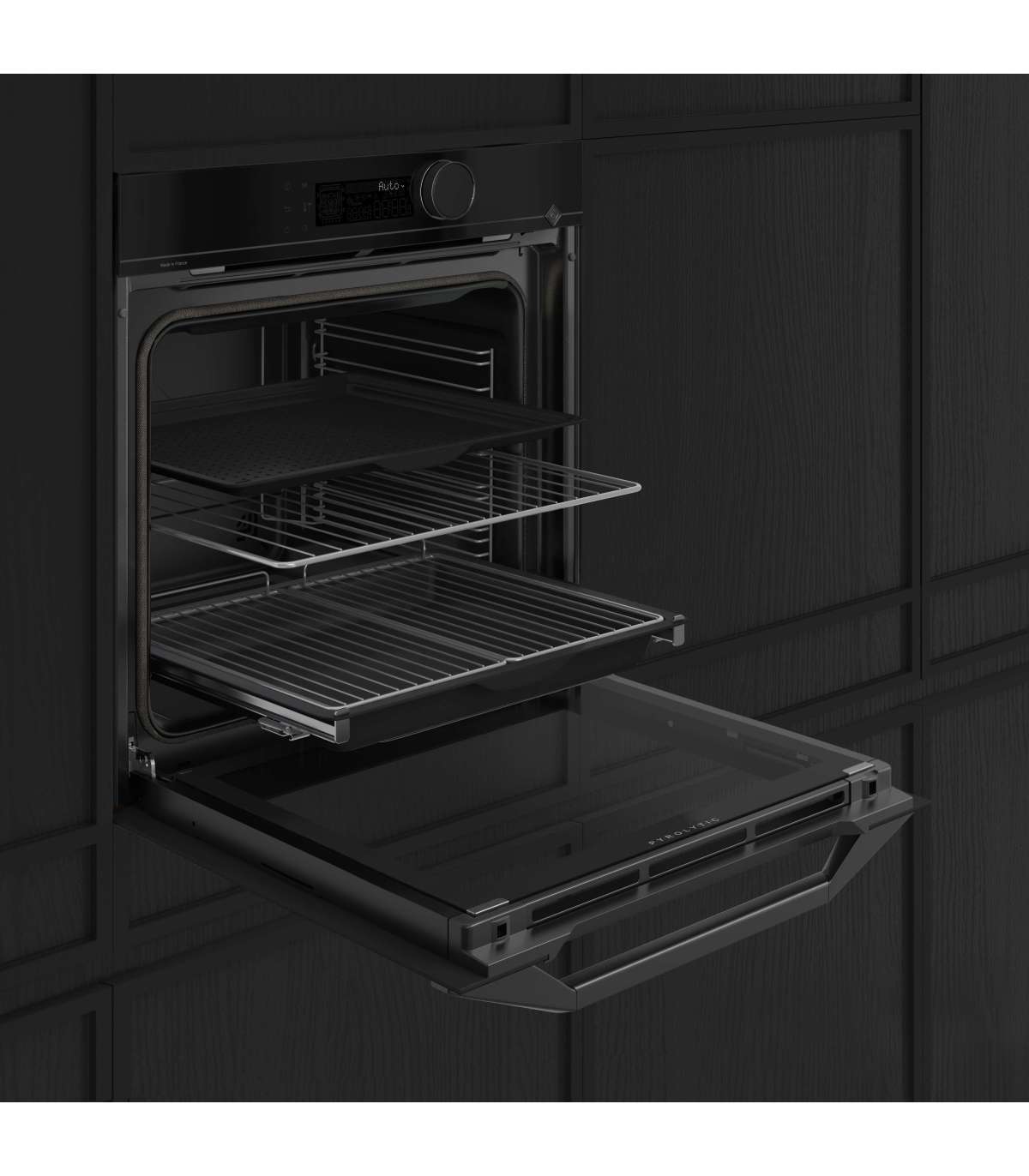 Jahe pehmelt sulguv uks tagab muretu ahju käsitluse! 4-kordse tugevdatud klaasiga uks püsib jahe ka kõige kõrgemate temperatuuride juures, isegi pürolüüspuhastuse vältel. Pehmelt sulguvad uksehinged tagavad, et uks sulgub alati vaikselt.
