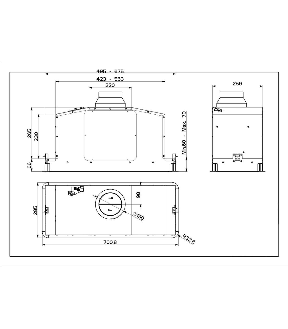 Paigaldamine: Vajalik minimaalne kaugus elektrilistest pliidiplaatidest peab olema vähemalt 50 cm ning gaasi- ja segapliidiplaatidest 65 cm. Õhupuhastajaga on kaasas üleminek 150-120 mm.