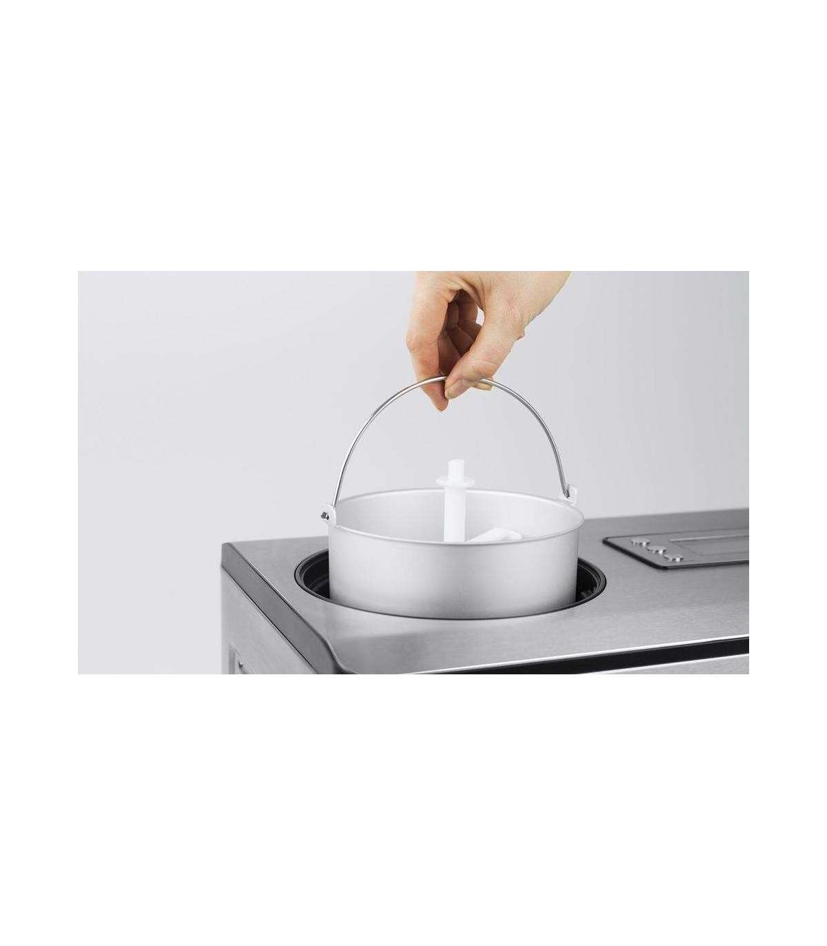 - 4 programmes for the fully automatic production of ice cream of yoghurt. Compressor cooling: Pre-cooling down to -35 ° C in just a few minutes thanks to 180 watt cooling capacity. Ingredients can be added during operation via the refill flap.