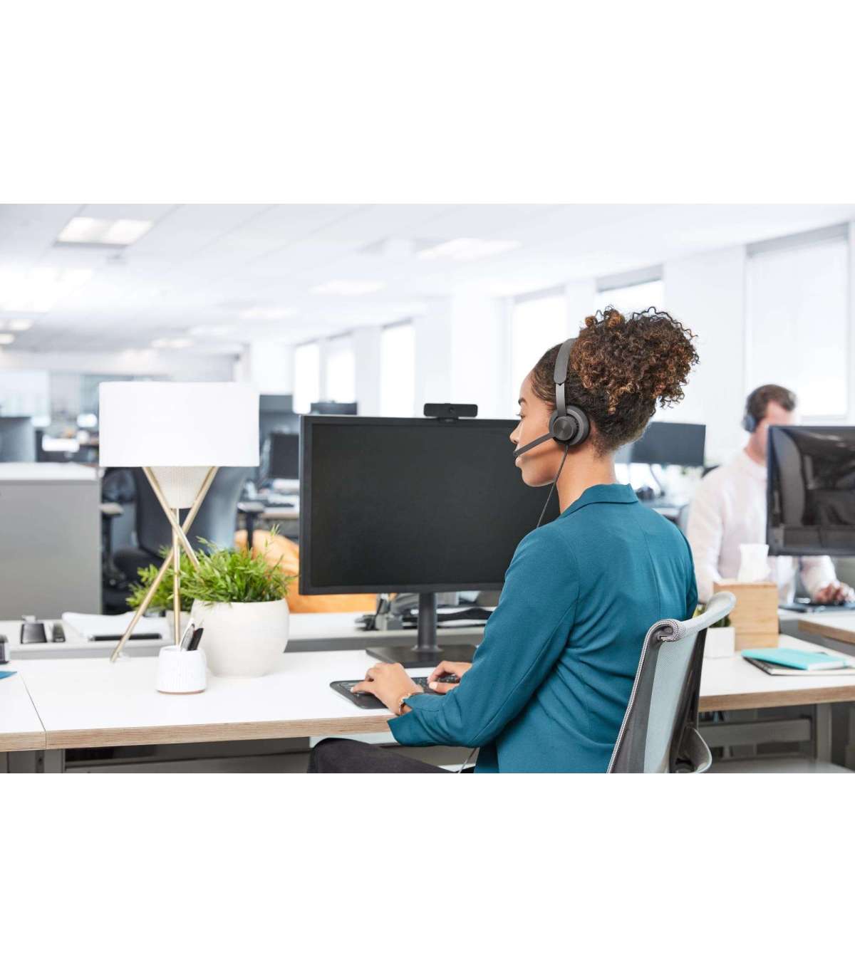 • The Teflon-coated stainless steel headband features a silicone head cushion and memory-foam ear pads that provide a comfortable fit throughout the workday in a lightweight, contemporary style