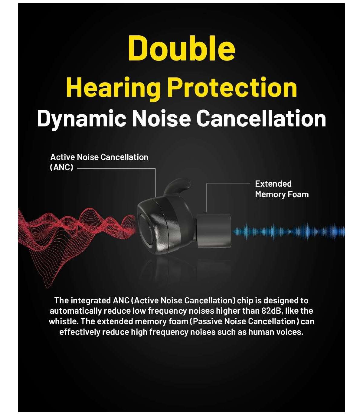 The integrated ANC (Active Noise Cancellation) chip is designed to automatically reduce low frequency noises higher than 82dB, like the whistle. The extended memory foam (Passive Noise Cancellation) can effectively reduce high frequency noises such as human voices.