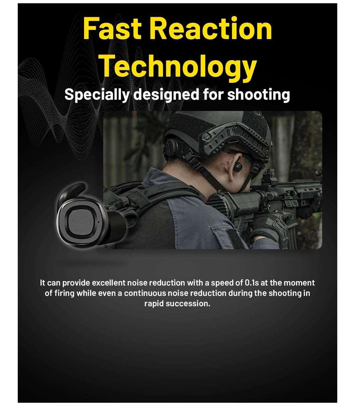 Prolonged exposure to noise will result in either temporary or permanent hearing loss, or symptoms such as dizziness, headache, chest tightness, tinnitus, and memory loss. Working in an environment with noise above 85dB (A) for a long time may cause occupational noise-induced hearing loss, and the noise in tactical shooting even can reach 150dB.