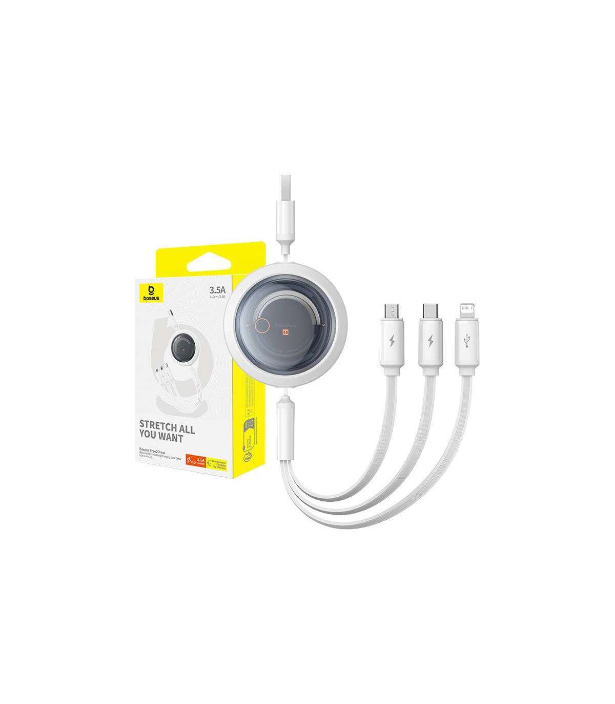 Fast Charging Cable 3in1 Baseus Free2Draw, USB to micro USB+USB-C+Lightning, 3.5A, 1.1m (white)