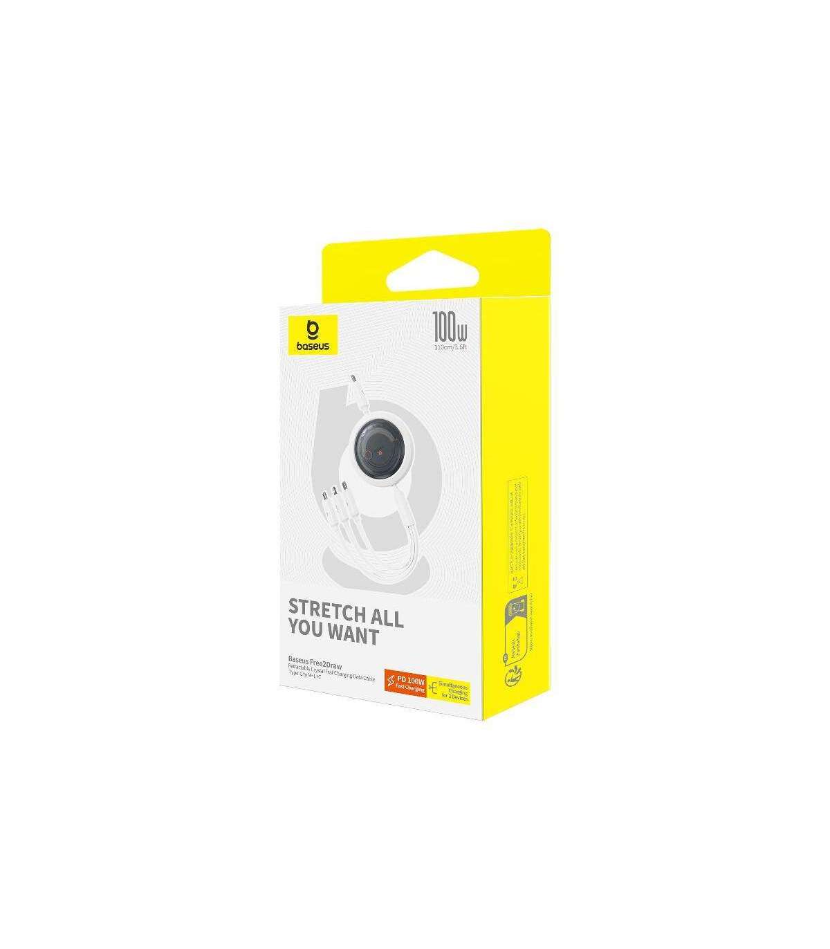 With the Baseus Free2Draw 3-in-1 cable, charging and data transfer becomes fast, convenient and hassle-free. With the ability to charge as many as three devices simultaneously, it is an indispensable companion for travel, work or home. It provides maximum power of up to 100 watts, and its clever design allows 4-stage length adjustment.