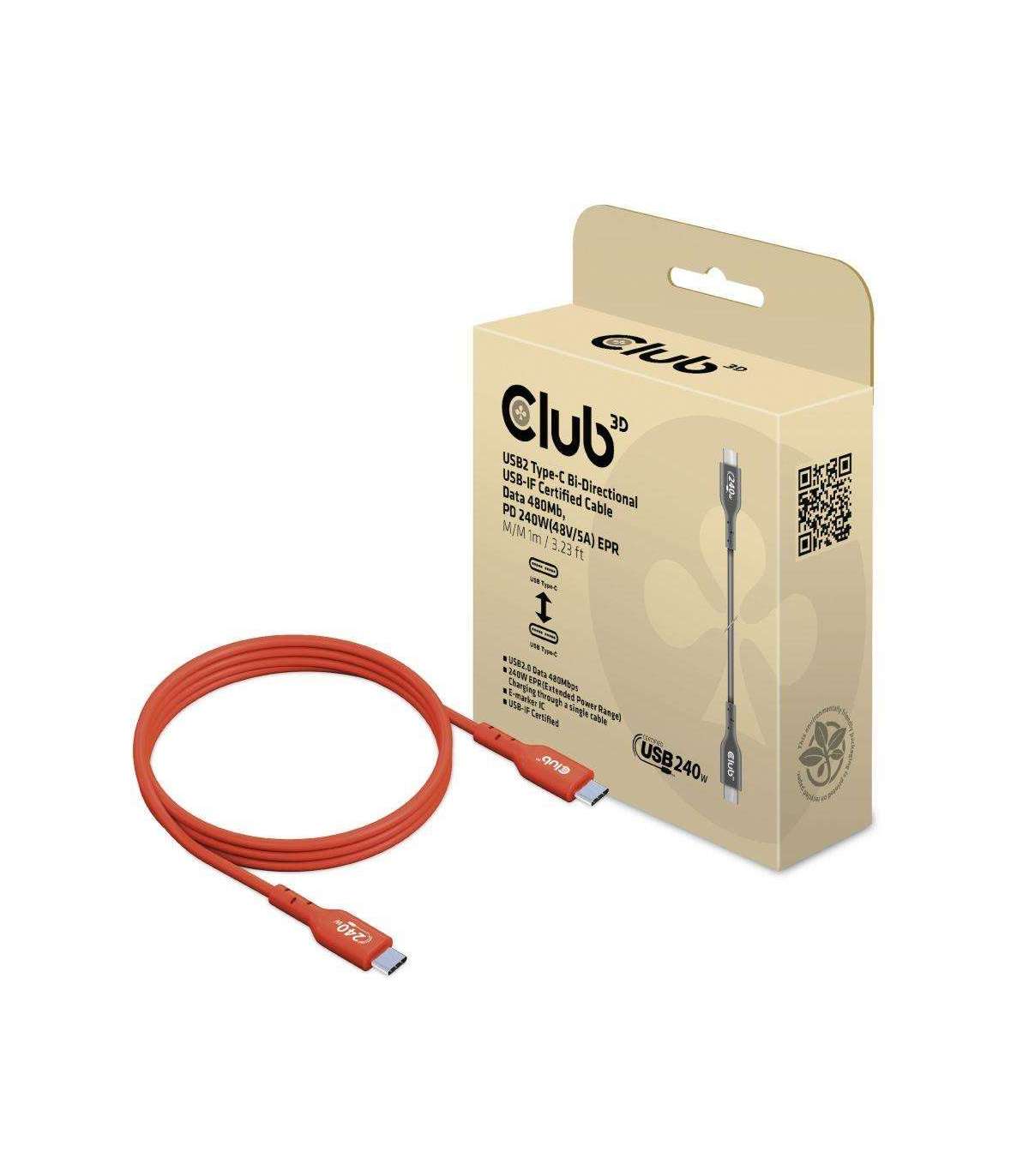 The Club 3D CAC-1511 USB2.0 Type-C Bi-Directional USB-IF Certified Cable, Data 480Mb, PD 240W(48V/5A) EPR, Extended Power Range M/M 1m / 3.23ft connects your Notebook, Tablet or Phone with USB Type-C output to your favorite existing Peripherals, Accessories and Chargers. It enables Data and Power over a single cable and both ways. This cable supports USB2.0 data up to 480Mbps and up to 240Watt(48V/5A) output for Downstream charging or powering your Notebook, Tablet or Smartphone.