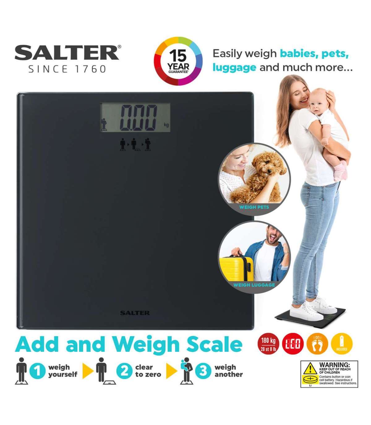 See Salteri lisamise ja kaalumise kaal, mis sobib ideaalselt imikute, lemmikloomade, pagasi ja muu täpseks mõõtmiseks, hoiab asjad lihtsana.