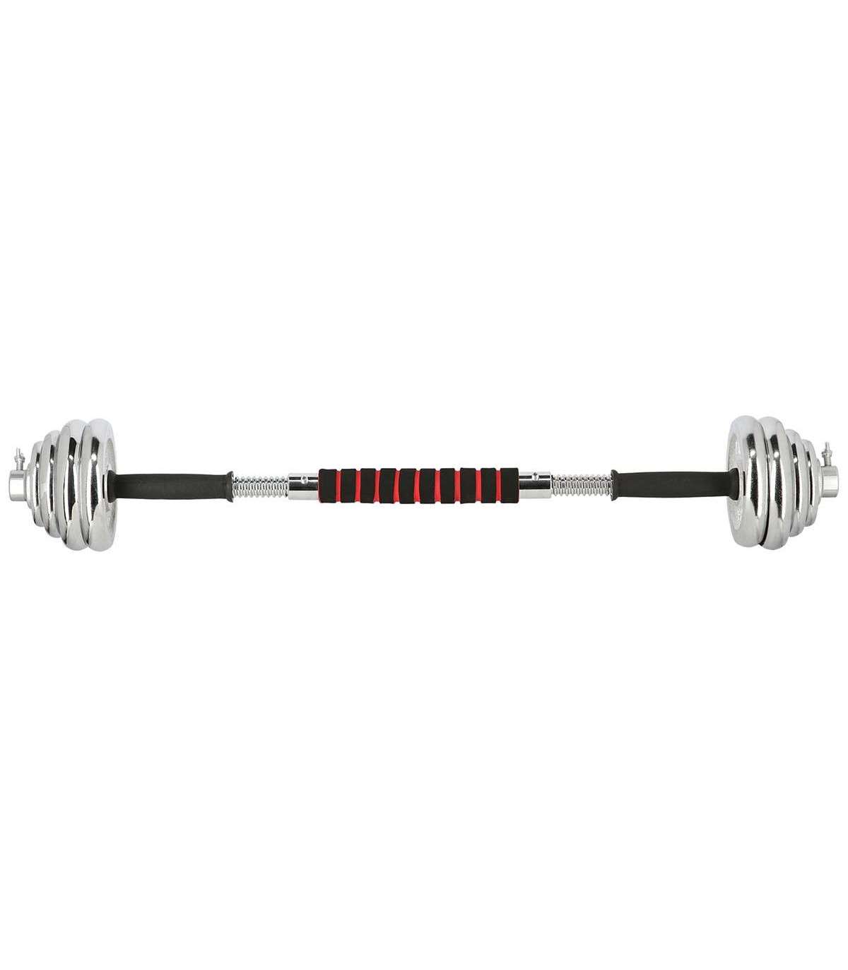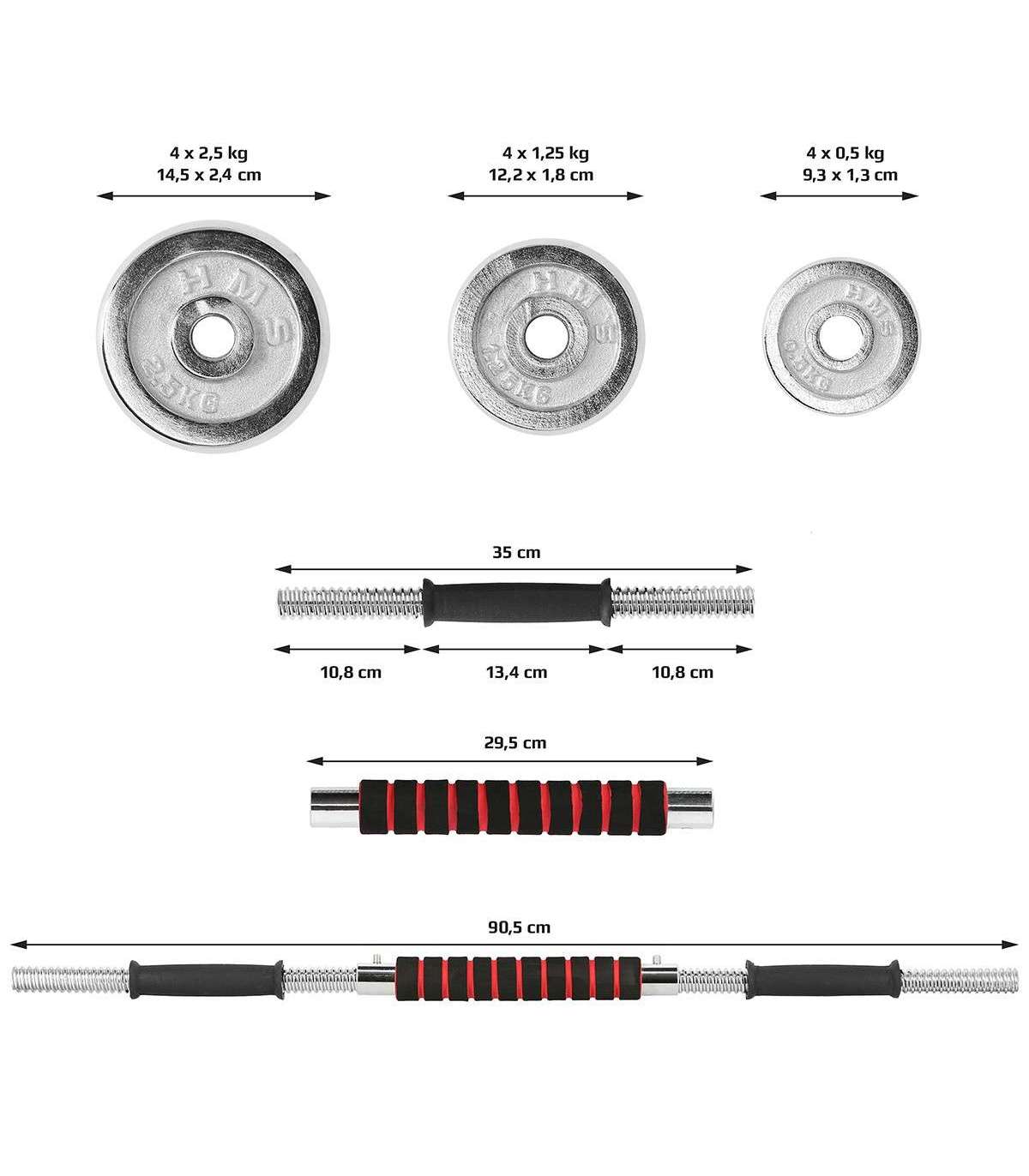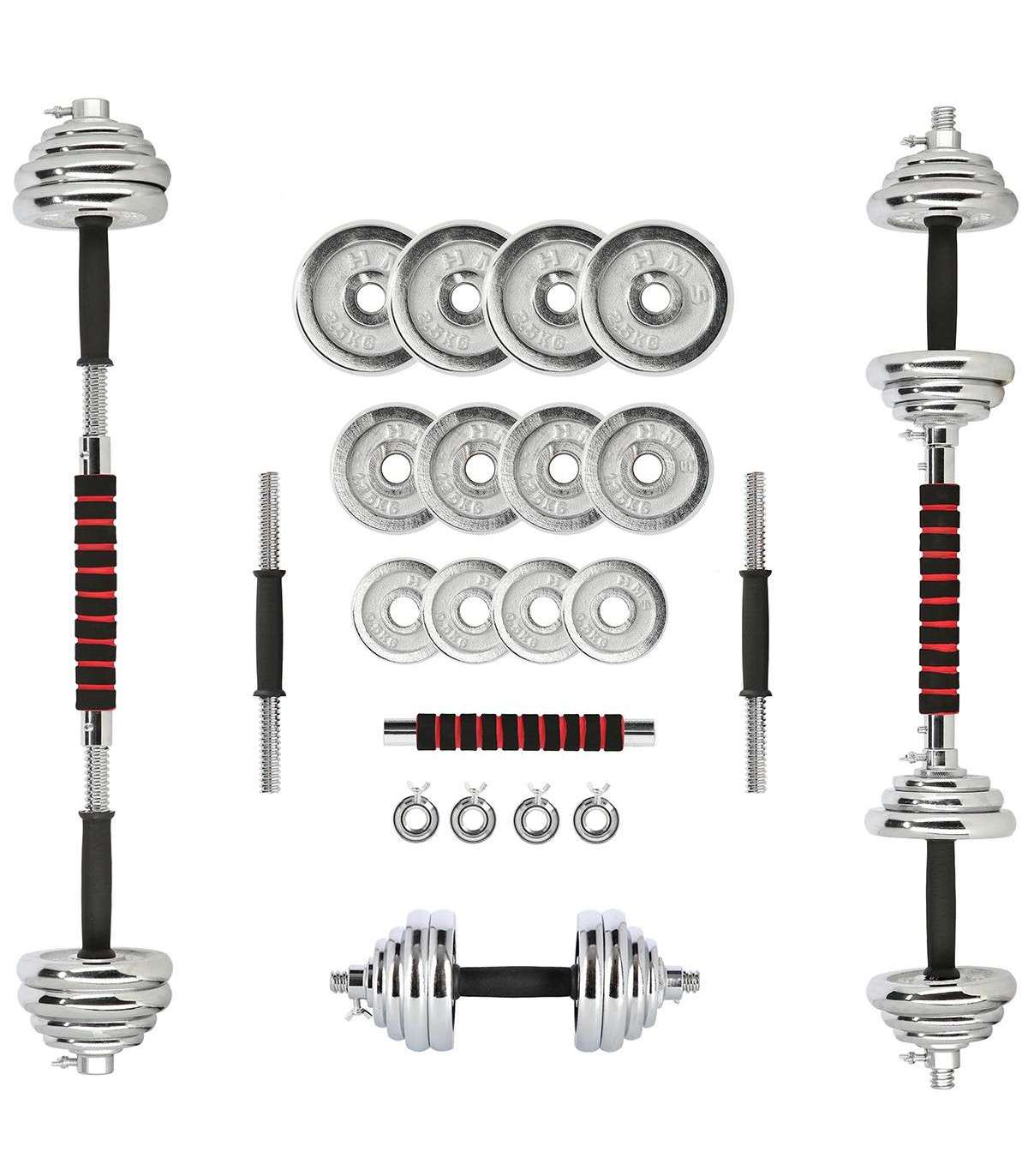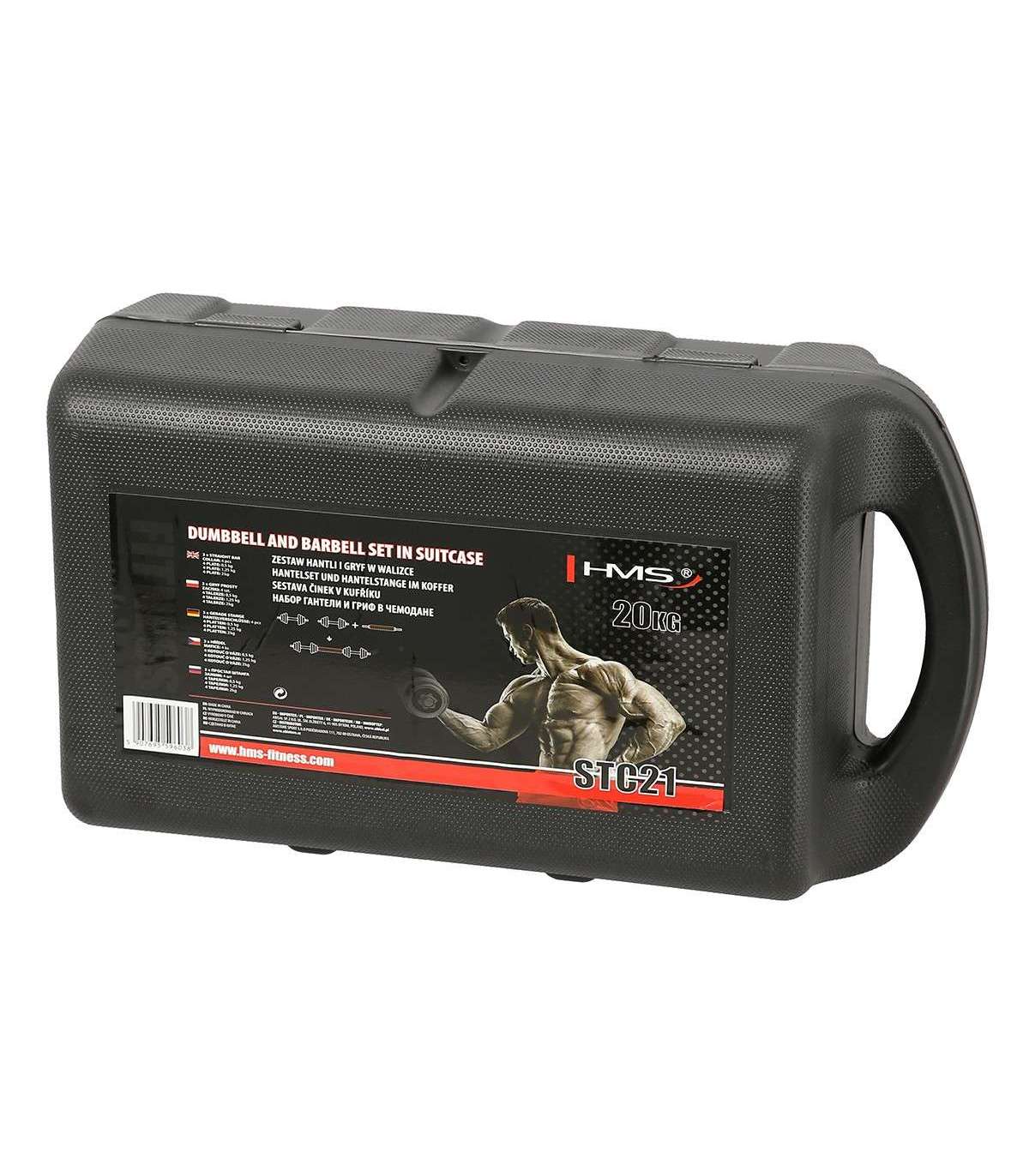 STC21 HMS is a set of chrome barbells in a suitcase, offering also barbell function.Fully equipped gym must offer dumbbells and a barbell. However, in a home gym space saving issue is very important. Therefore, the ideal solution is set of 2 in 1 HMS STC21.HMS STC21 is a set of two dumbbells with replaceable weights. Thanks to a special connection system it can be converted into a barbell. This innovative solution enables a user to save space and it significantly expands the range of workout possibilities compared to a regular set of dumbbells. The process of transformation of dumbbells into a barbell is very simple and does not take much time. Due to the HMS STC21 set it is possible to perform exercises addressed to all muscle groups and in varied configurations.HMS brand focuses primarily on highest quality materials. HMS STC21 is made of chromium-plated steel characterized by a very high strength. This guarantees years of unproblematic use. On the handles of the dumbbells there is a rubber ensuring firm and comfortable grip. The connector supplied to create the barbell is covered with a sponge, which is very useful, for example, while performing squats. Thanks to it there is no discomfort caused by the pressure of the barbell on the back.The unquestionable advantage of the STC21 is that it fits a case coming with the kit. It enables you to easily perform the workout at home and in any other place. In addition, the suitcase ensures the order and it also saves space.The HMS product is suitable for both, advanced users and beginners. Start your training today, STC21 is an ideal choice for a home gym.Specification:Material: chromed steelDimensions of the bar:Length: 35 cmDiameter: 24 mmGrip diameter: 30 mmDimensions of the coupling system:Length: 29.5 cmDiameter: 30 mmGrip diameter: 39 mmWeights:2,5 kg – 14,5 x 2,4 cm1,25 kg – 12,2 x 1,8 cm0,5 kg – 9,3 x 1,3 cmWeight of the bar: 1.1 kgWeight of the coupling system: 0.7 kgWeight of the clamp: 0.2 kgTotal weight of the set: 21 kgThe set includes:Short bar x 2Bars coupling system x 1Weights 2,5 kg x 4Weights 1,25 kg x 4Weights 0,5 kg x 4Clamps x 4Remarks:Not for commercial use24 months warrantyImporter: Abisal Ltd. | Poland | 41-807 Zabrze | Pyskowicka Street 17 | e-mail: abisal@abisal.plAbisal Ltd.. declares that the products sold by the company are safe and meet the requirements contained in the Act on General Product Safety of December 12, 2003. (Journal of Laws of December 31, 2003)