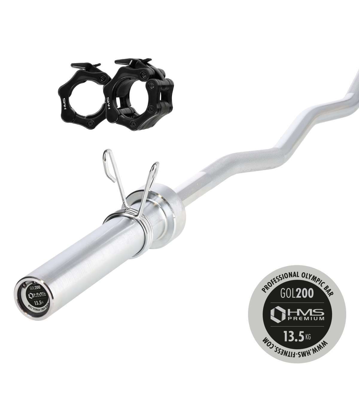 Olympic curl bar GOL200 HMS PREMIUM is made of special chrome-plated steel which has been subject to a hardening process. HMS PREMIUM product is characterized by strength combined with ideal elasticity. Its PSI equals 140000. The set comprises two spring clips.Firm and comfortable grip of the bar is ensured due to accurate knurling. The maximum load equals 200 kilograms. In turn, the diameter of the grip part, which is 28 millimeters, provides great strength and comfort of exercises.Bar chrome plating process is a guarantee of maintaining its appearance for a very long period of use, and it provides the best protection from rust.The two spring clamps included in the set ensure that the weight remains stable on the bar during exercises.Specification:Material: chromed steelFinish of the grip part: knurledAnti-corrosion protection: chromiumSpring clipsNo. of clips 2 pcs.Grip diameter: 28 mmLoad carrying part diameter: 50 mmWeight: 13.5 kgLength: 150 cmMaximal load: 200 kgRemarks:2-year warrantyImporter: Abisal Ltd. | Poland | 41-807 Zabrze | Pyskowicka Street 17 | e-mail: abisal@abisal.plAbisal Ltd.. declares that the products sold by the company are safe and meet the requirements contained in the Act on General Product Safety of December 12, 2003. (Journal of Laws of December 31, 2003)