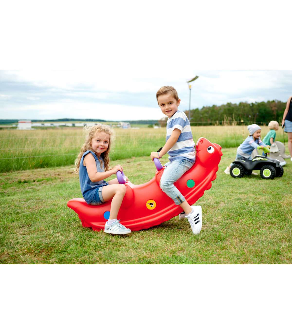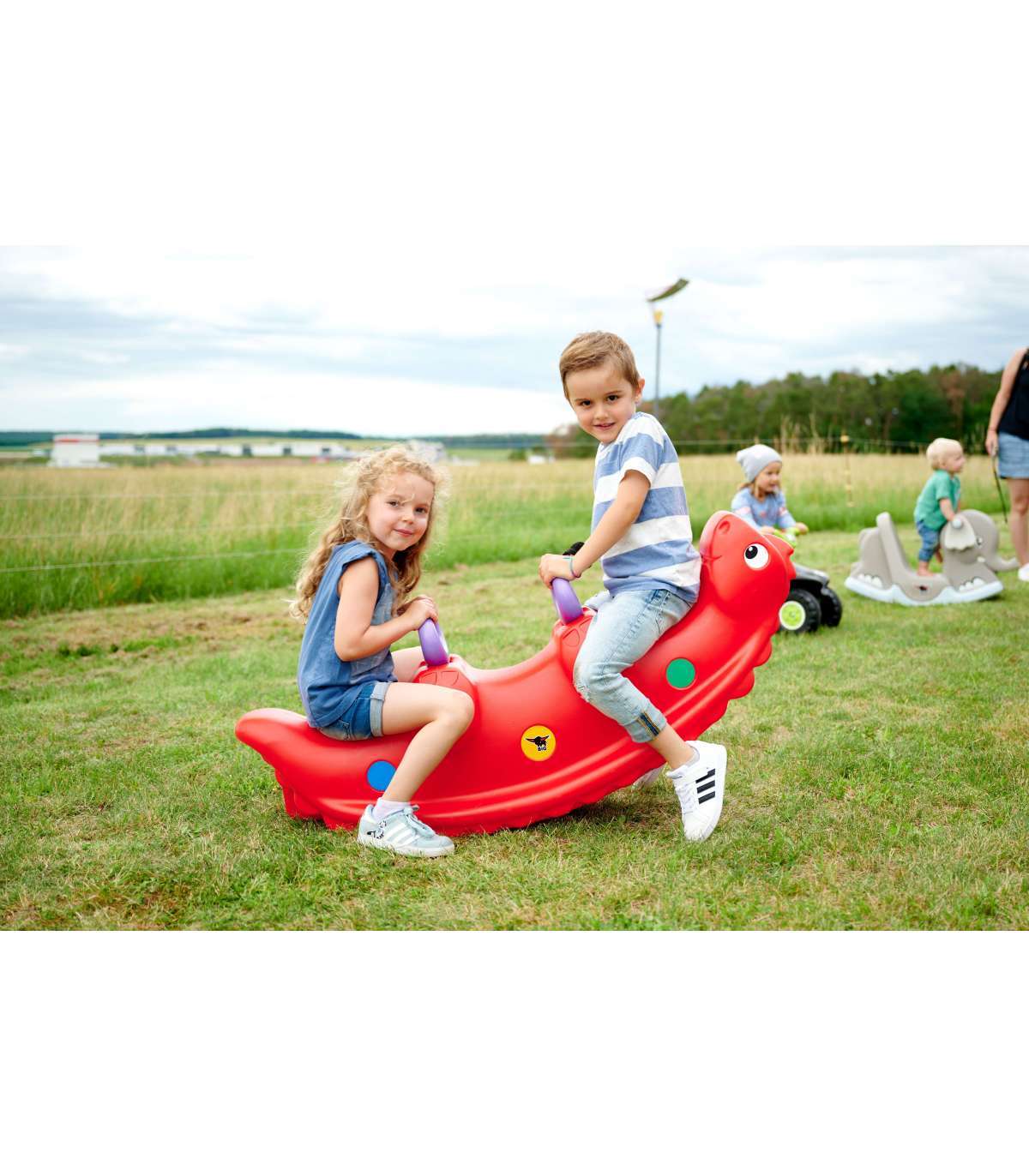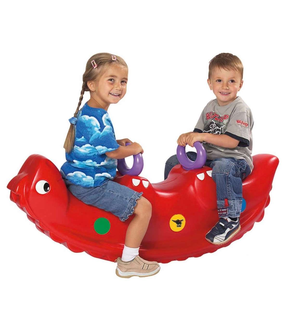 Bujak Wieloosobowy Dinozaur marki BIG jest prawdziwą gwiazdą wśród dzieci! Z bujaka może korzystać maksymalnie troje dzieci jednocześnie, a nawet jedno będzie się świetnie bawić. Gdy dzieci bujają się we dwójkę to dodatkowo rozwija u nich zdolności do współpracy. Solidne uchwyty zapewnią bezpieczeństwo a łuski na grzbiecie dinozaura zapobiegną zbyt gwałtownemu kołysaniu. Bujanie samo w sobie uspokaja dziecko oraz rozwija zdolności motoryczne ciała, co jest idealne dla prawidłowego rozwoju. Z huśtawki można korzystać zarówno w domu jak, i na zewnątrz!