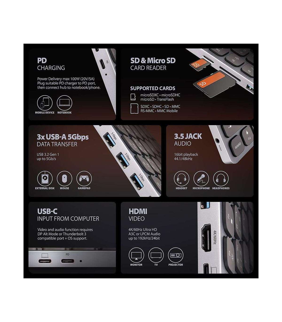 Multi-port USB-C 5Gbps hub with keyboard. HDMI, PD and 3 USB-A ports. USB-C cable 60 cm.