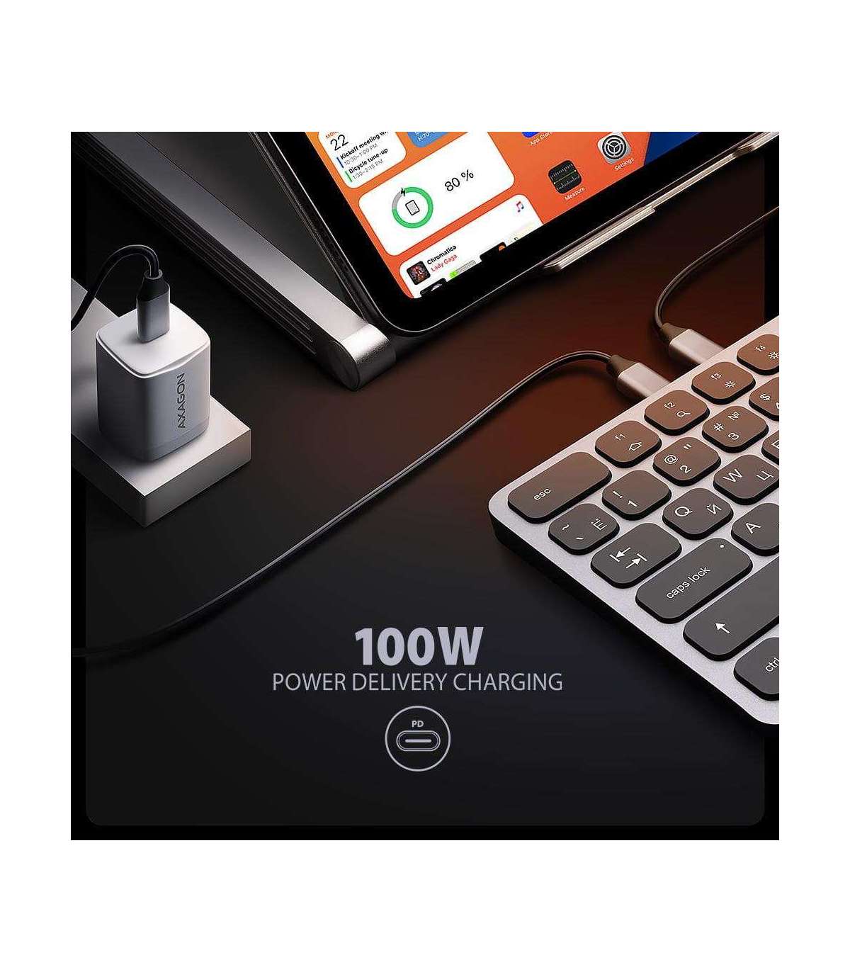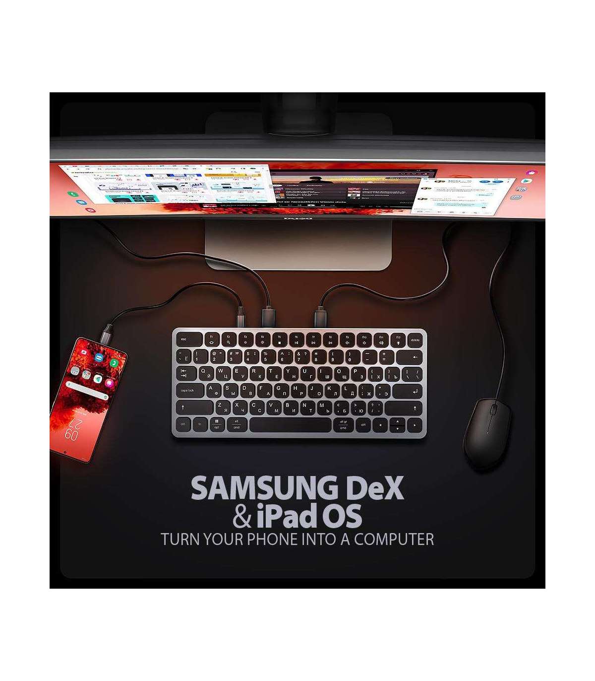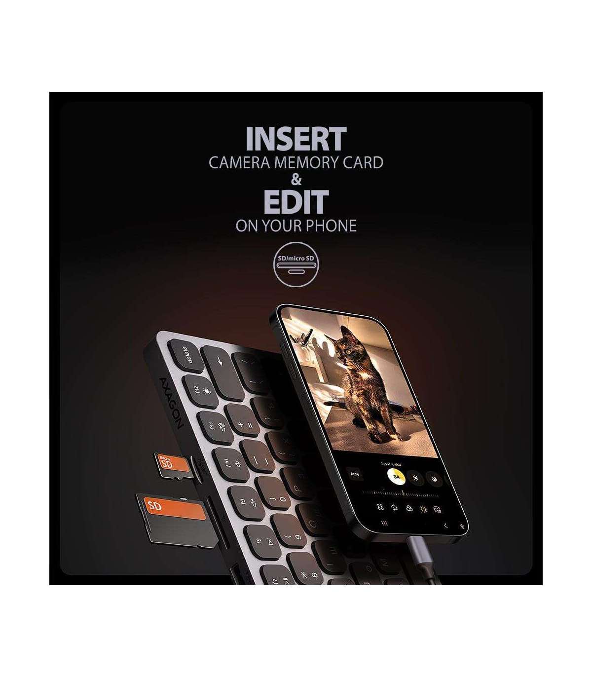 AXAGON HMC-KB-CRL KEYBOARD hub turns your phone, tablet or mini-laptop into a full-fledged computer workplace. You connect your mobile device to the 9in1 docking station via the supplied 60 cm long cable. In no time, you have an integrated keyboard, SD and microSD card reader, and connectors for connecting an external monitor, three USB devices, headphones or headset, and Power Delivery power. However, it is necessary that the USB-C port of your mobile device supports video output (DisplayPort Alternate Mode) and Power Delivery.