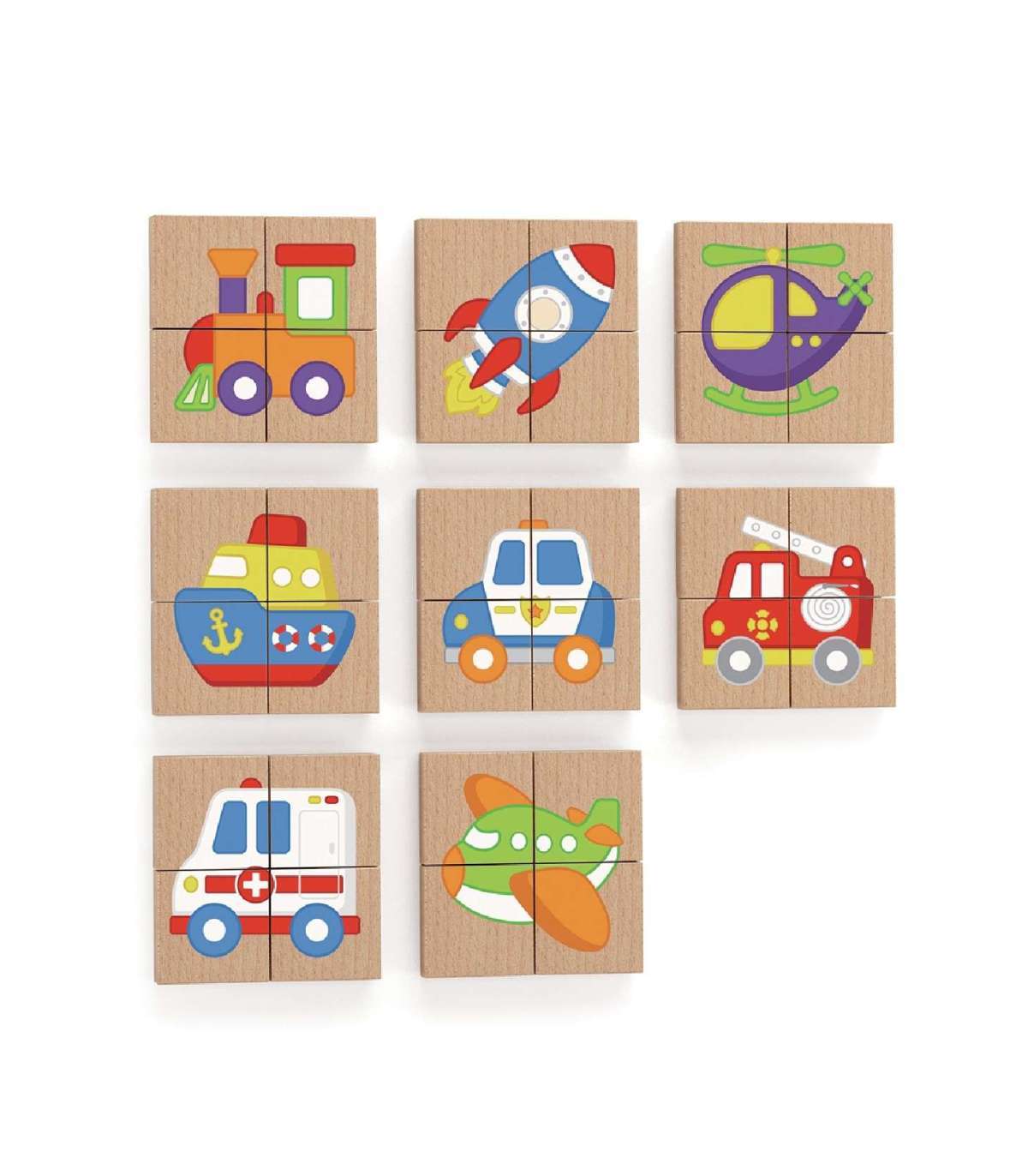 Iga pilt koosneb 4 klotsist, mis ühendatuna moodustavad terviku. Tänu võimalusele neid tahvlile kinnitada võivad need kujundada pildi osa või saada inspiratsiooniks sarnaste sõidukite joonistamiseks. Klotsid on valmistatud puidust ja värvitud mittetoksiliste värvidega. Need on laste jaoks täiesti ohutud.