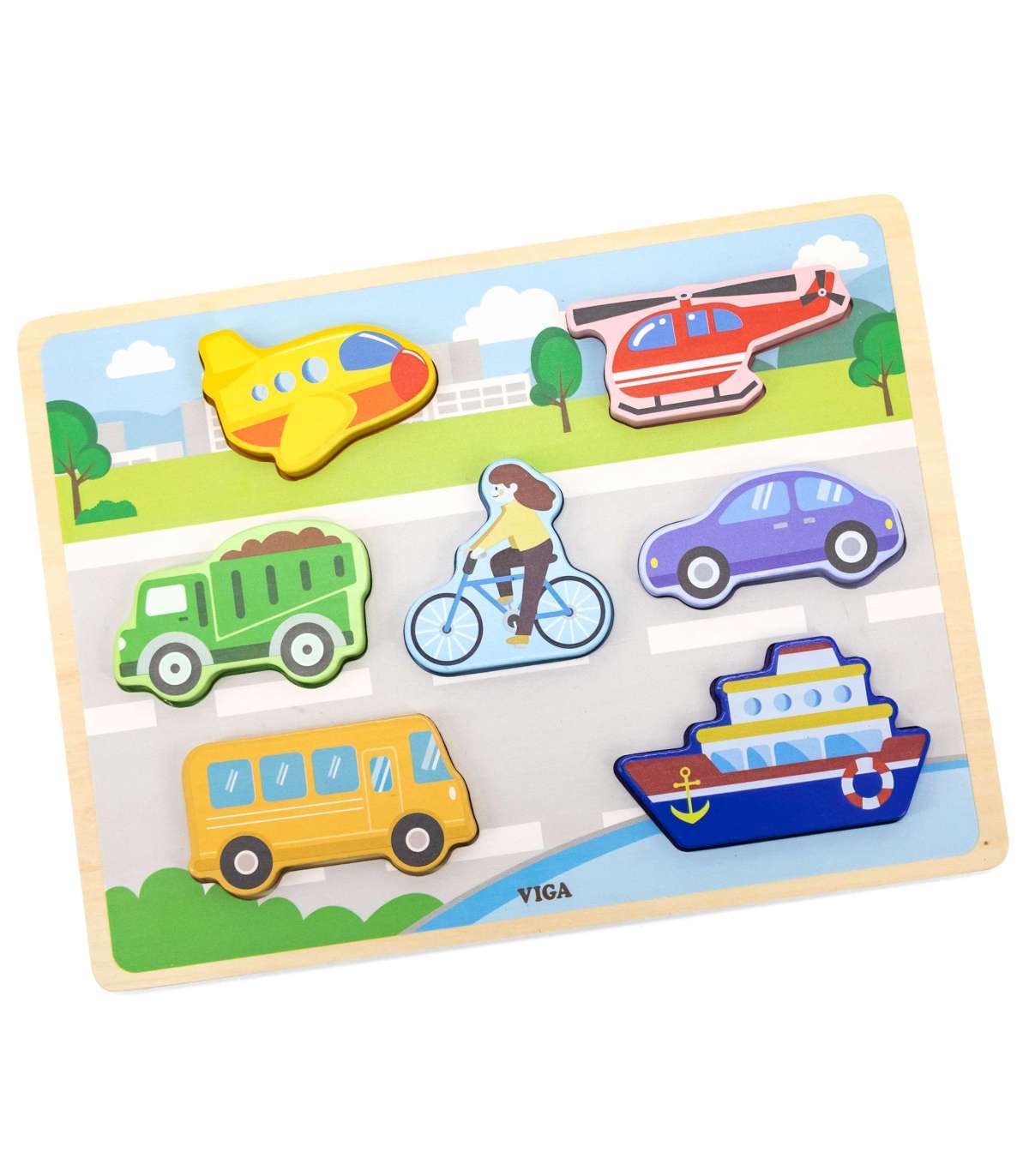 Puidust pusle brändilt VIGA transporditeemal. Komplekt sisaldab värvilist plaati ja 7 elementi. Mäng sei neb sõidukitükkide sobitamises vastavatesse kohtadesse värvilisel alusplaadil, kus lihtsustamiseks on kujutatud puuduolevate osade joonised. Selline mäng aitab arendada käeliigutuste täpsust, ning parandada nägemis-liikumise koordinatsiooni, samuti treenida mälu, loogilist mõtlemist ja keskendumist. Tänu tükkide paksusele saab puslet kasutada ka muudes mängudes figuuridena.