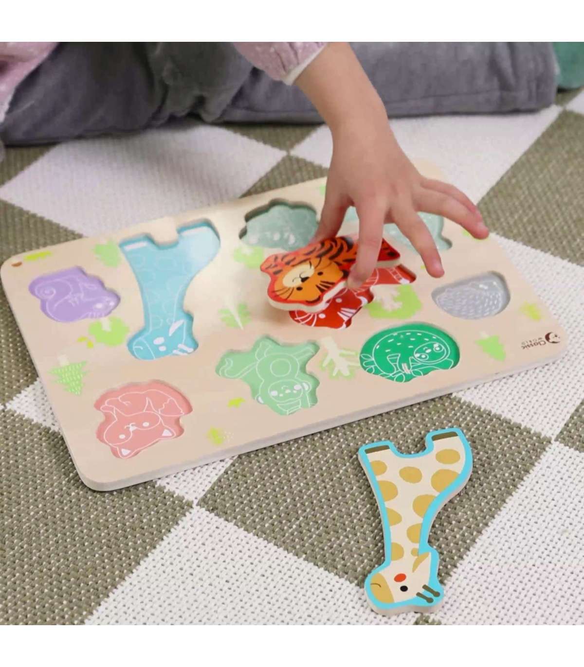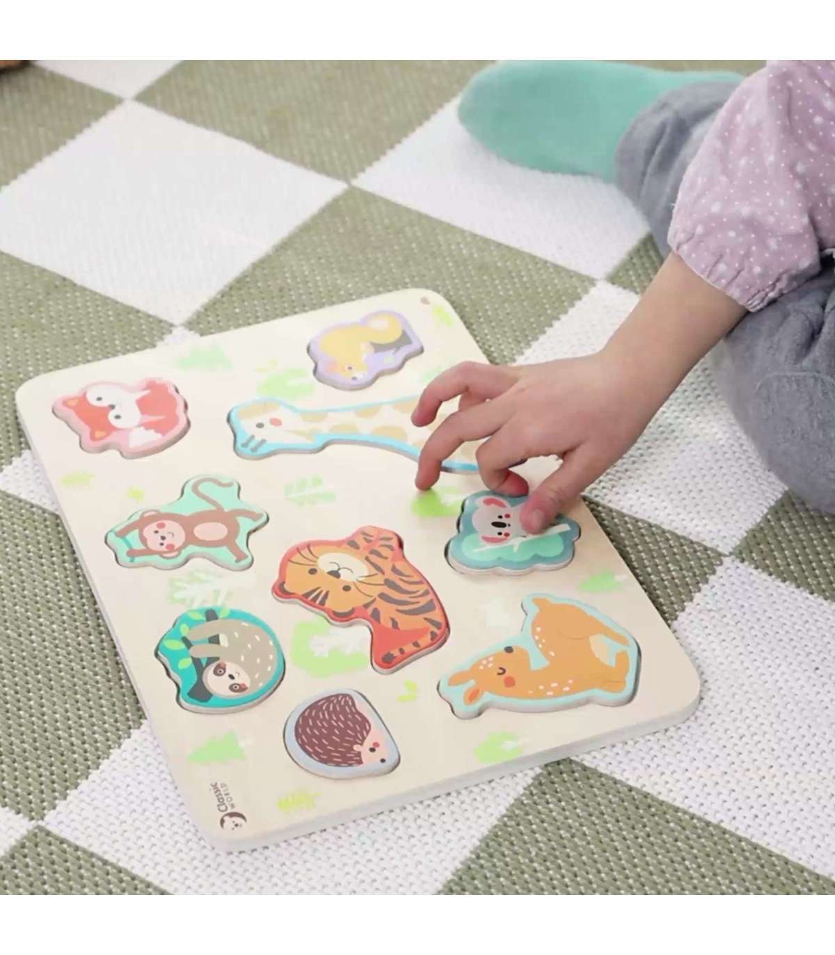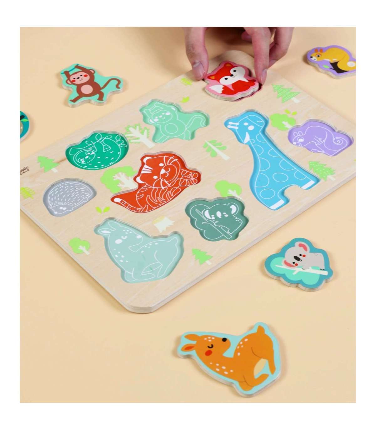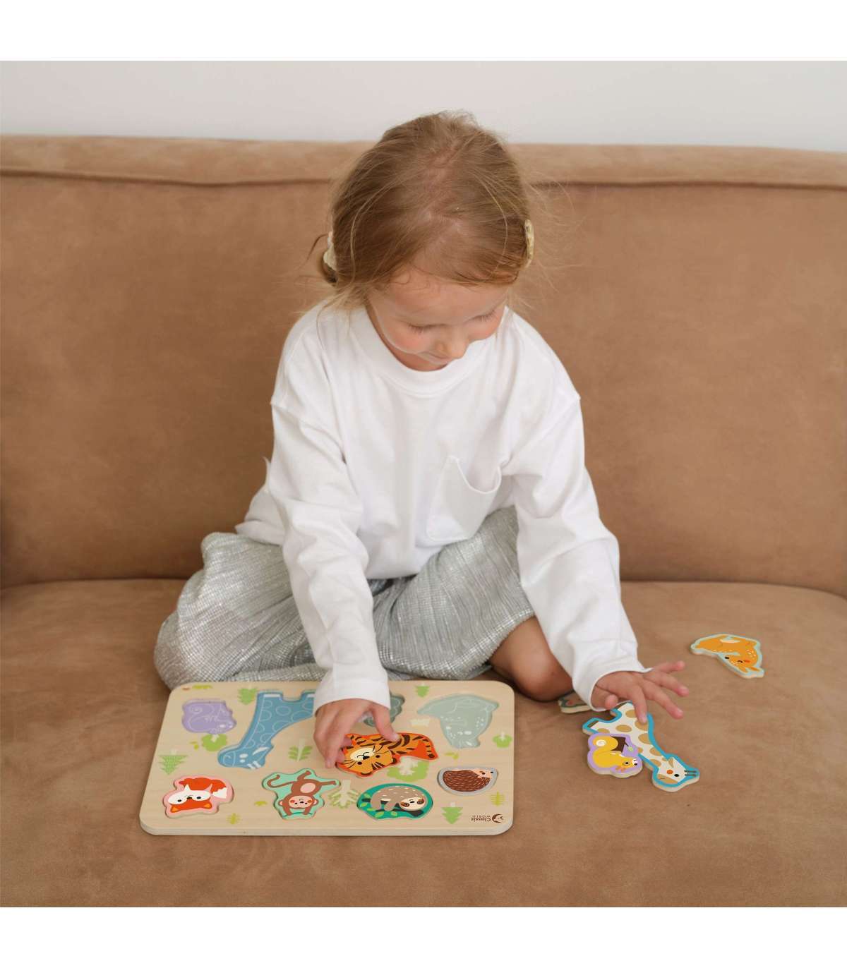 Puidust loomade pusle on lastele hariv mänguasi. Väike laps sobitab värvikirevaid loomi, näiteks kaelkirjakut või rebast, mängulaual olevatele metsateemalistele kohtadele.