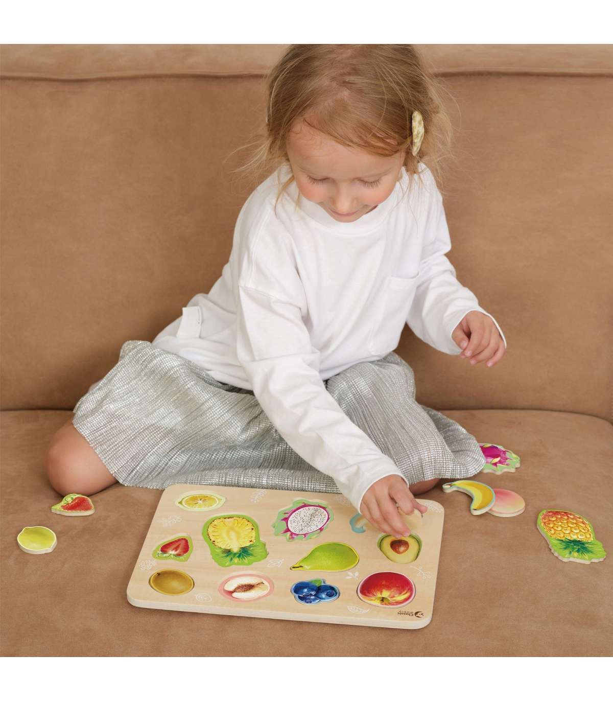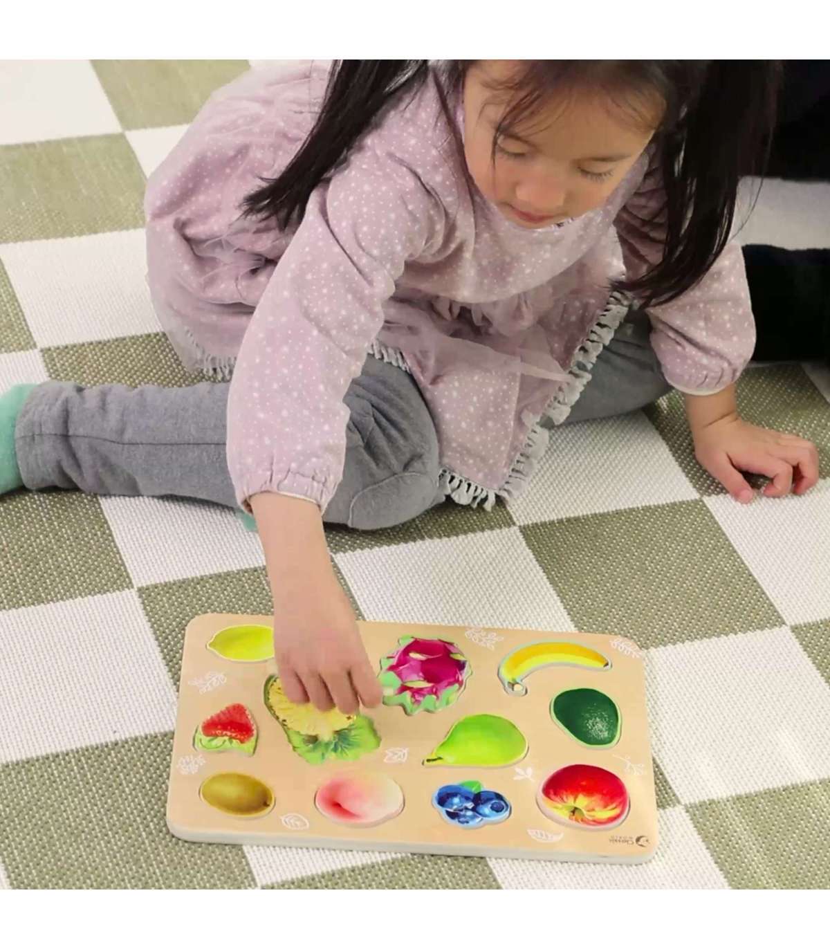 Värviline pusle aitab lapsel arendada kujundite ja värvide äratundmist, loogilist mõtlemist ning käe-silma koordinatsiooni. Väike laps õpib tundma erinevaid puuvilju, sobitades need tahvlile vastavatesse kohtadesse.