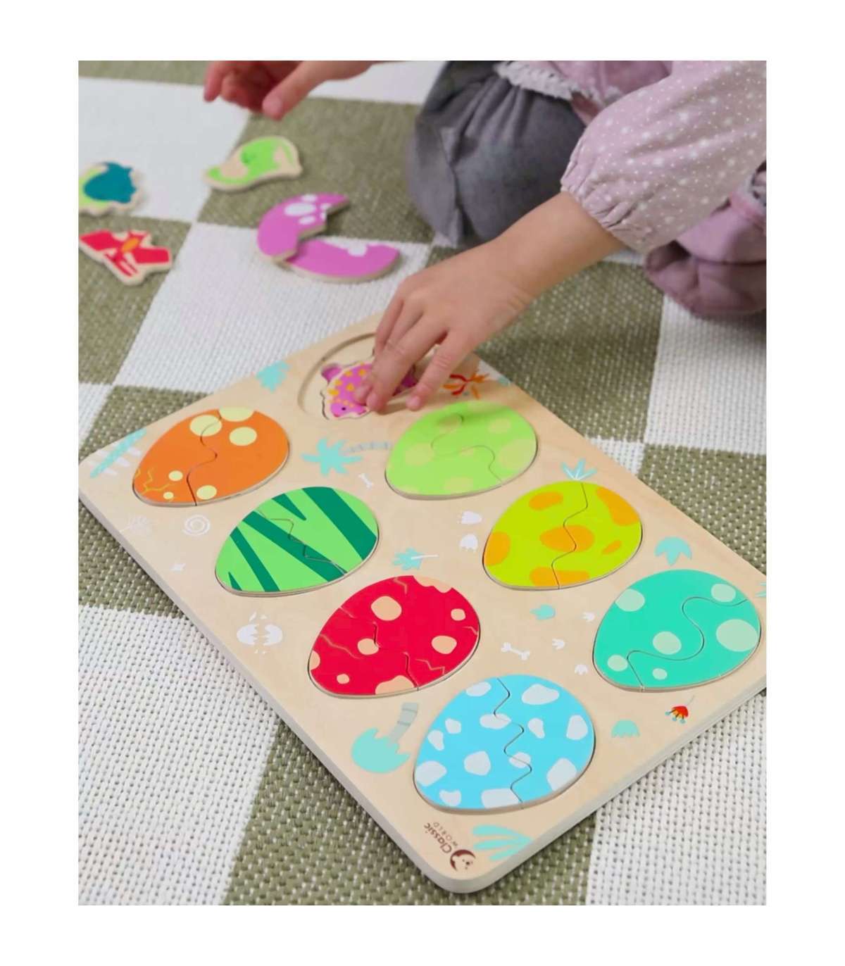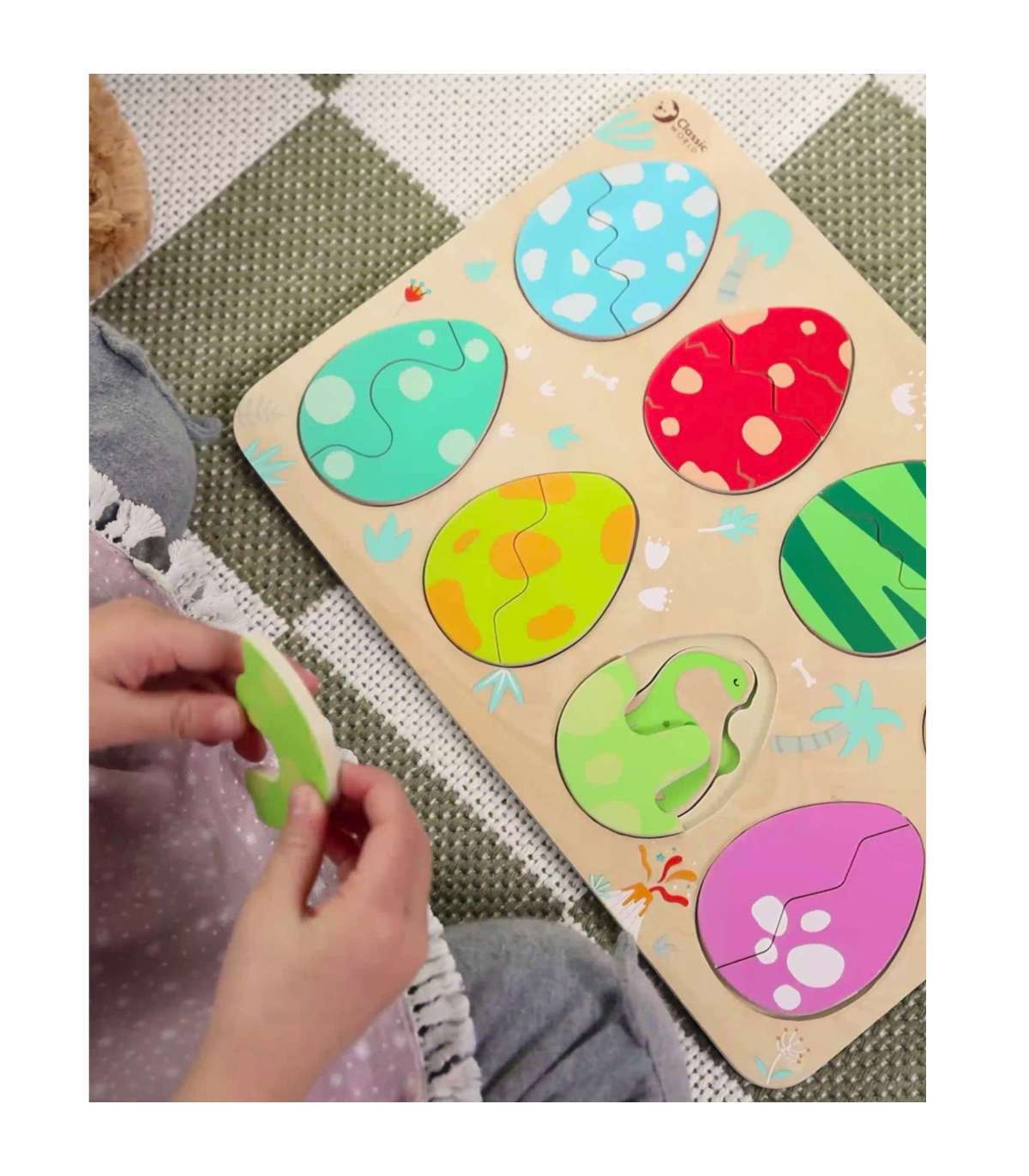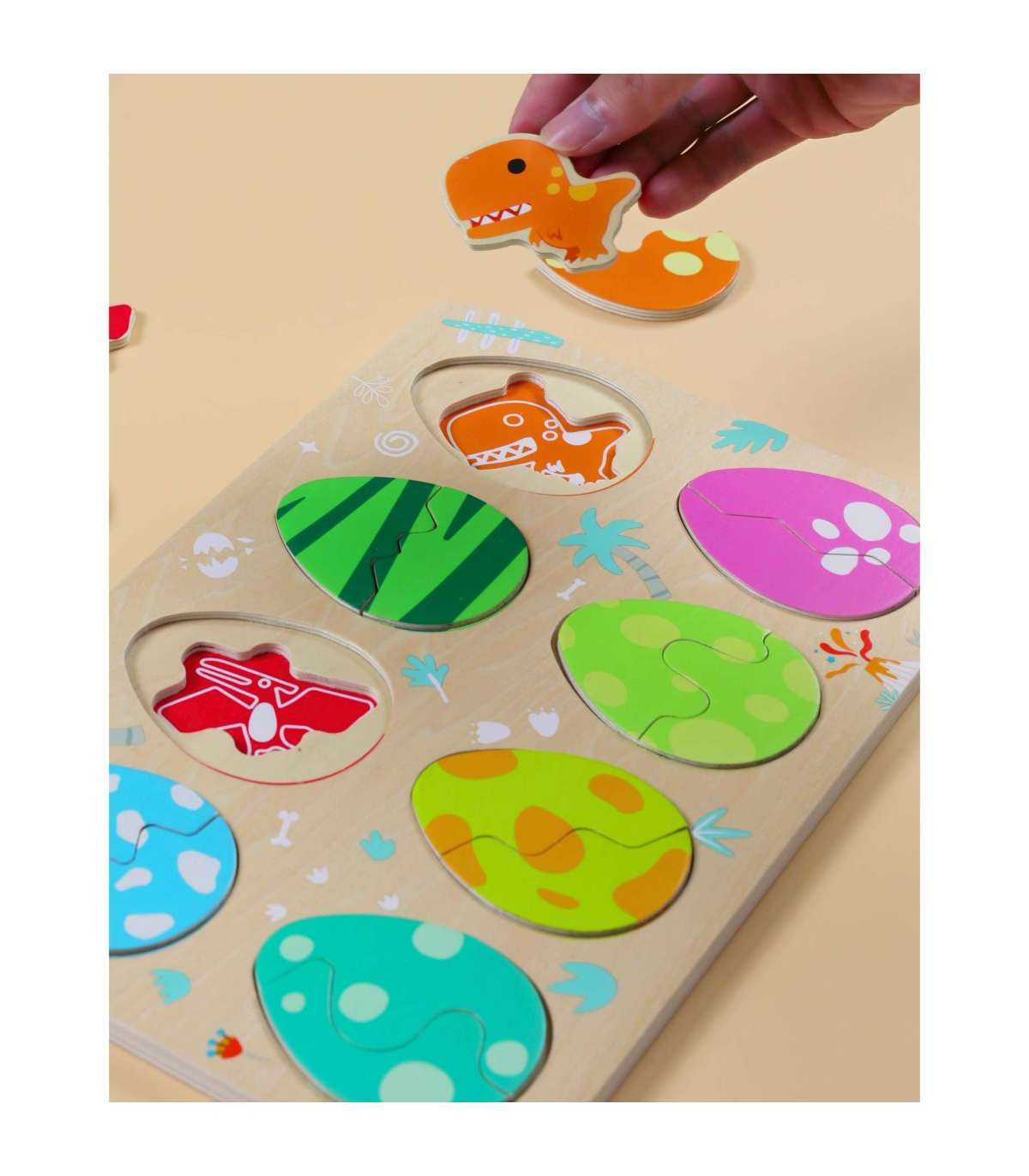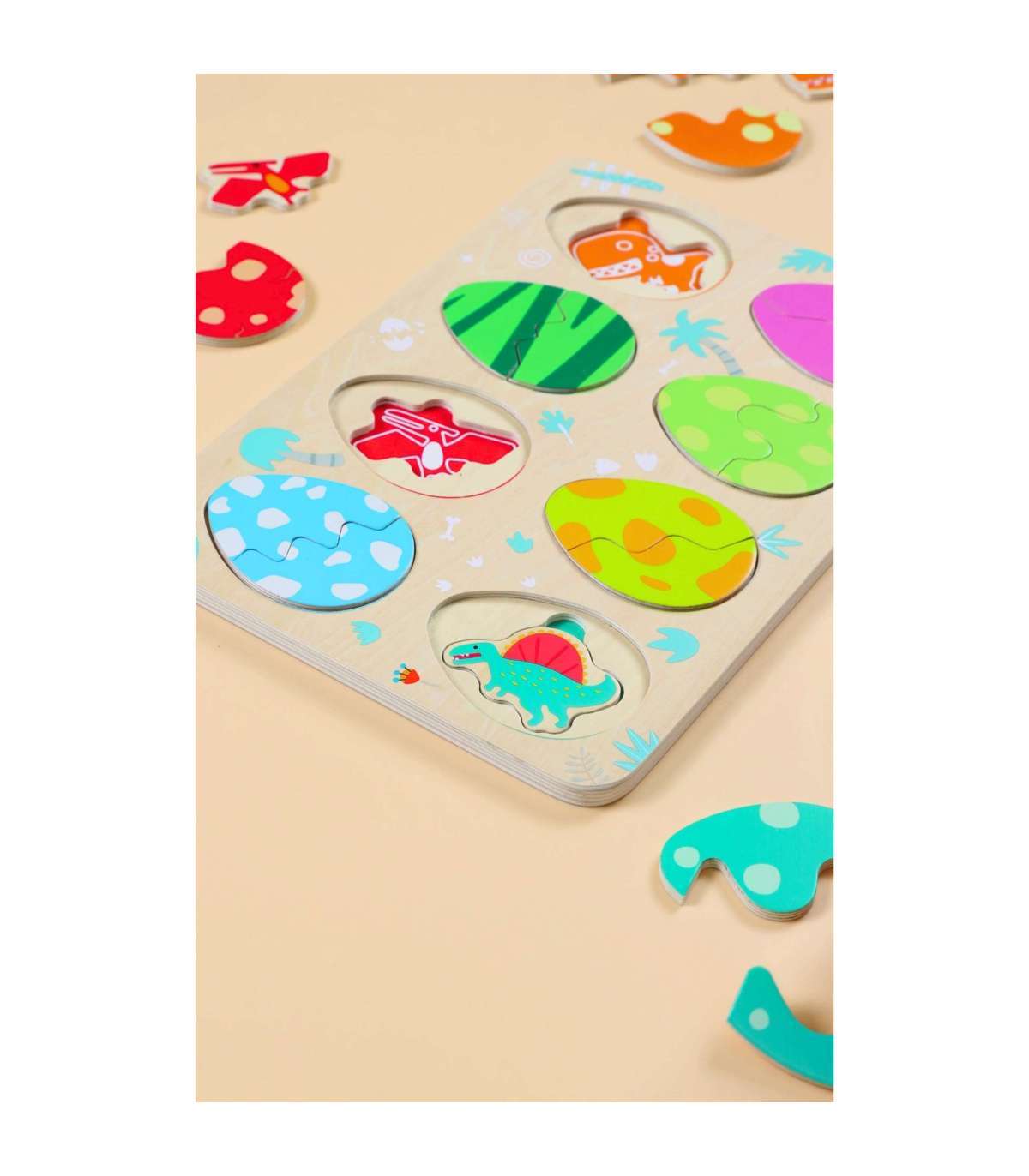Kolmekihiline konstruktsioon võimaldab sobitada mune nende all peidetud dinosaurustega ning alumisel kihil avastada lihtsaid joonistusi, mis aitavad dinosauruseid sobitada nende vastavate paikadega. Mänguasi toetab kujundite ja värvide õppimist, loogilist mõtlemist ja loovust lõbusal viisil.