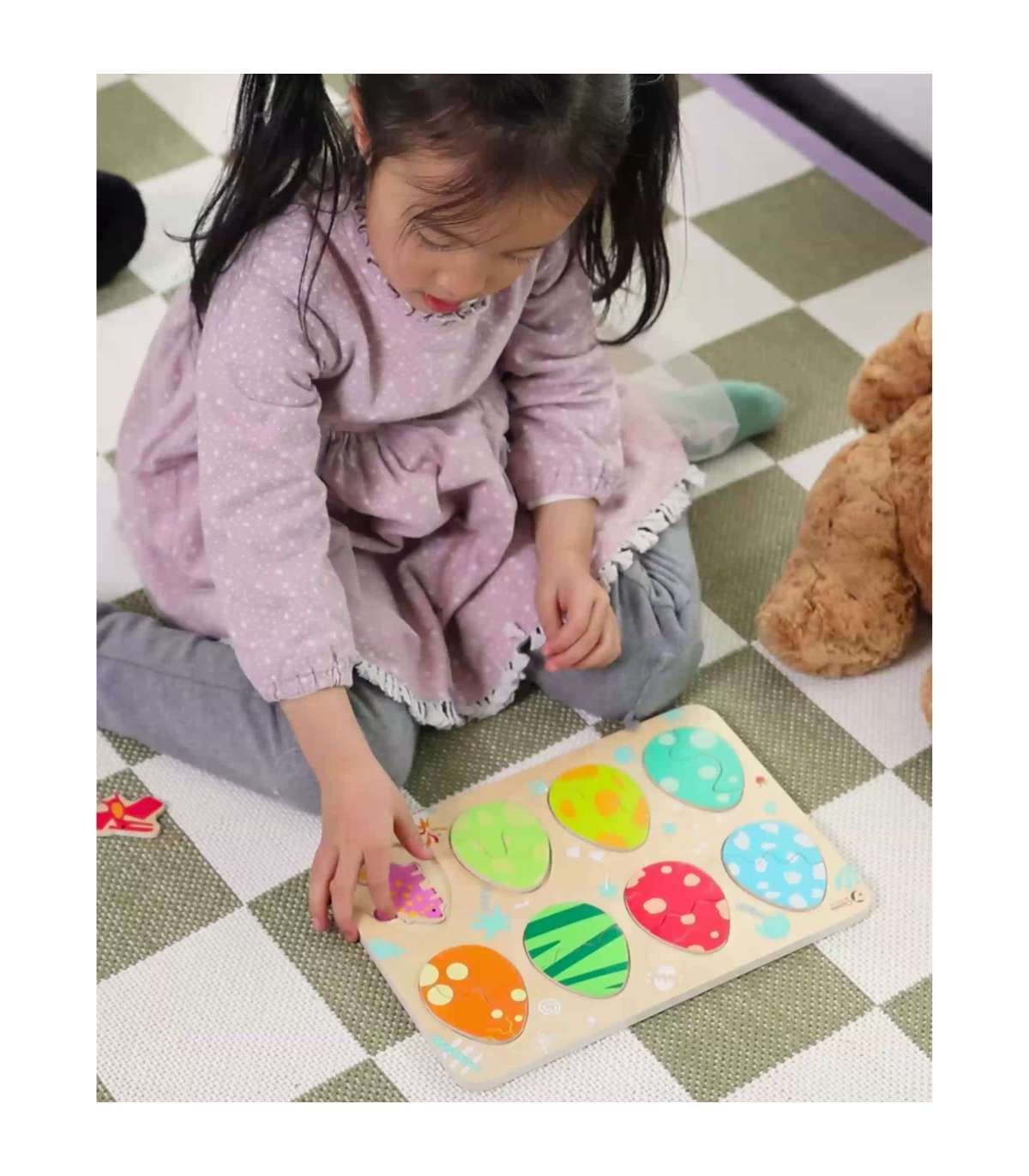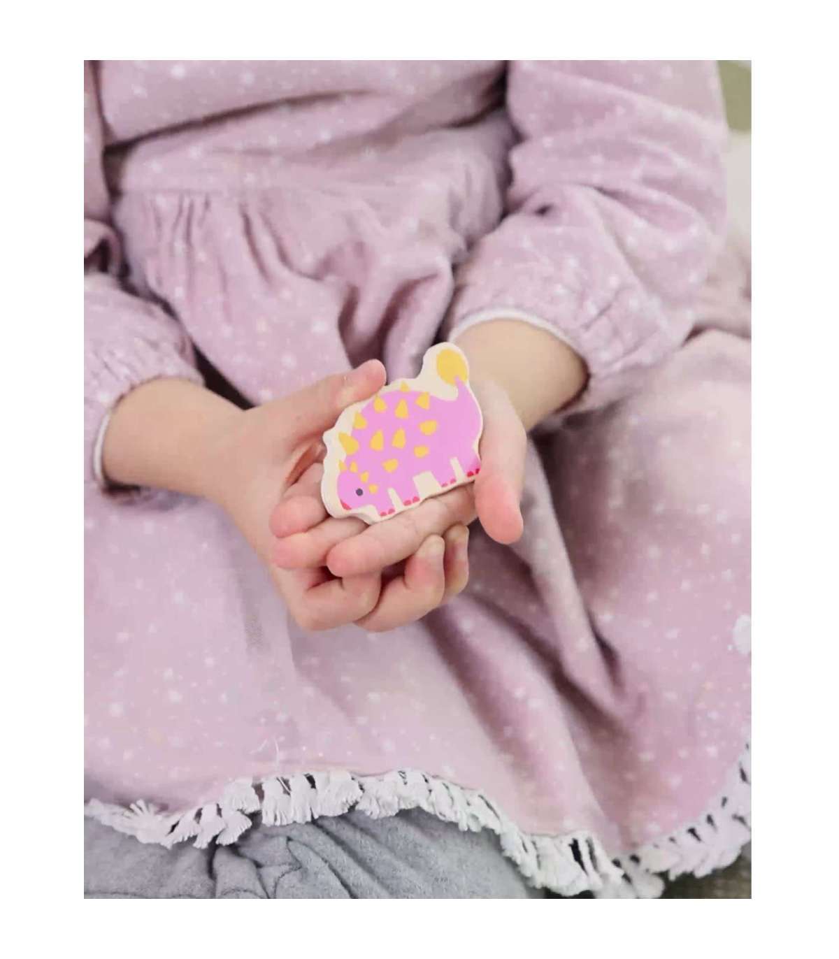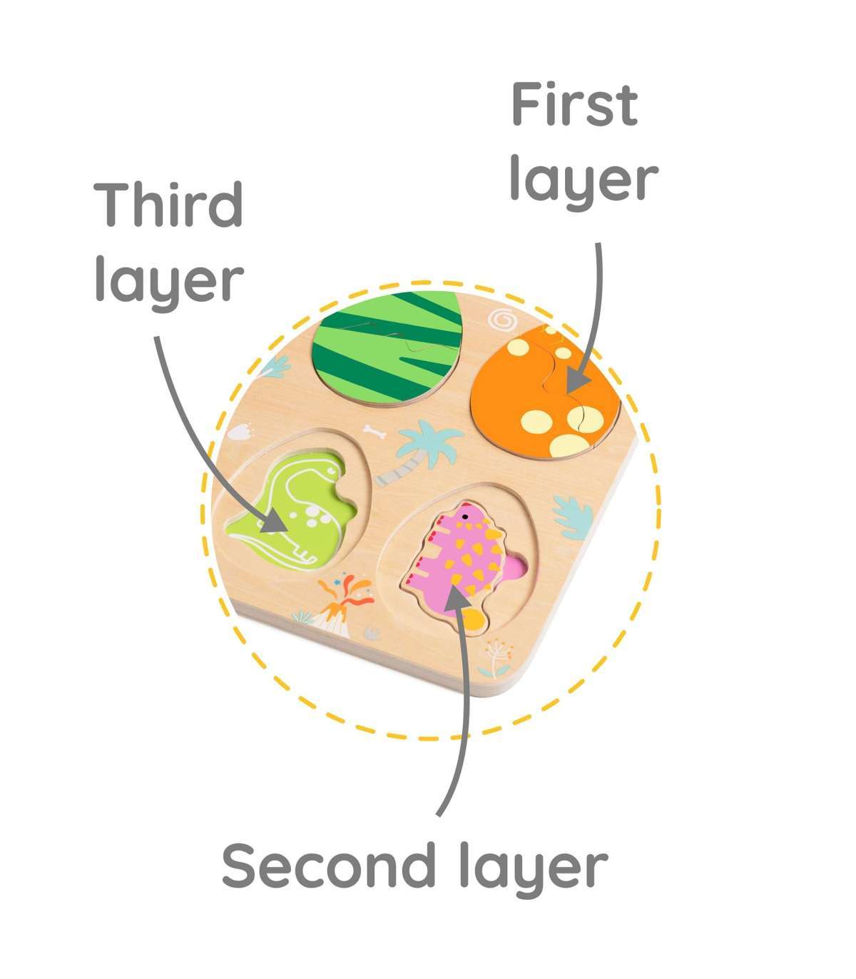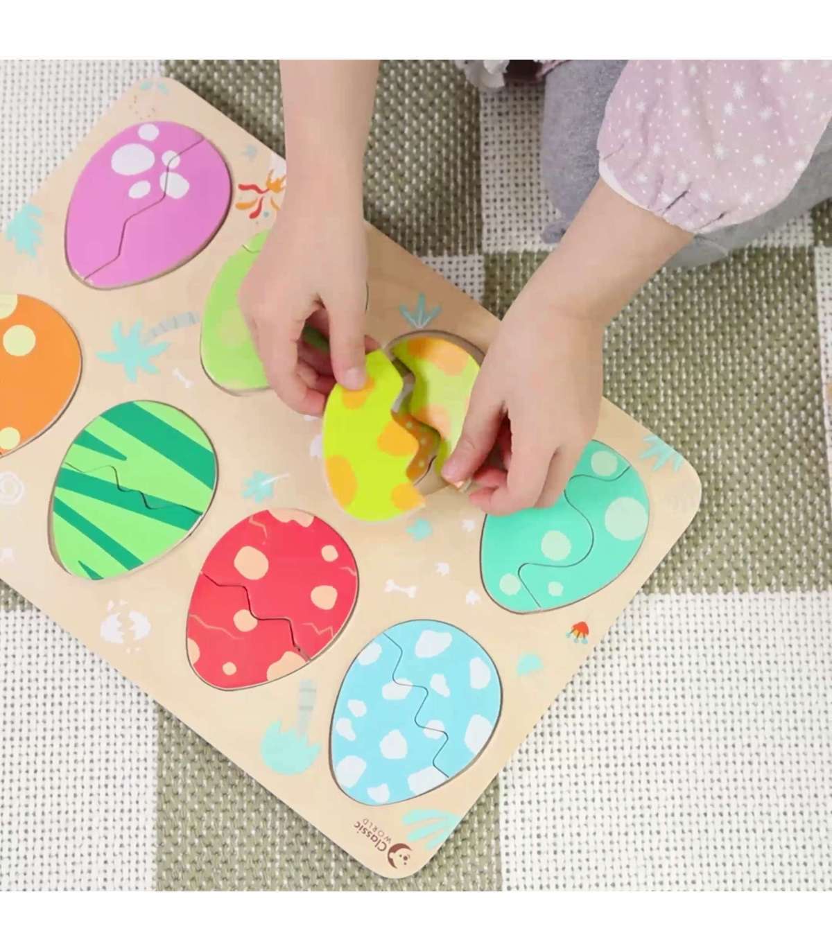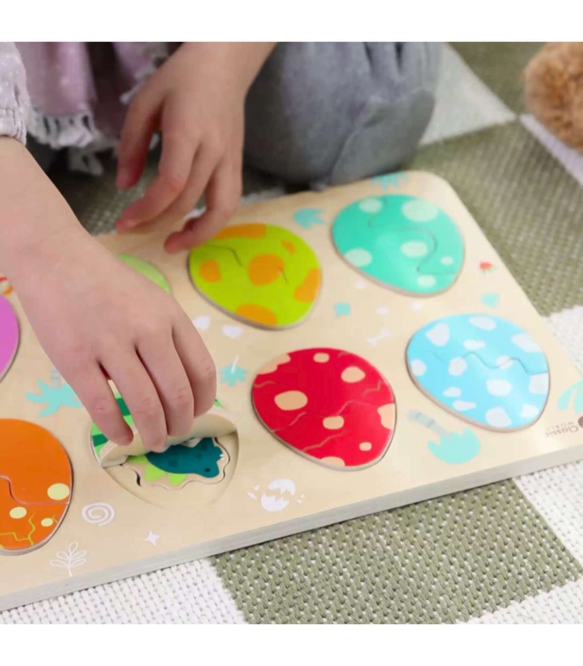Kolmekihiline konstruktsioon võimaldab sobitada mune nende all peidetud dinosaurustega ning alumisel kihil avastada lihtsaid joonistusi, mis aitavad dinosauruseid sobitada nende vastavate paikadega. Mänguasi toetab kujundite ja värvide õppimist, loogilist mõtlemist ja loovust lõbusal viisil.