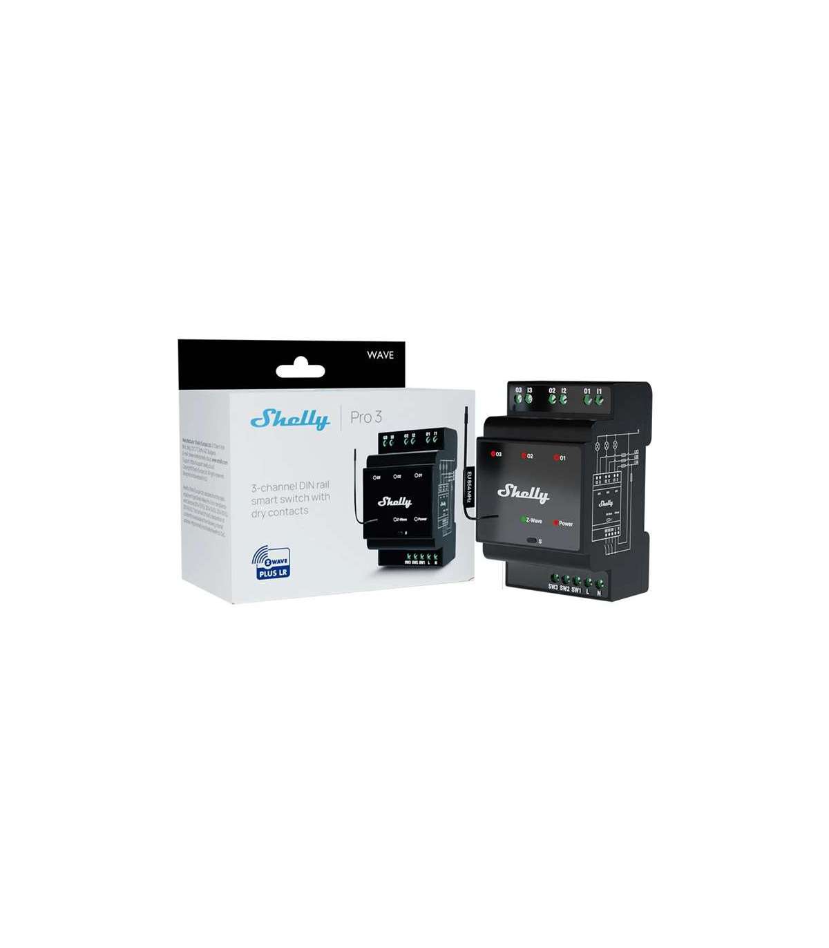 The Shelly Wave Pro 3 is a 3-channel DIN-rail mounted relay that supports up to 48 amps and is designed for professional and commercial applications. With Z-Wave and Z-Wave Long Range technology, it offers a range of up to 1 km, enabling reliable operation even in large buildings. It supports control of 3 independent circuits via potential-free contacts, making it compatible with a wide range of voltages and devices. It also enables scheduling, scenes and automation - all remotely via a compatible Z-Wave gateway. The device is energy efficient and great for residential, hotel, office and industrial installations.