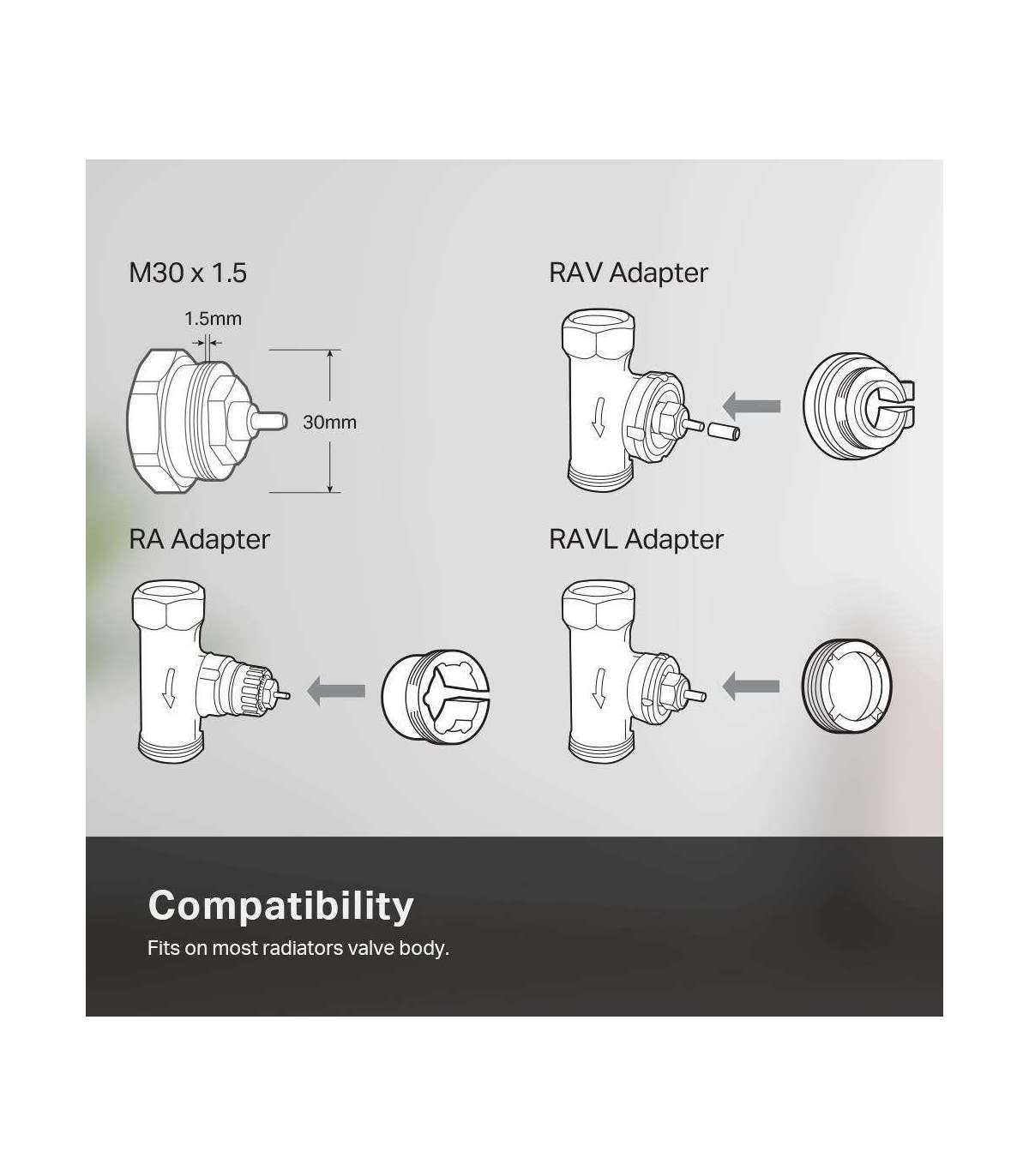 Versatile Compatibility – Fits on most radiator valve body thread (M30x1.5) and the three adapters(RA, RAV & RAVL) included allow more compatibility.