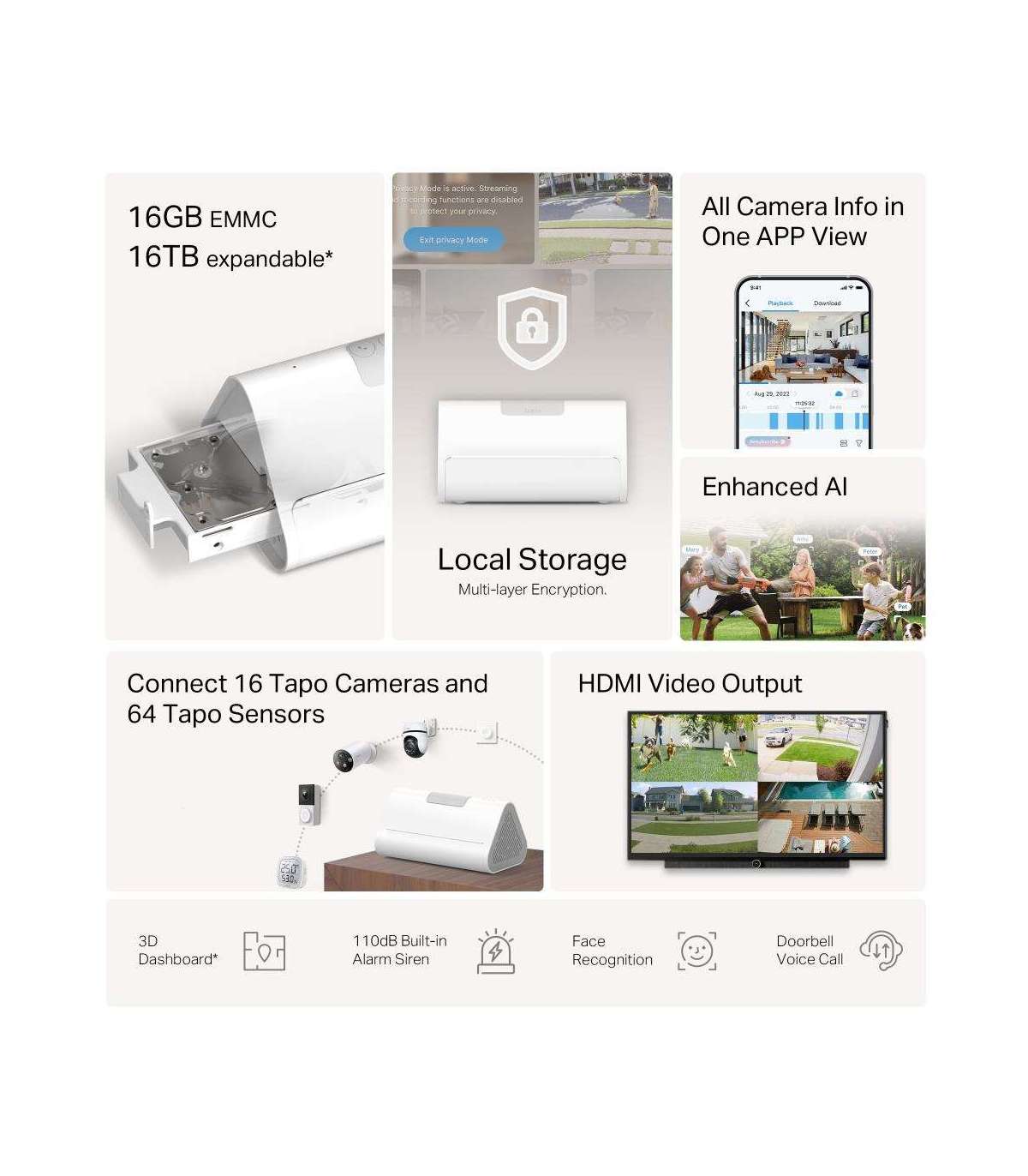 - Unified Smart Home Management: Unify the connection and management of your home's cameras on a single device. Tapo H500 can connect and manage up to 16 Tapo cameras and 64 Tapo Sub-G sensors.