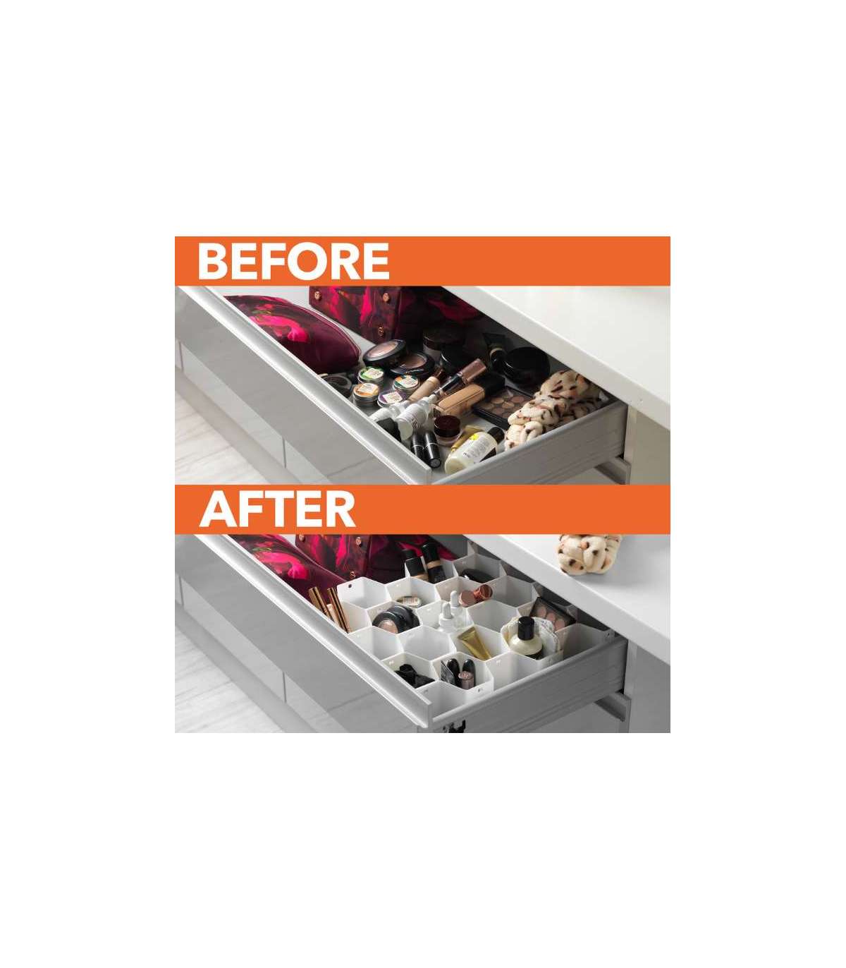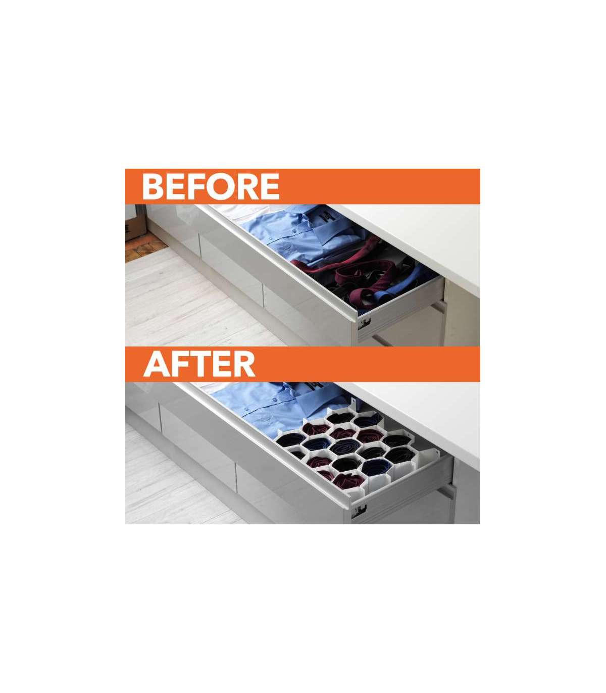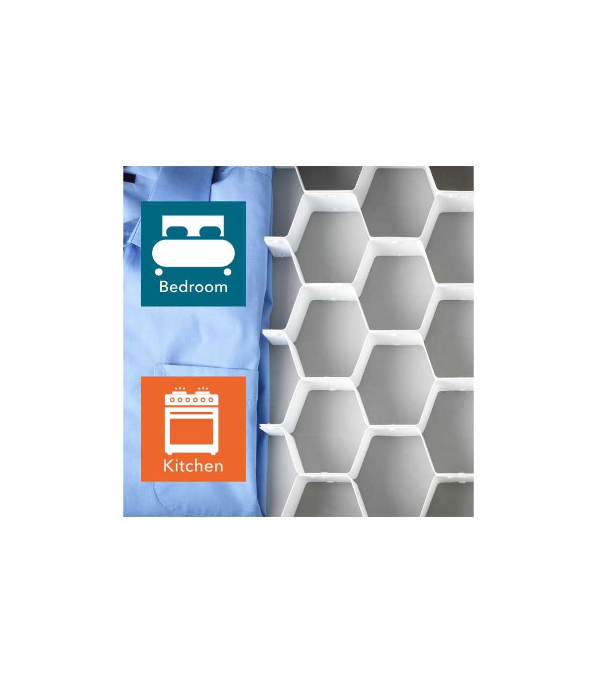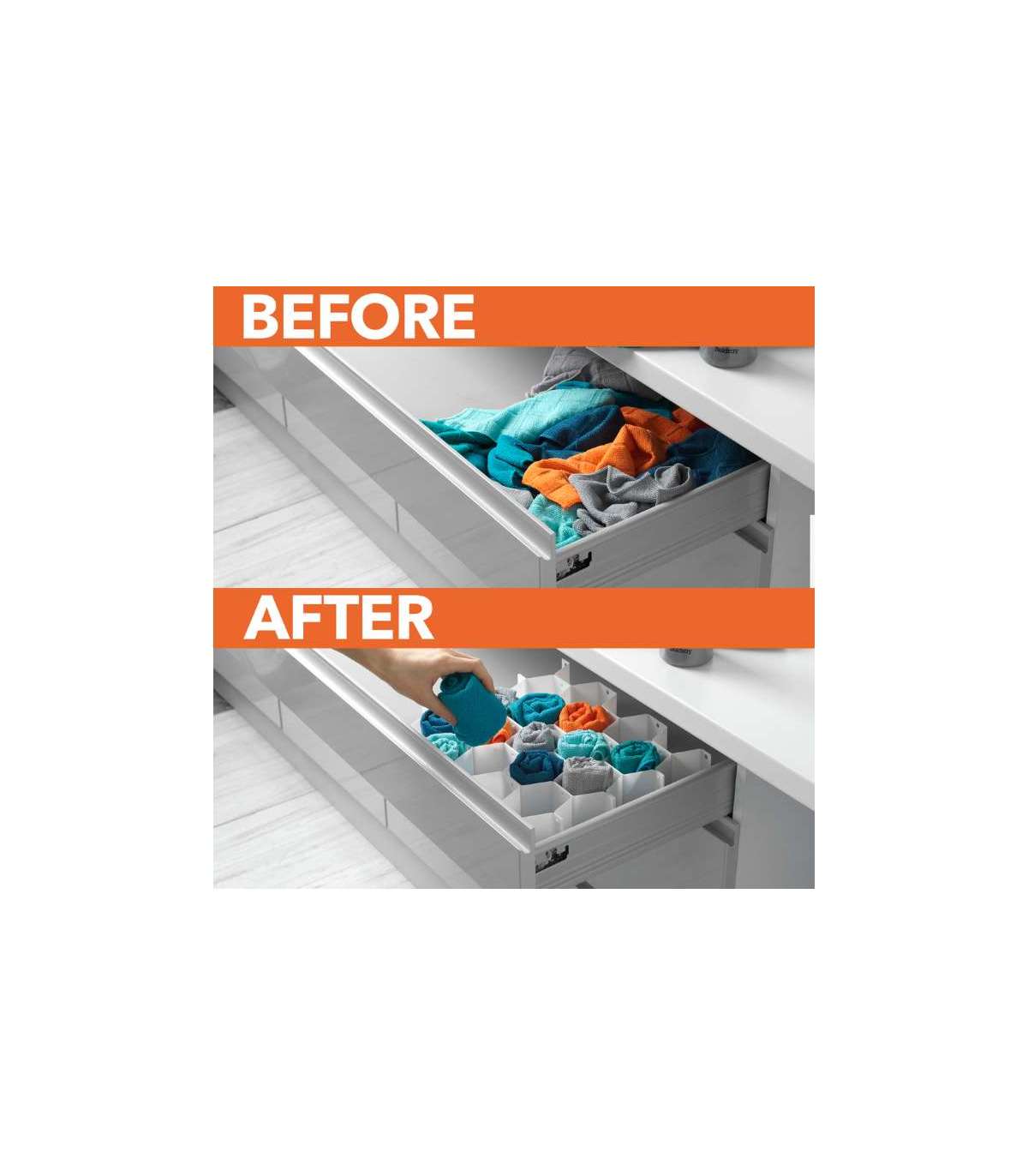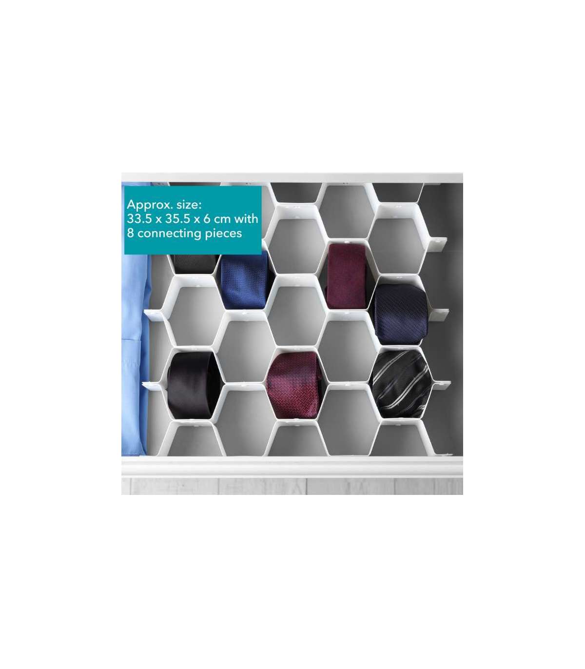 Vastupidavast ja painduvast materjalist valmistatud kärgstruktuuriga korraldaja kohandub hõlpsalt erinevate stiilide ja suurustega sahtliteks.
