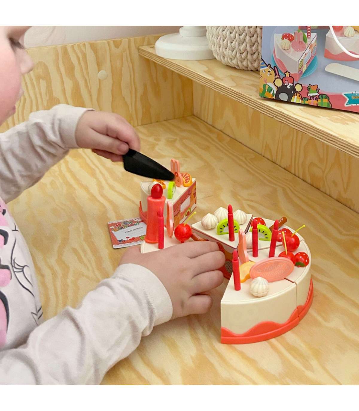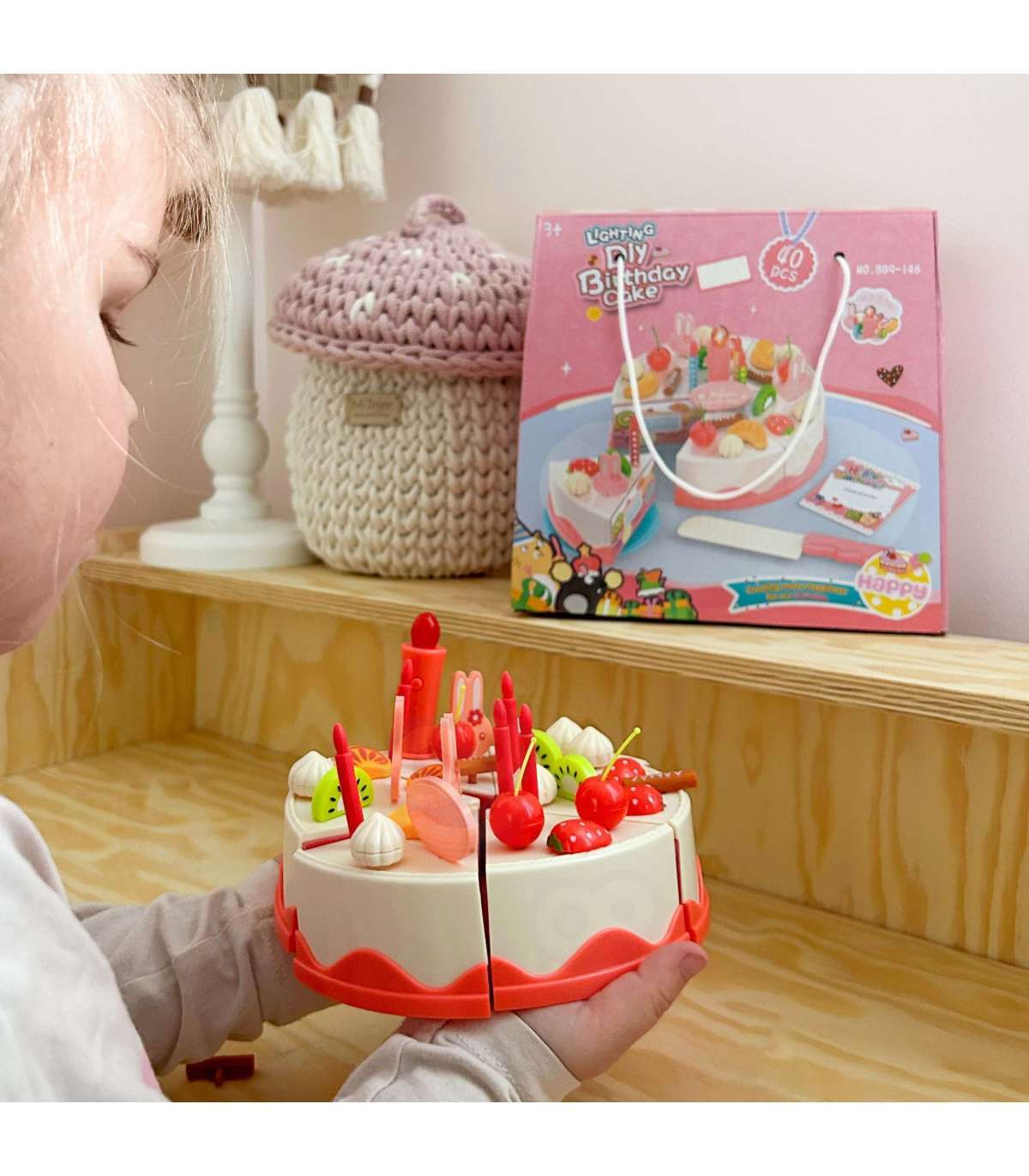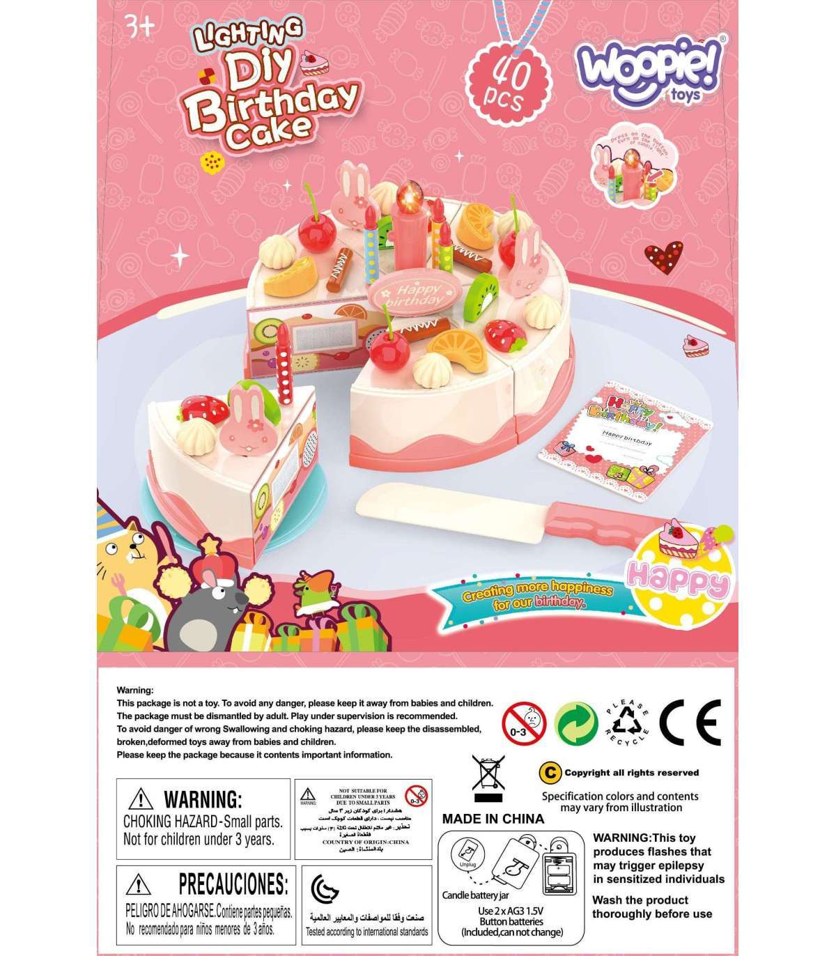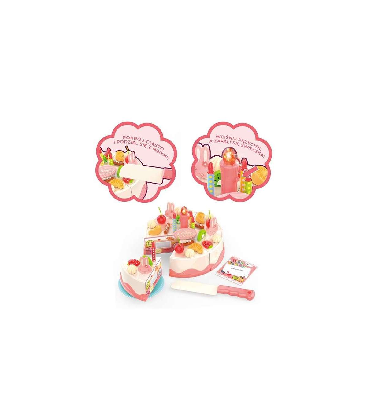 Sünnipäevakook tuntud kaubamärgilt Woopie on ideaalne valik sõpradega kohtumiseks. Komplekt on ideaalne atribuut iga väikese perenaise või peremehe jaoks, et korraldada unustamatu pidu. Komplektil on ilusasti kaunistatud kook, mida saab lõigata 6 tükiks ja pakkuda külalistele. Laps saab kaunistada kooki vastavalt oma ideedele tänu komplekti kuuluvale küünlale, jänku-kujulistele kaunistustele ja puuviljadele. Kooki keskel on küünal, mis süttib nupu vajutamisel. Selle komplektiga lõbu ei lõpe!