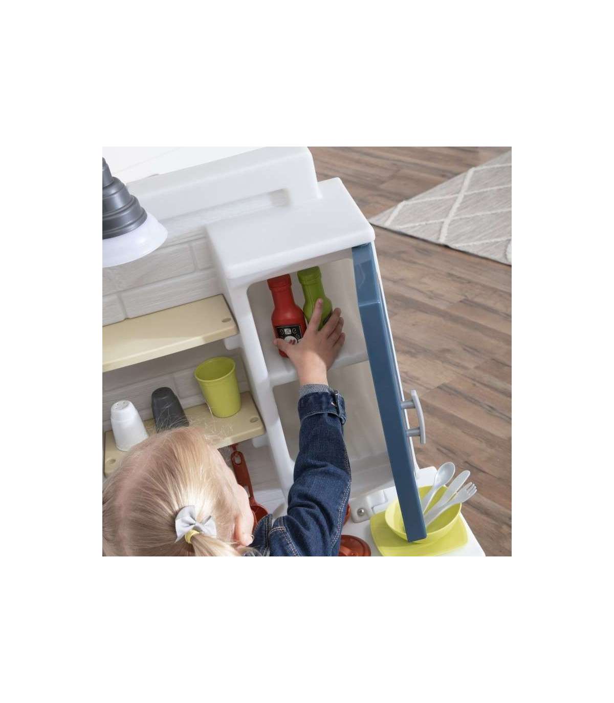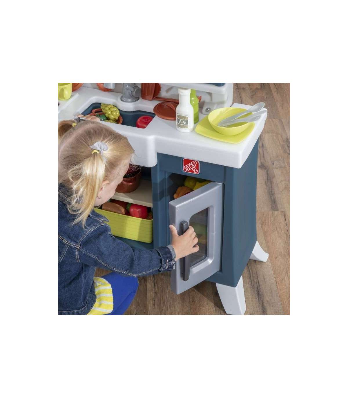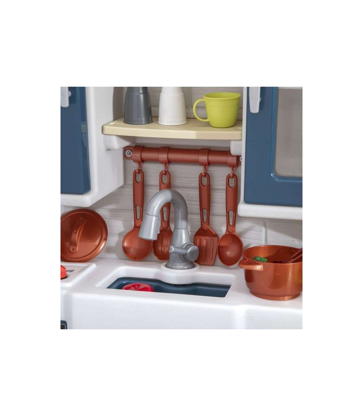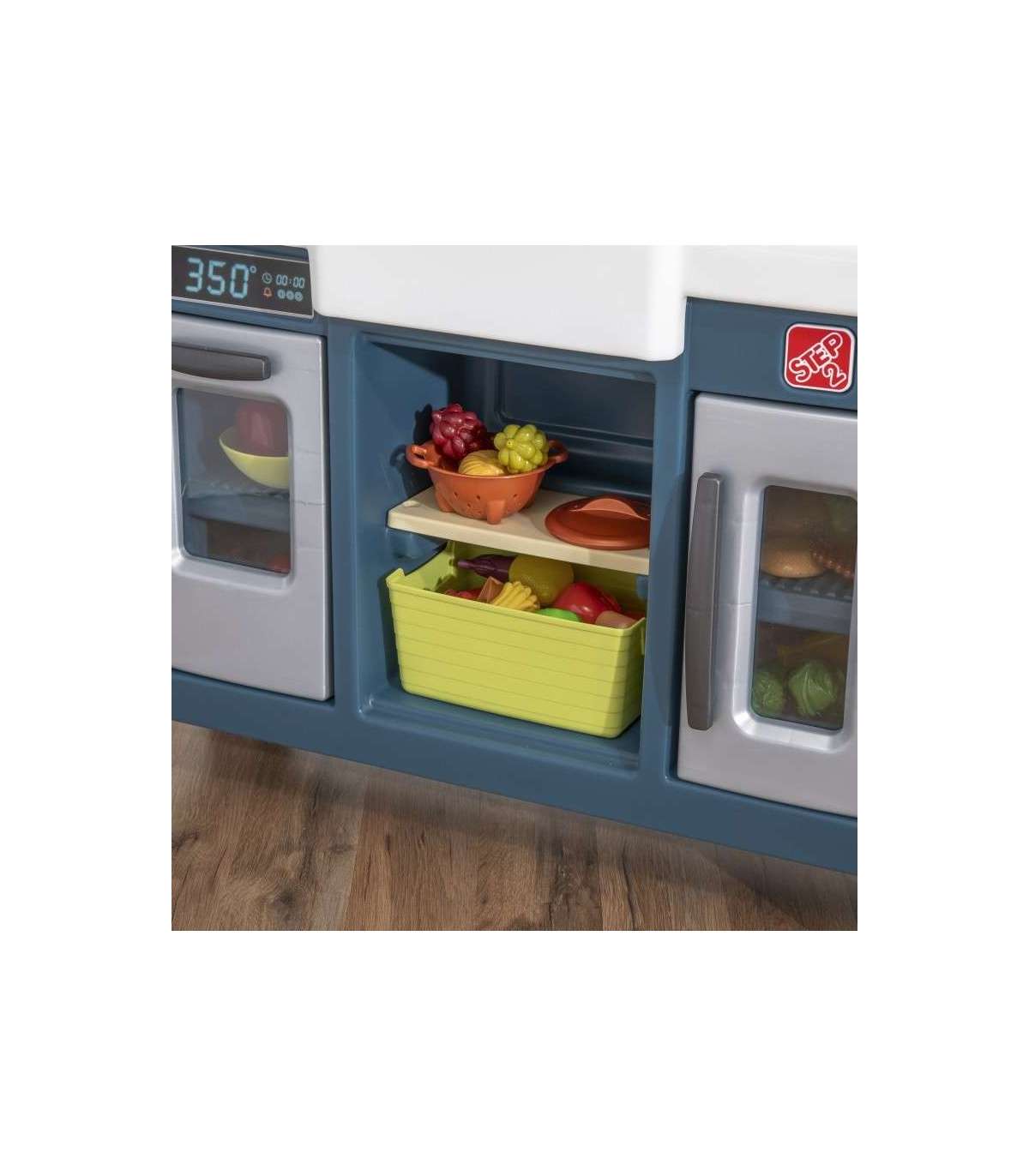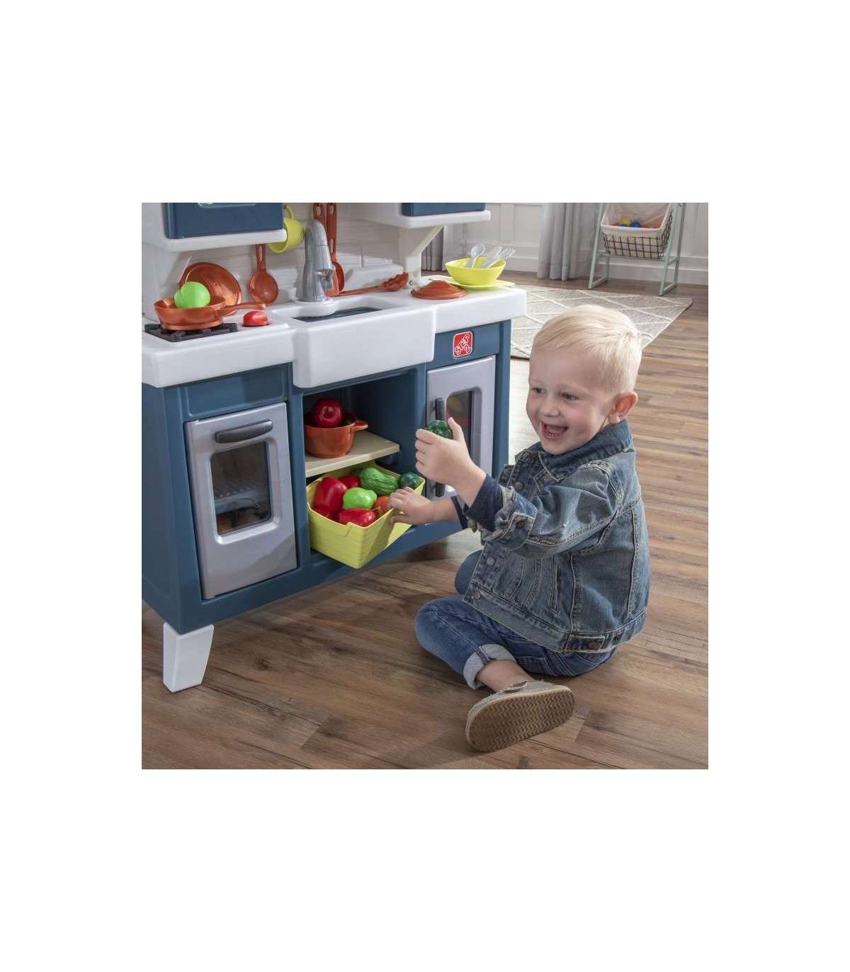 Step2 laste mänguköök iseloomustab realistlikku maalähedast stiili, pakkudes kaasaegset funktsionaalsust ja palju hoiuruumi! Valmista toite suurel kunstgraniidist tööpinnal. Ulatu üleskappide riiuliteni kruuside ja taldrikute jaoks. Mänguasjal on talumajastiilis kraanikauss koos segistiga ning realistlik vaskne riputatav nagi hoiustamiseks. See köök on stiilne lisa igasse mänguala. Elektrooniline pliidipõleti omab lõbusaid tulefekte ja realistlikke praadimishääli ning tööv pirn kraanikausi kohal muudab mängimise köögis elavaks. Toode vajab 2 AA ja 2 AAA patareid (ei kuulu komplekti).